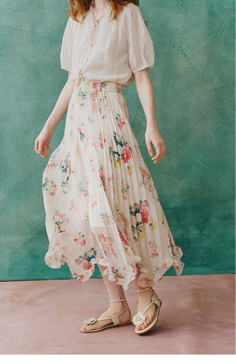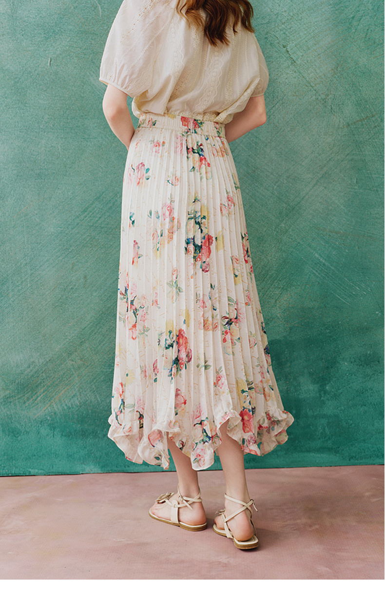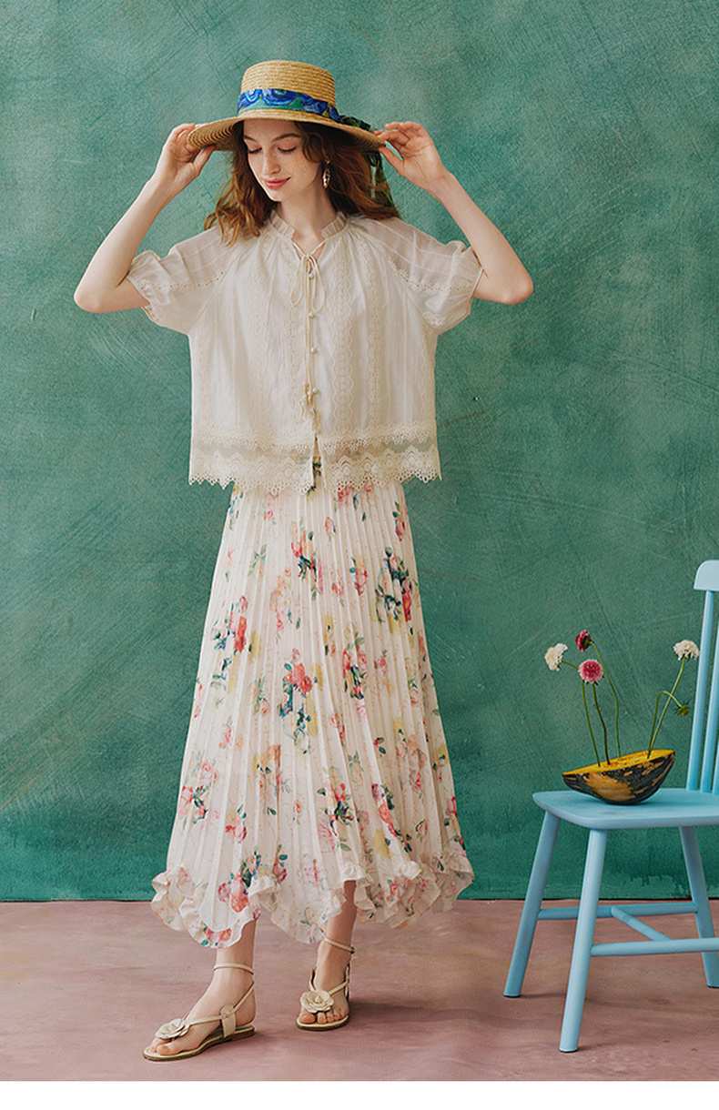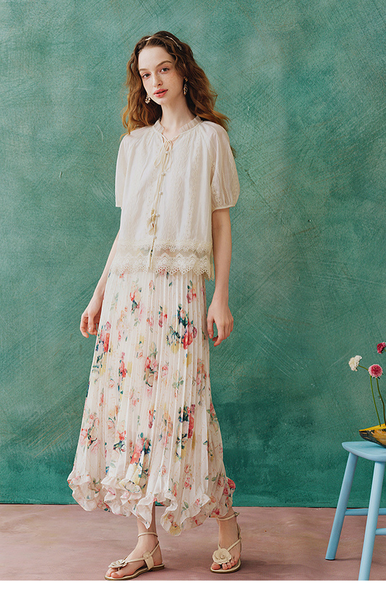 两三事馥香流动2025夏季新款复古荷叶边裙摆印花百褶裙长款半身裙