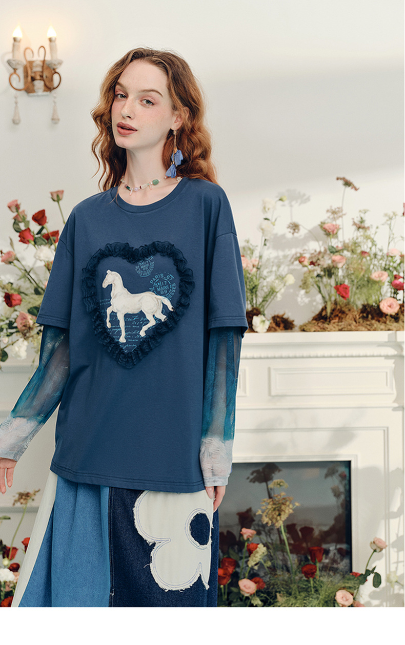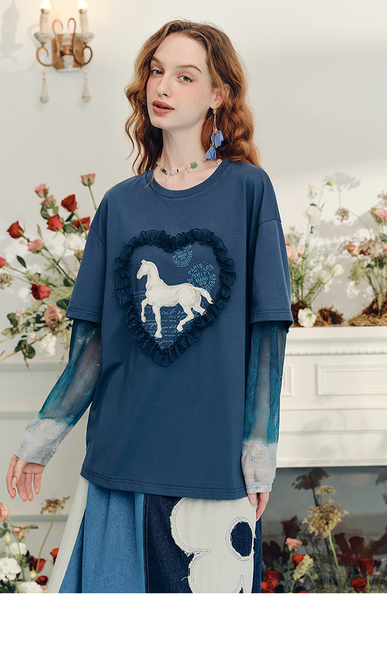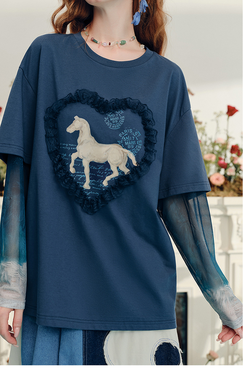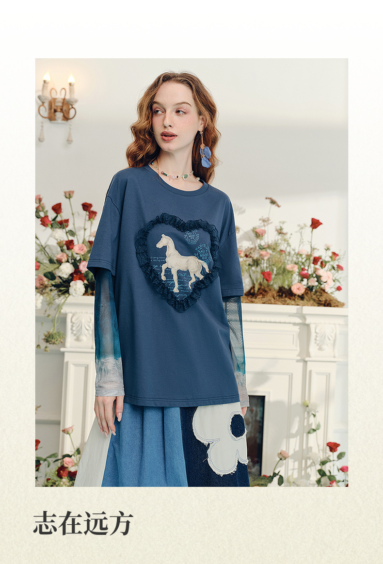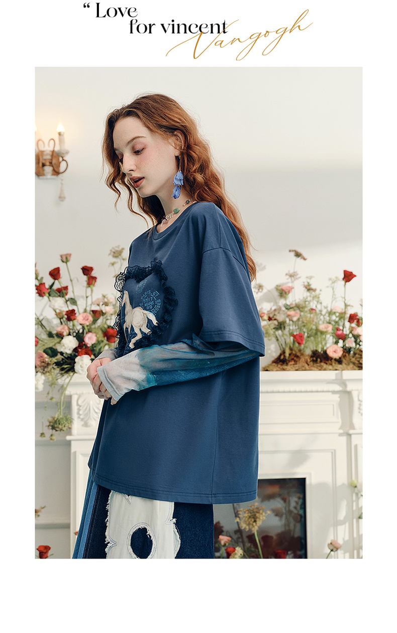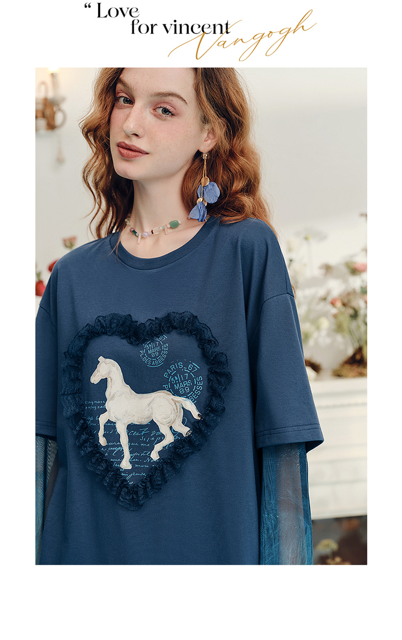 两三事梵高文艺志在远方2024夏新款立体心形动物印花假两件t恤女