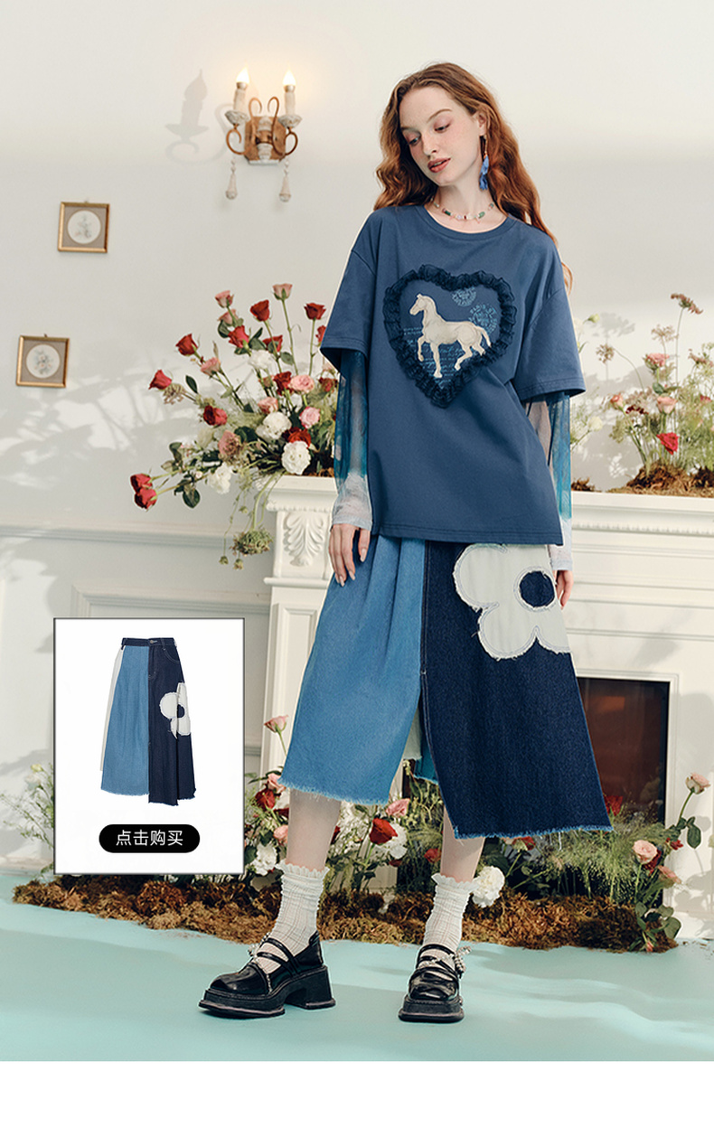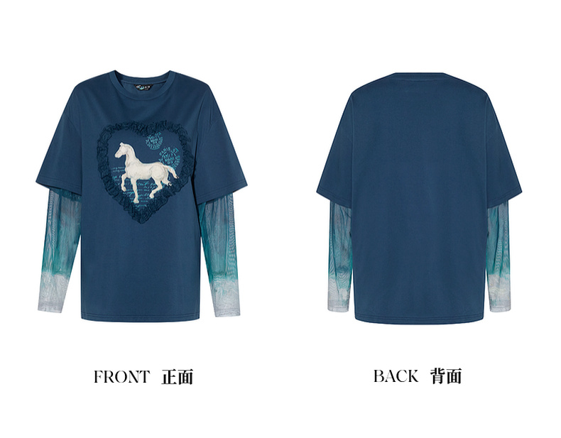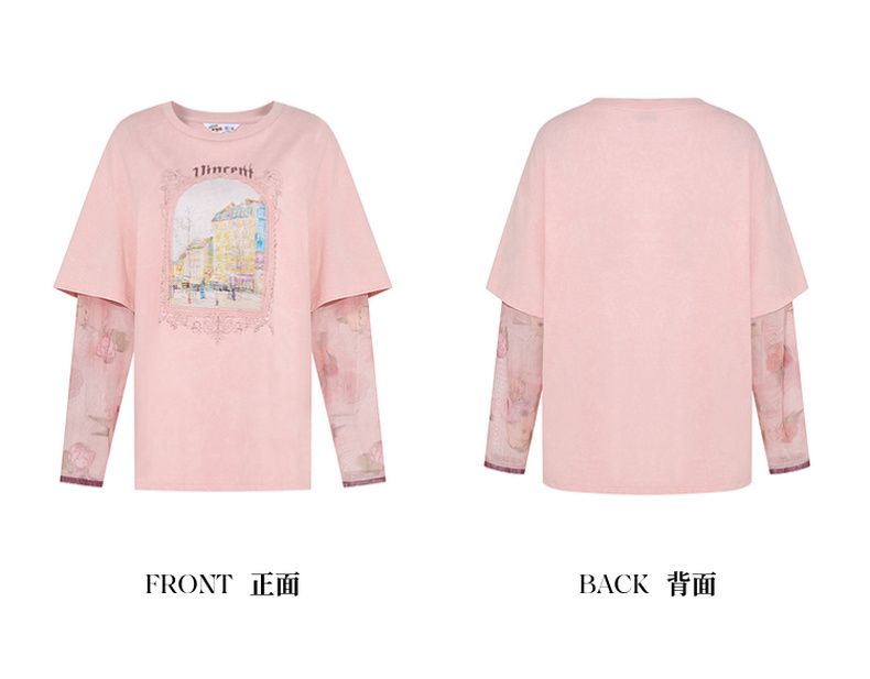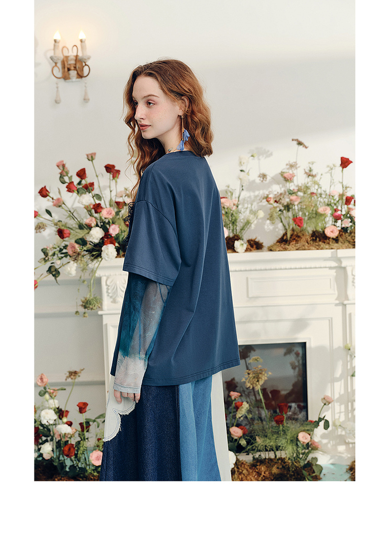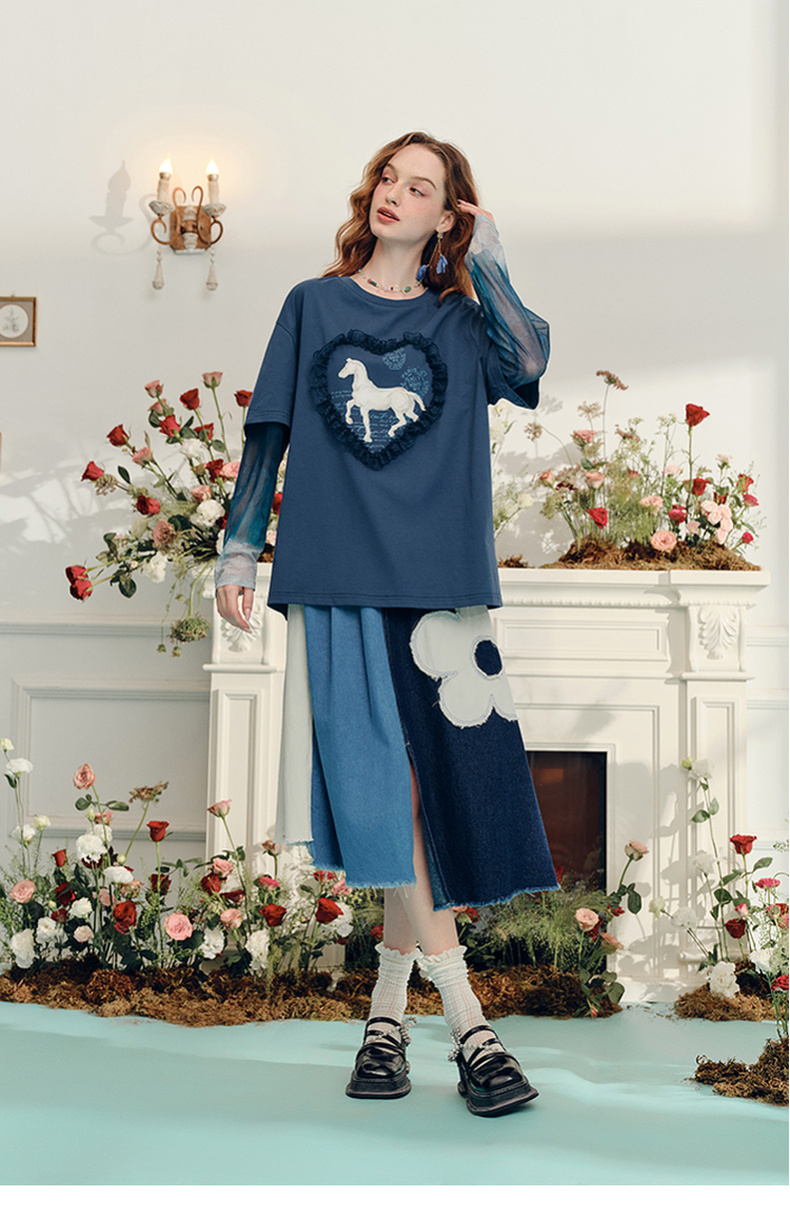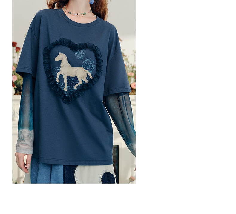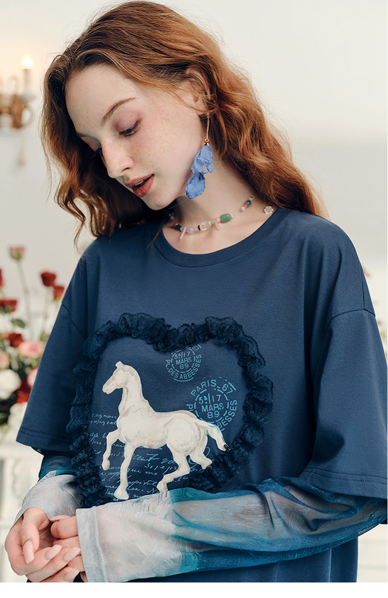 两三事梵高文艺志在远方2024夏新款立体心形动物印花假两件t恤女