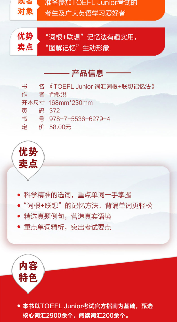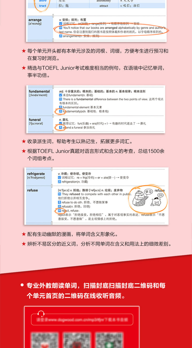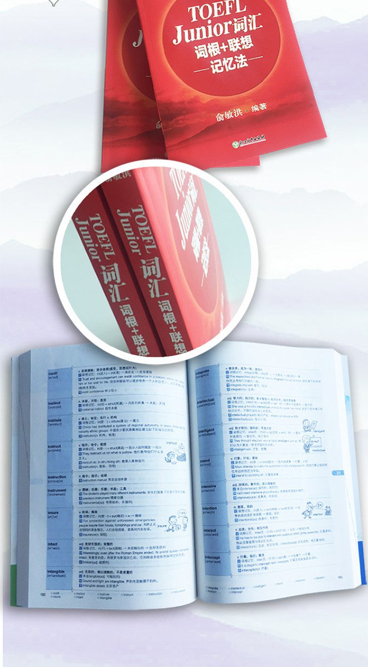 面对现在出国留学低龄化的趋势,越来越多的考生和家长开始重视TOEFL Junior。TOEFL Junior相比国内英语教学更重视语言的实用性,难度也比国内相应年级更高,对词汇量的要求非常大。不论是考虑考试成绩的要求,还是考虑到北美留学后的长远发展,扩展词汇量都将是考生不变的追求。为了帮助考生更好地准备TOEFL Junior考试,我们编写了《TOEFL Junior词汇词根+联想记忆法》一书,具体特色如下:
