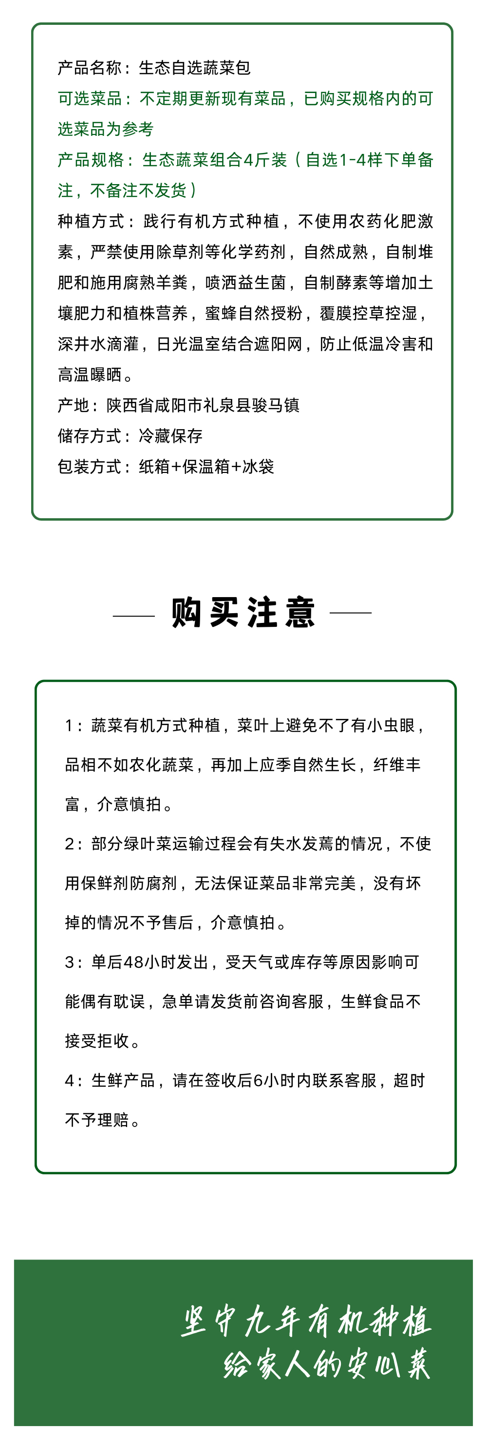 1、有机种植蔬菜,不用化肥农药,品相不佳,可能存在虫眼、斑痕等情况,介意勿拍