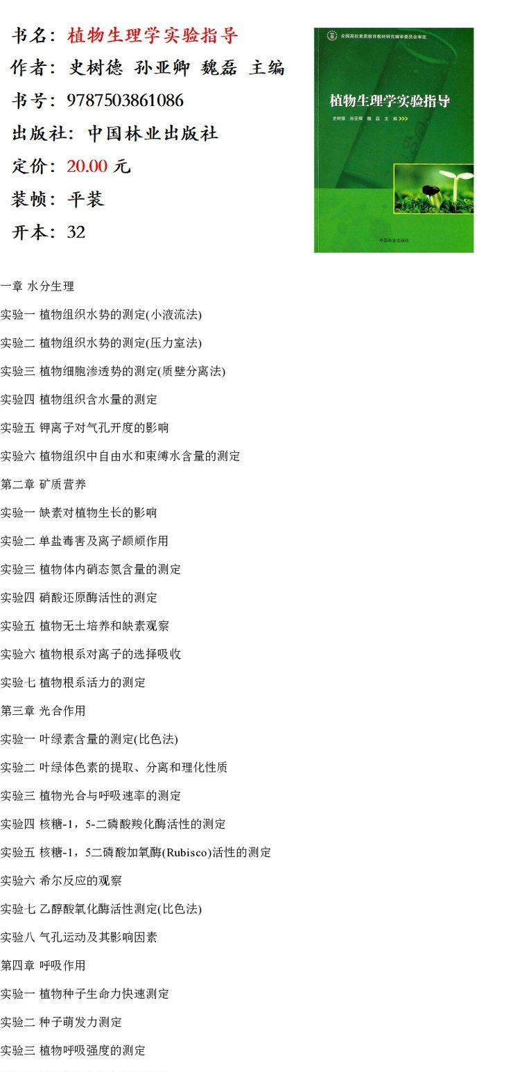 植物生理学实验指导 6108 史树德 中国林业出版社 畅销书