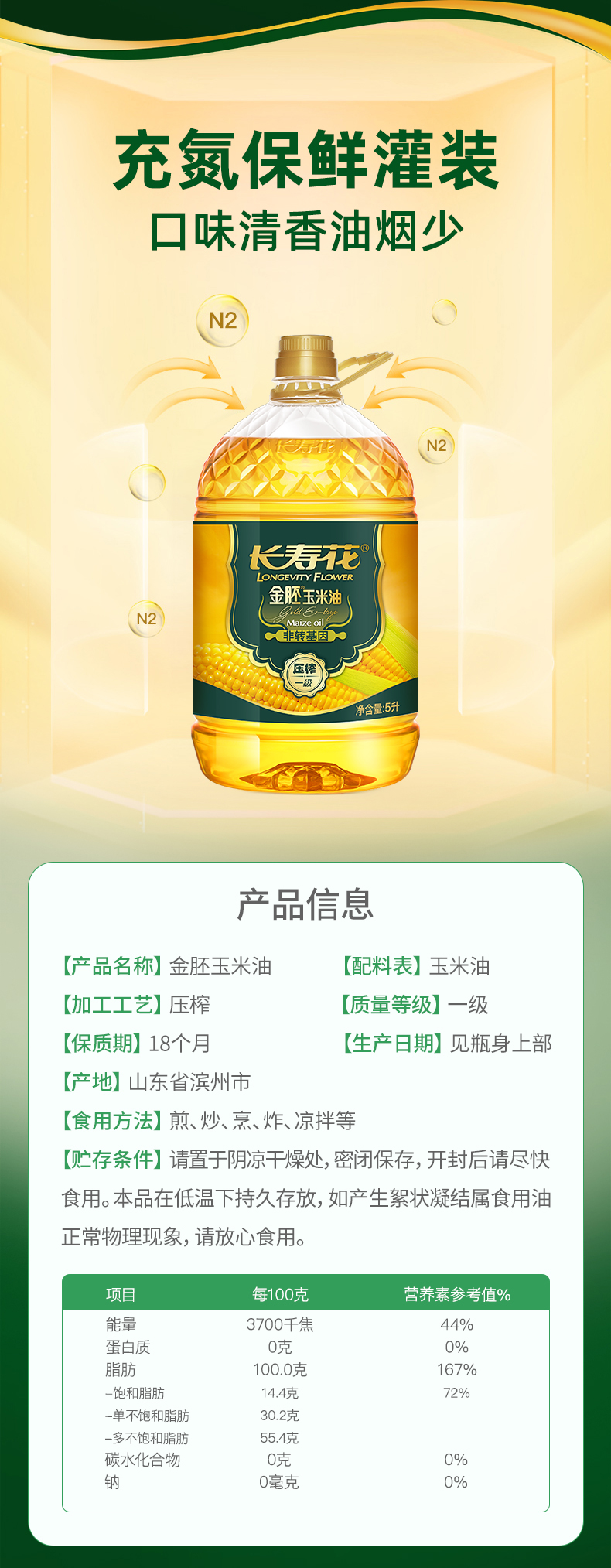 长寿花金胚玉米油5L桶装物理压榨充氮保鲜烘焙食用油