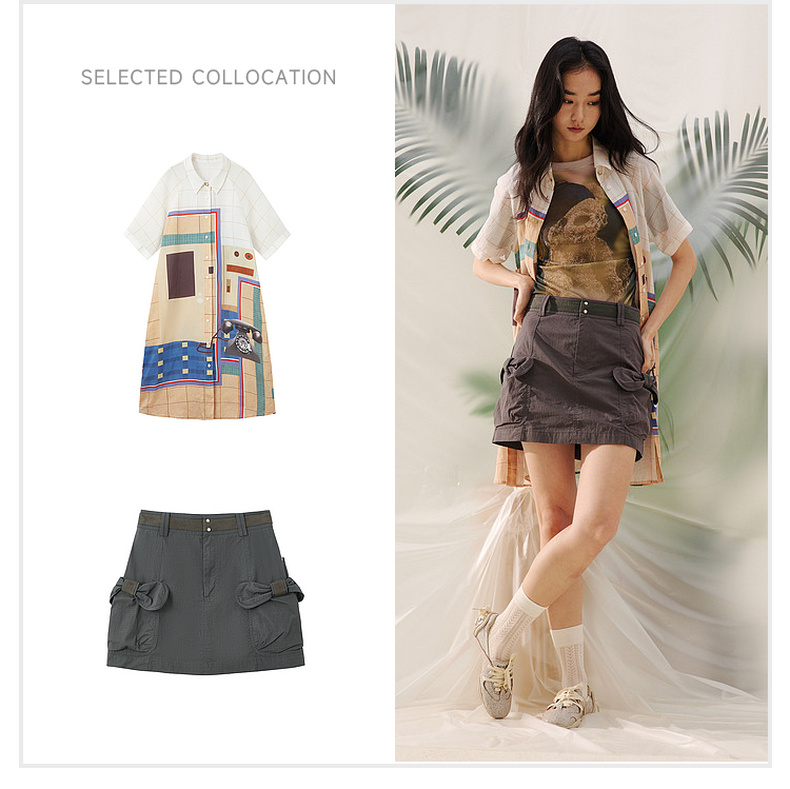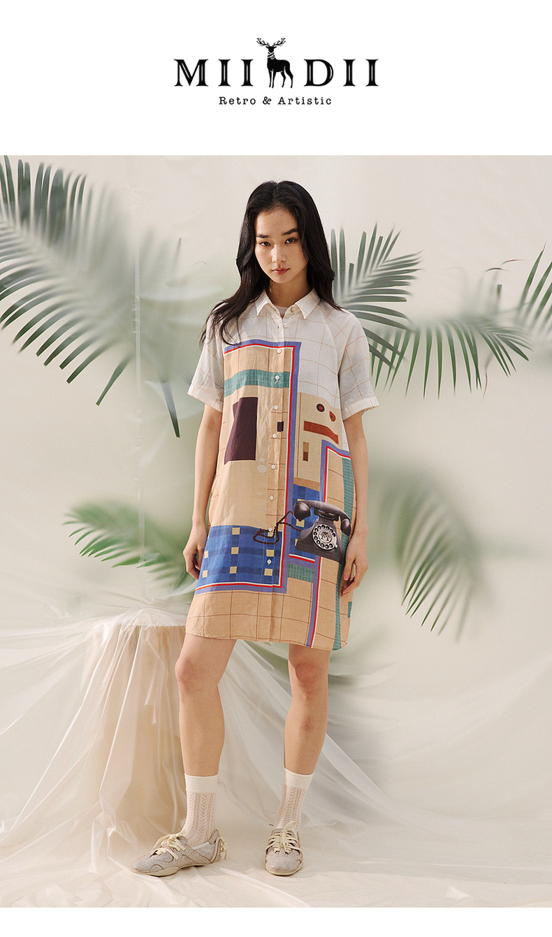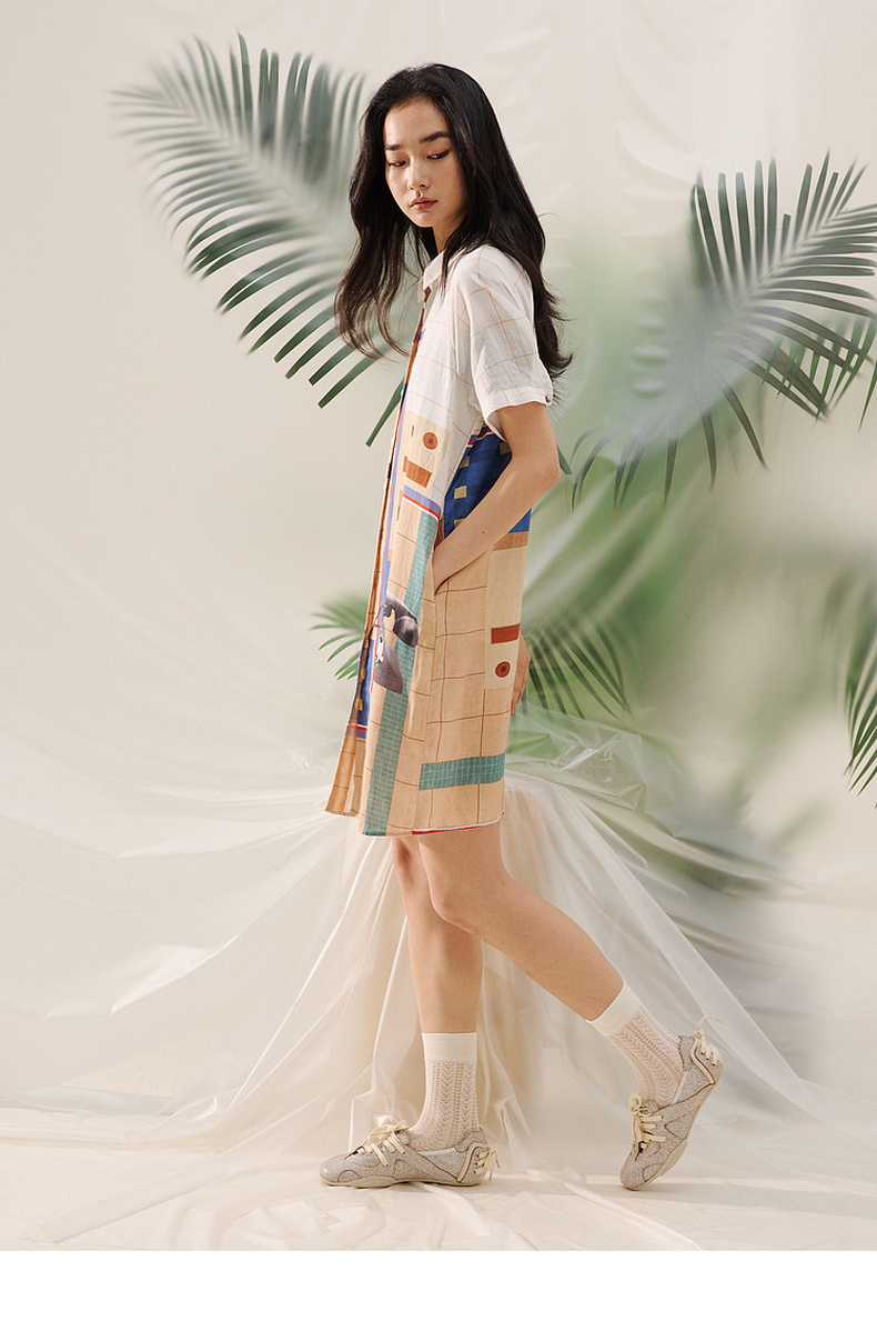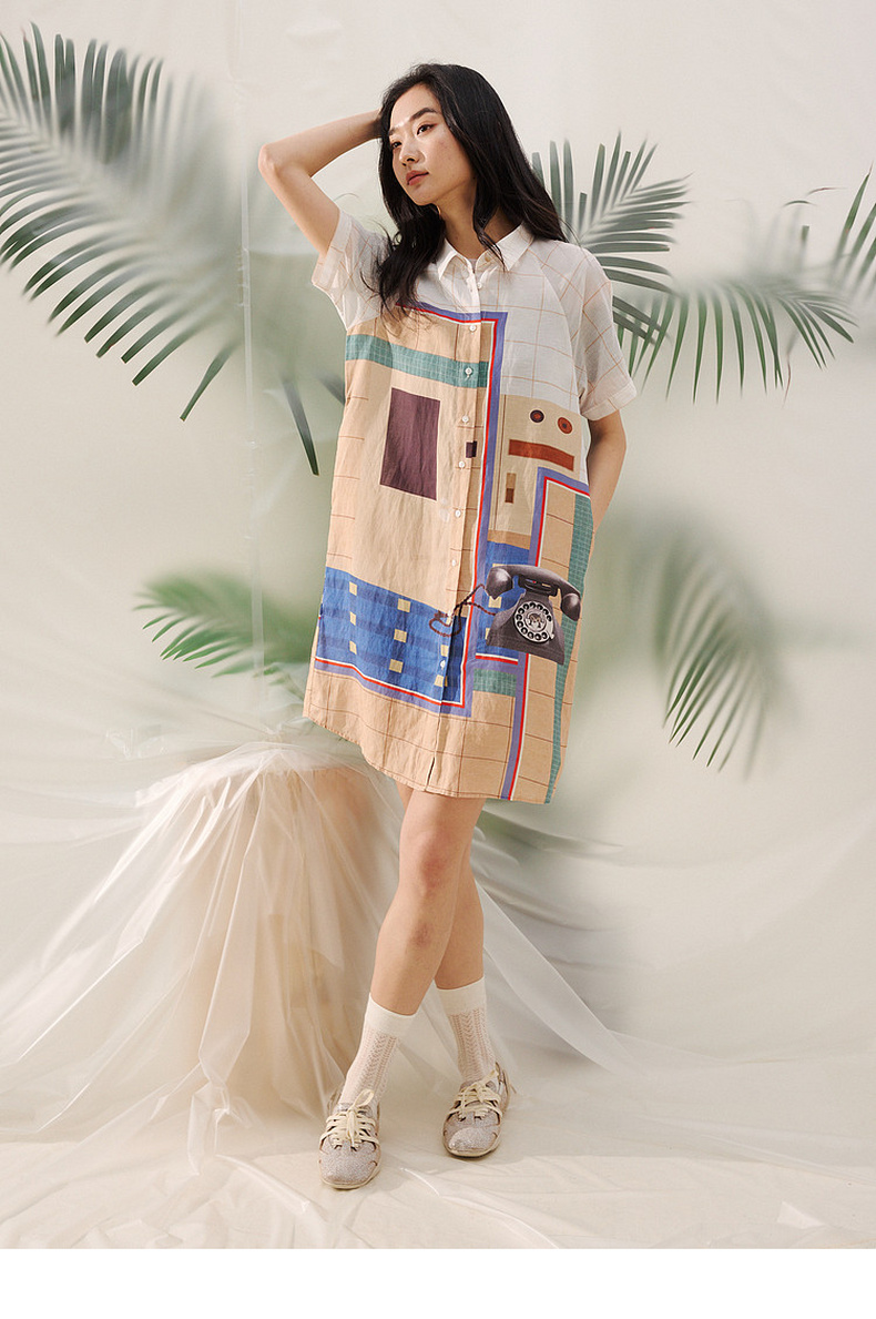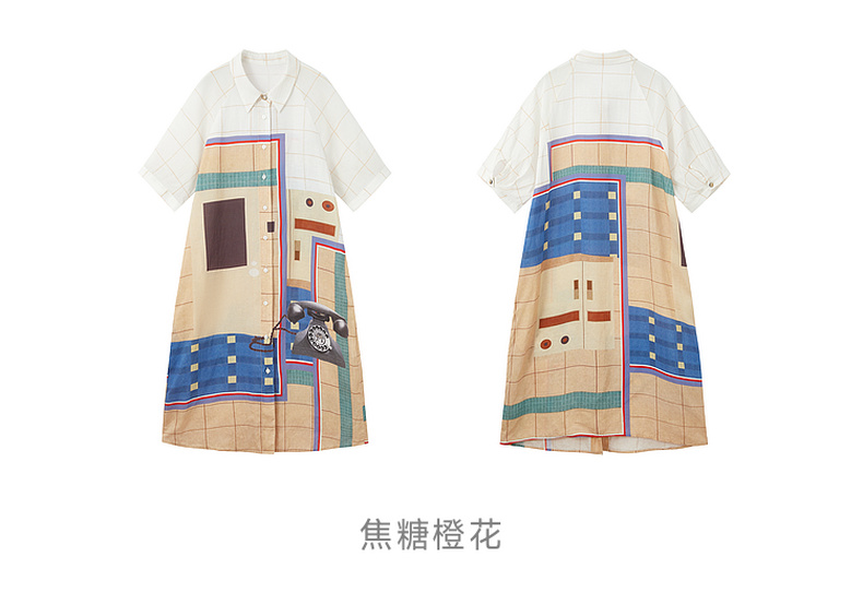 谜底艺术印花连衣裙短袖2026夏新品拼色百搭H型衬衫裙女262ML0642