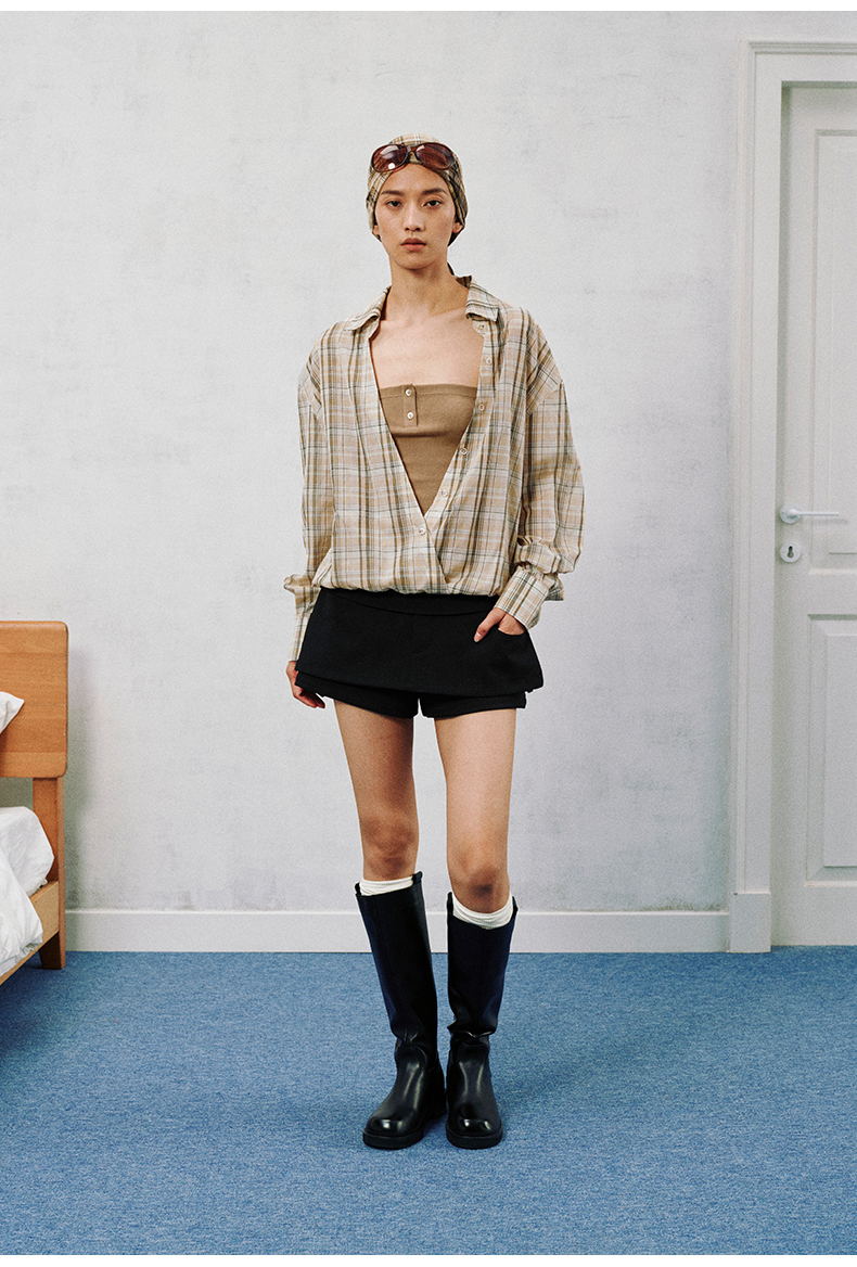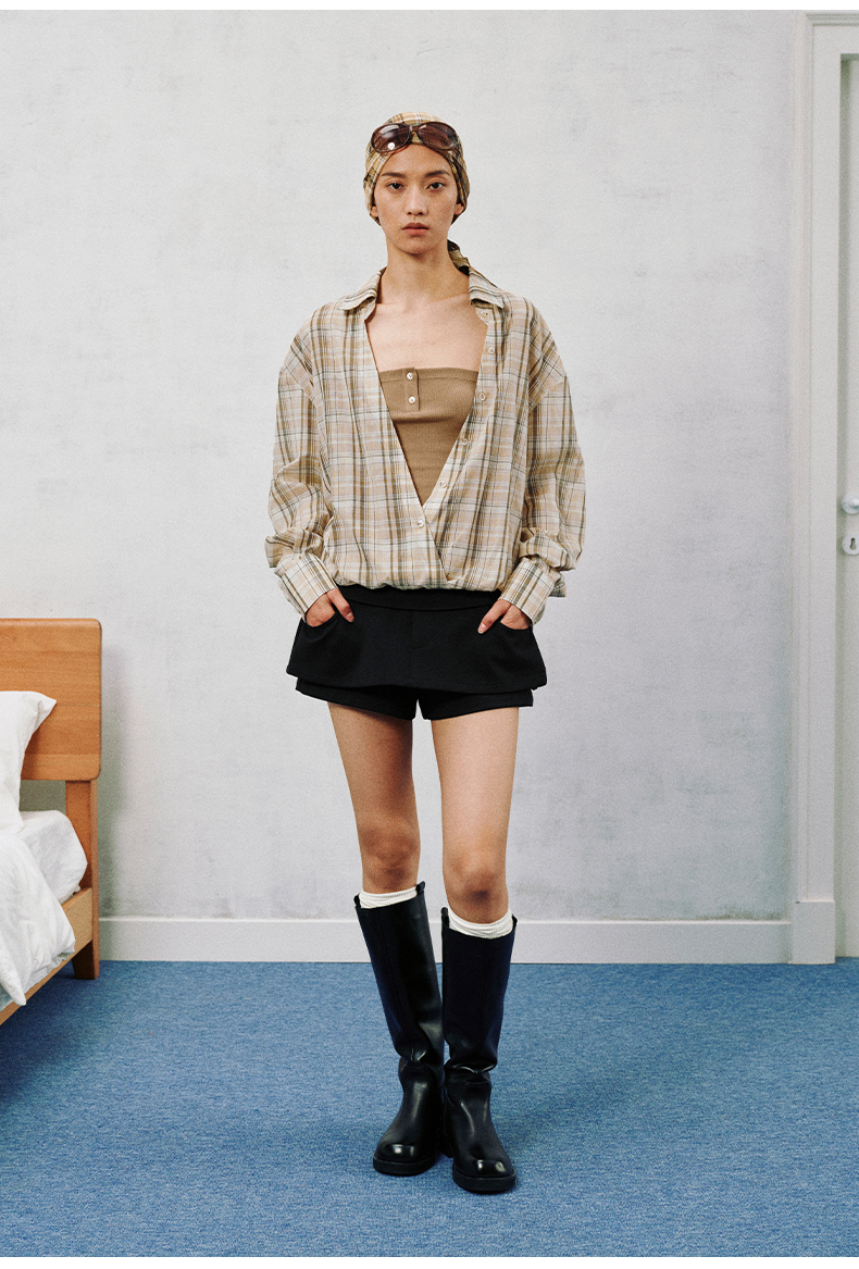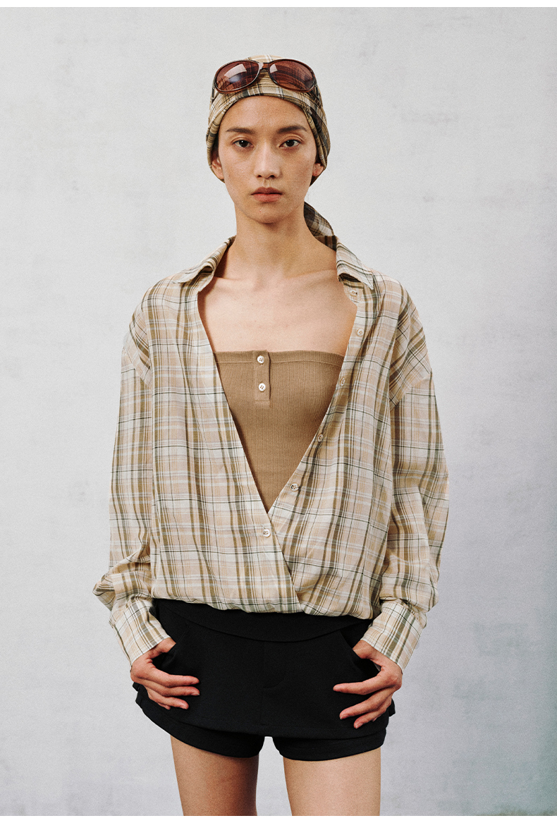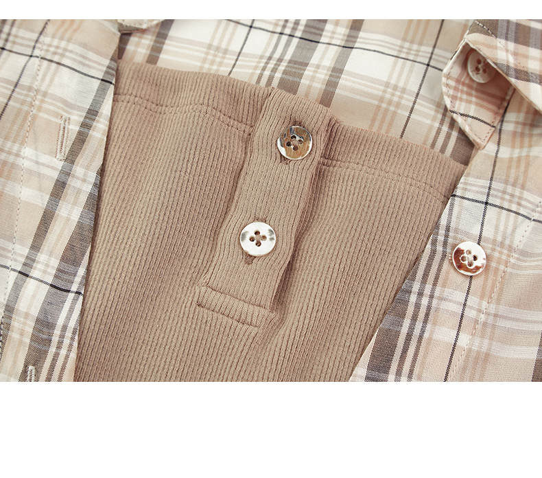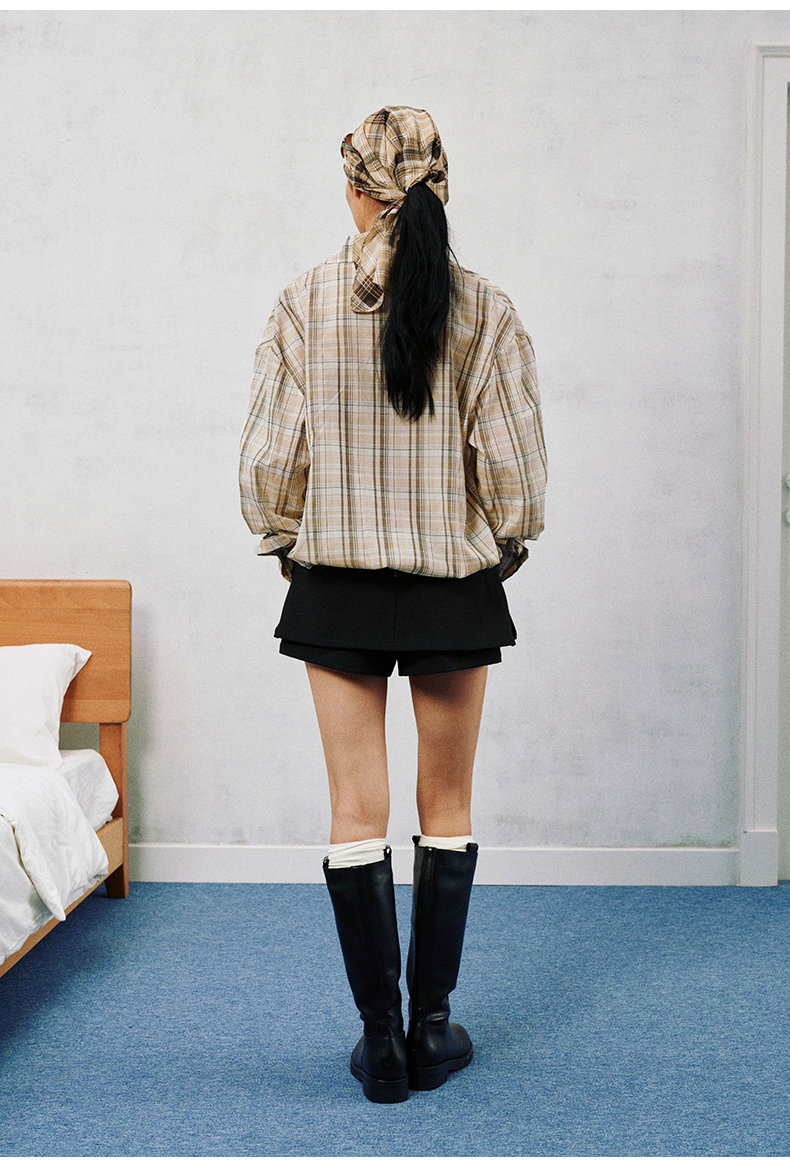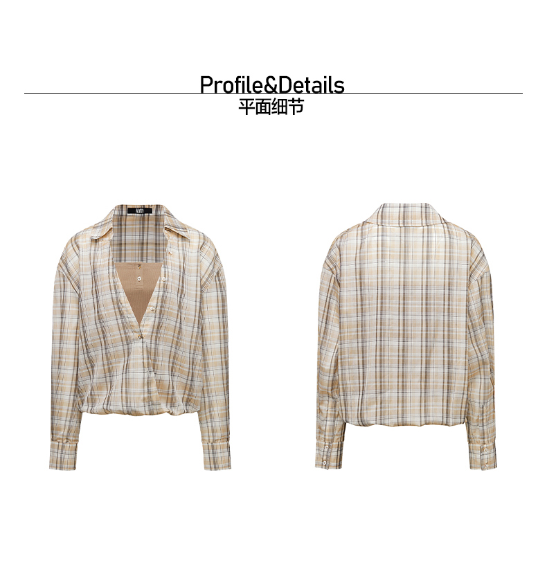 NUTH 复古拼接假两件格纹短款V领长袖衬衫外套女