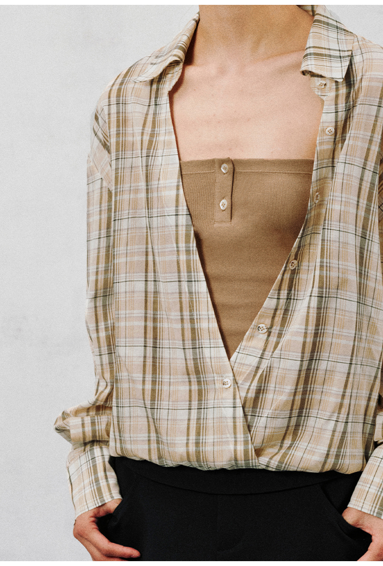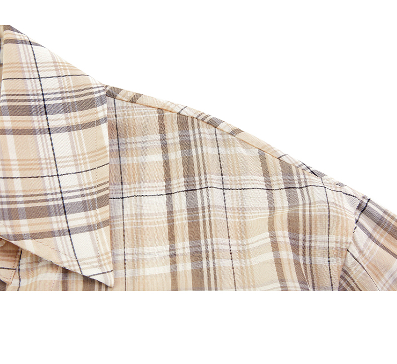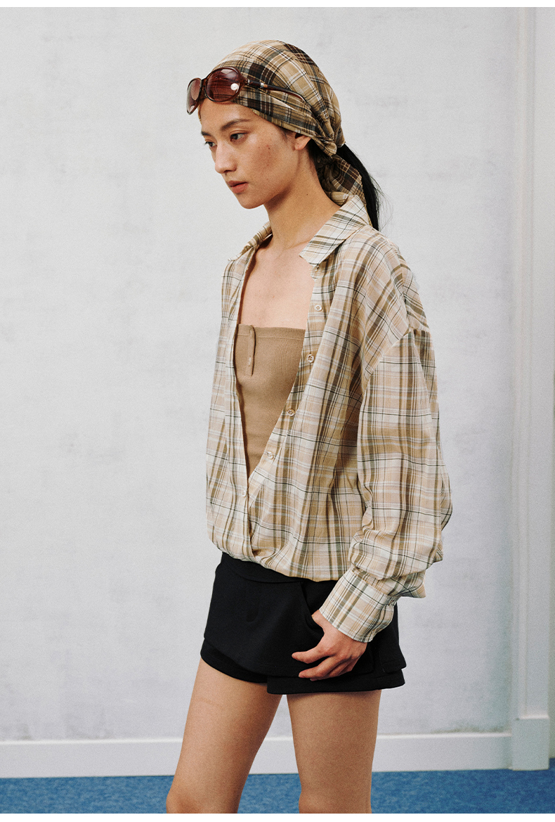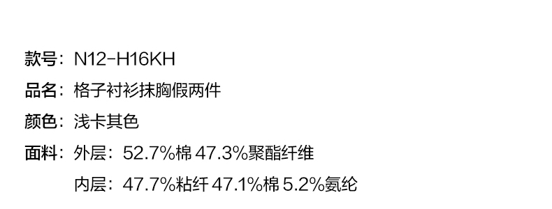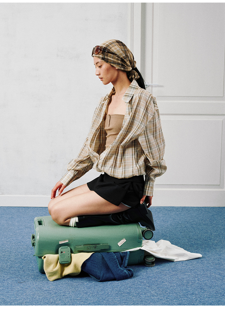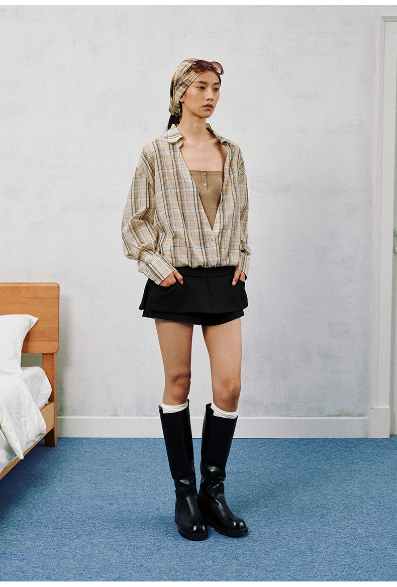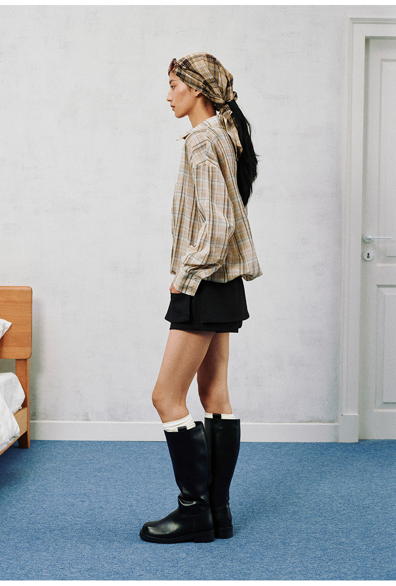 NUTH 复古拼接假两件格纹短款V领长袖衬衫外套女