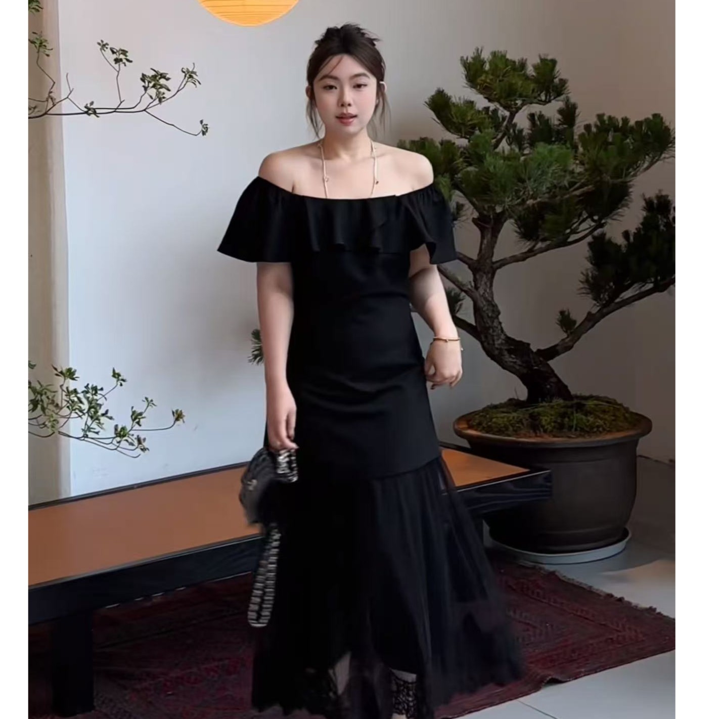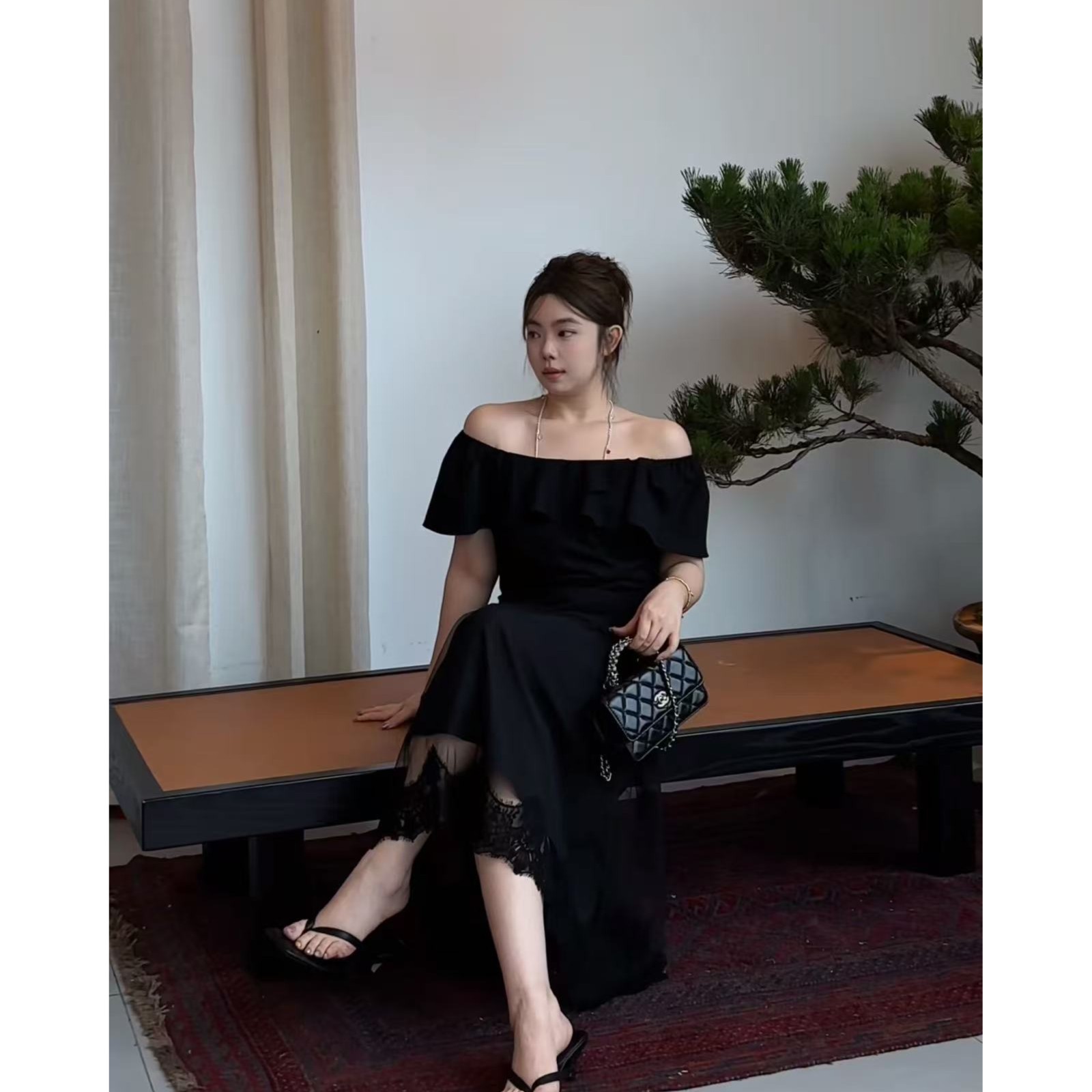 2025新品 软软同款【优雅代号】法式一字肩气质小众方领荷叶边假两件连衣裙