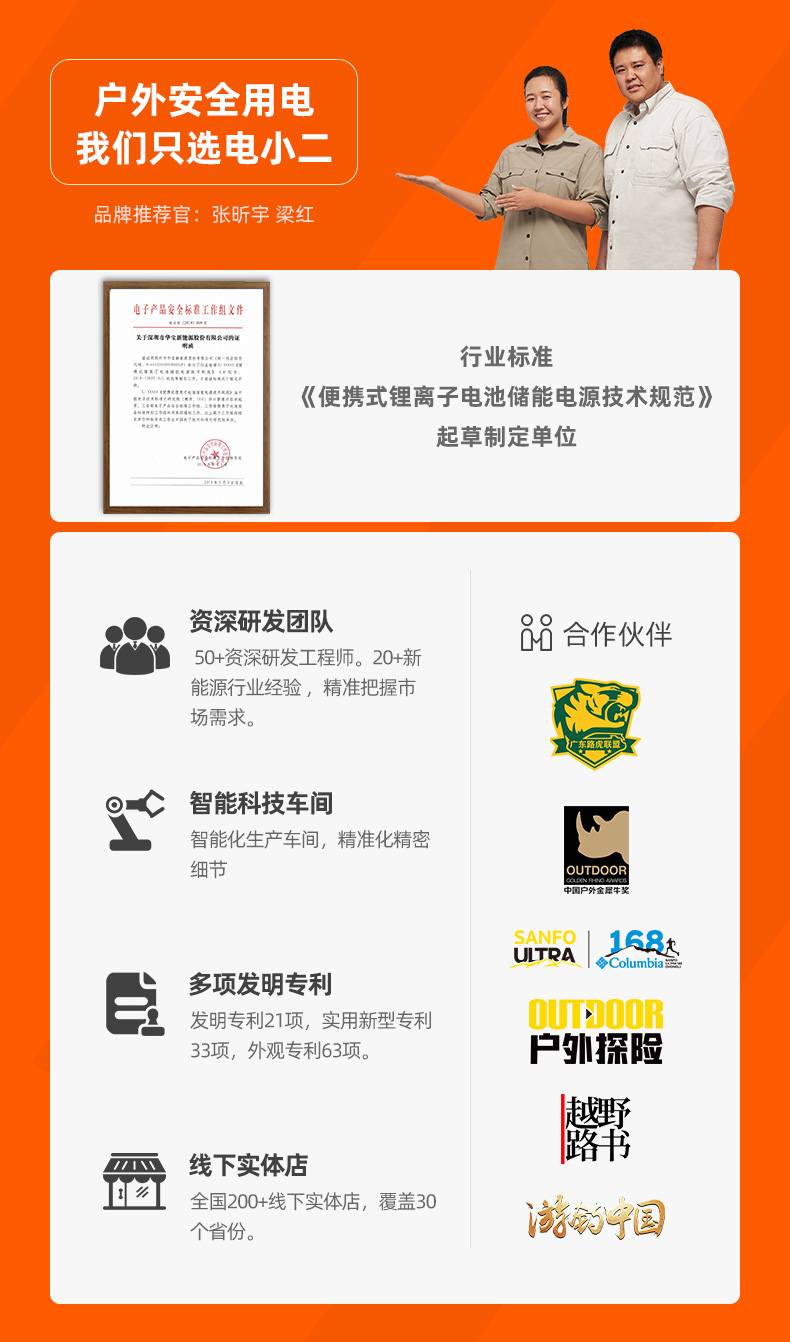 - 电小二户外电源是光充户外电源领导品牌,便携储能行业起草单位之一,致力于提供可持续便携绿色能源解决方案。
