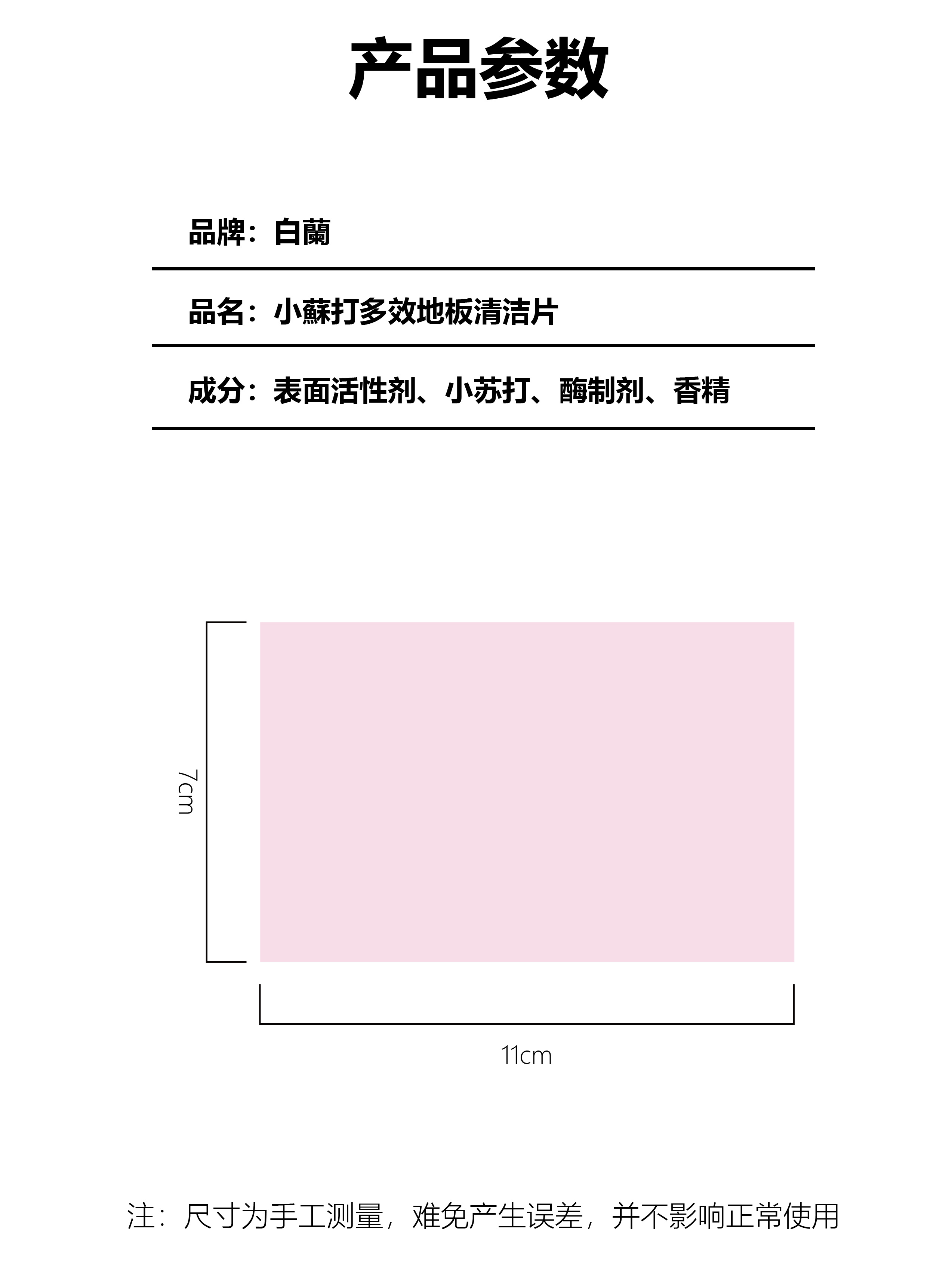 白蘭小苏打多效地板清洁片 产地:中国 净含量:30片/袋*4 保质期:3年 用途:瓷砖、木地板、浴室洁具、木质家具等都适用 使用说明:取片溶入水中使用,根据需要清洁地板面积,以及干净程度放入适量的清洁片(建议3升水放入一片) 注意事项: 1、本品具有较强吸水性,务必密封储存; 2、请置于阴凉干燥处保存,远离儿童及宠物存放; 3、本品为外用清洁品,请勿作他用; 4、如不慎入眼,情用清水冲洗,若仍有不适,请及时就医; 【发货快递】:圆通、申通、极兔(随机发) 【不发地区】:港澳台、新疆、西藏及疫情区域不发货 【加运费地区】:北京、上海+1元/件 (截单后3天内发货,疫情管控地区以实际出单为准,不能发货地区则会取消订单,敬请谅解!) 【注意事项】: 1、非食品,请勿食用,如误服,请携带本品包装立即就医 2、请勿接触眼睛,若不慎入眼,请大量清水冲洗并立即就医 3、置于阴凉干燥处存放,注意存放在儿童宠物接触不到的地方 4、本品具有较强吸水性,务必密封储存。 5、本品为外用清洁品,请勿作他用。使用时,不建议手湿拿取 【注明】:拒收、拦截、改地址,快递需扣除相关费用,如产品有问题请在签收24小时之内,带快递面单产品图片报售后处理,超时不予处理望谅解