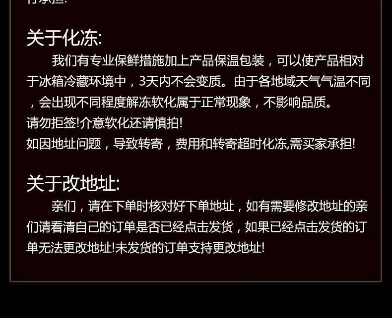 2.收到后如有质量问题12小时之内带面单+产品照片联系客服进行赔付或者补发!如超过12小时后或没有拍照的,均由买家自行承担!生鲜产品不支持7天无理由,如因拒签引起的品质题,买家自行承担!