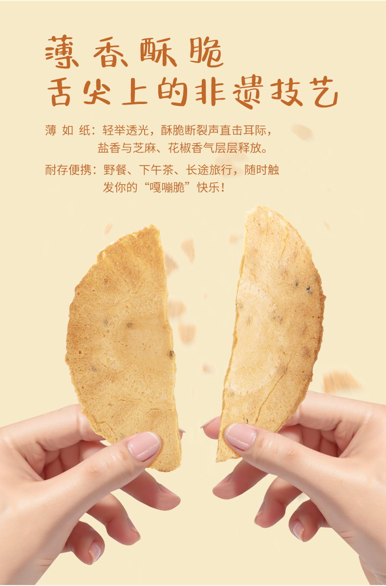 3、全麦薄饼全新升级,酥脆到灵魂出窍!一片薄饼,麻香四溢,酥脆到让你忍不住“咔嚓咔嚓”停不下来!新配方麻椒加持,香味更浓郁,口感更上头!0添加,全生态原料,非油炸,不腻口,麦香浓郁,吃得健康,嚼得过瘾!轻薄酥脆椒香够味。