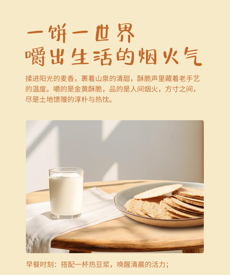 休憩时抽出一片咬下,薄脆的饼身应声绽开,齿间迸发的谷物焦香携着口舌生津,一瞬间仿佛回到了和外婆一起在老屋的日子。这时才惊觉,原来让人安心的从不是食物本身,是那些被自然味道所激发的,被阳光晒得蓬松的记忆,此刻正在山风中悄然舒展。