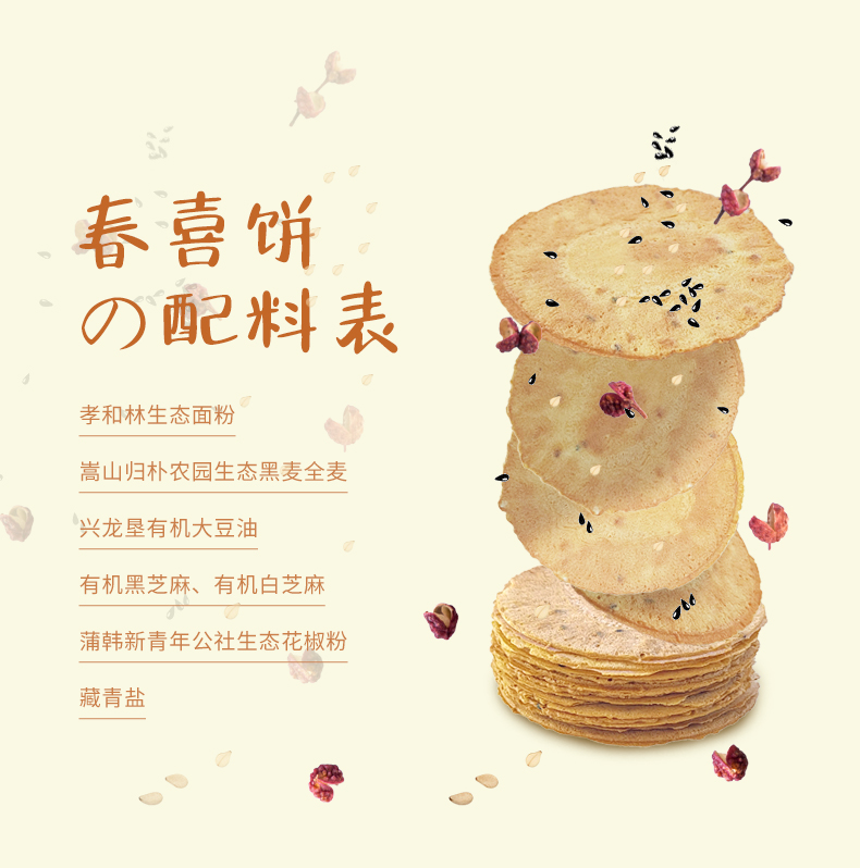 2、这款生态薄饼,配料表里只有生态有机食材,0添加的纯粹一目了然。明火烘烤,非油炸工艺,少油少糖少盐,健康无负担。咬上一口,“咔咔”作响,酥脆在齿间蔓延。不管是老人、大人还是小孩,都能放心吃、安心享,在美味中收获满满快乐!