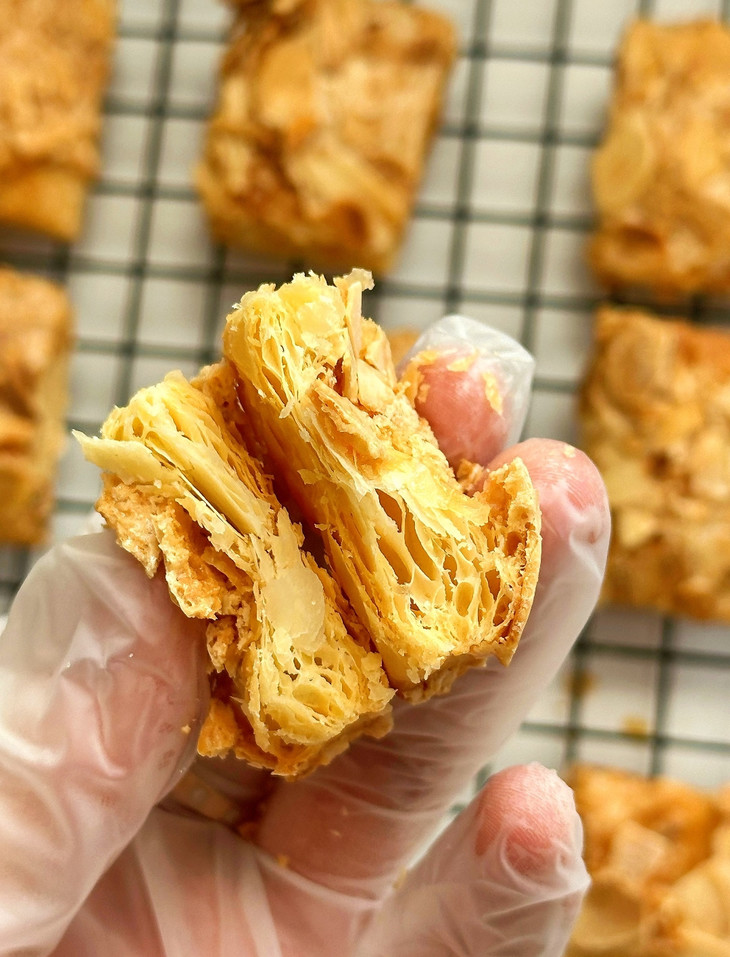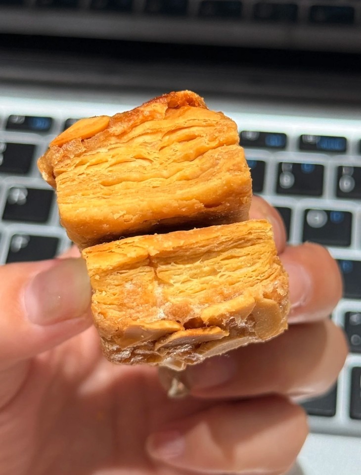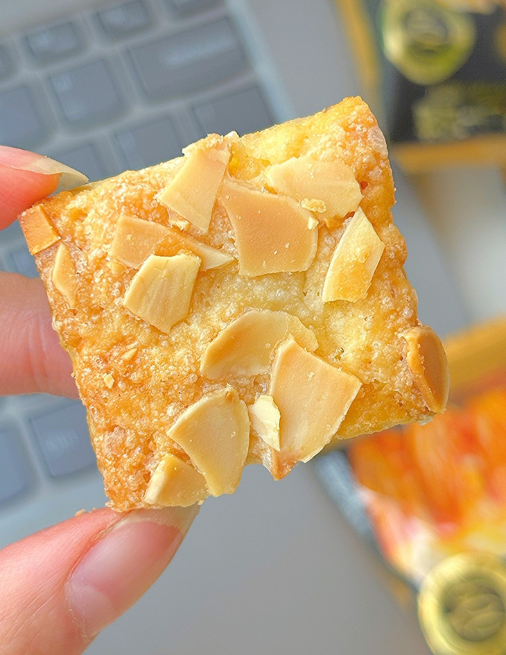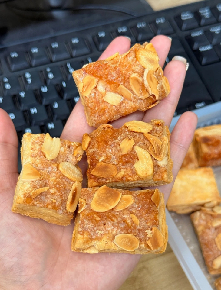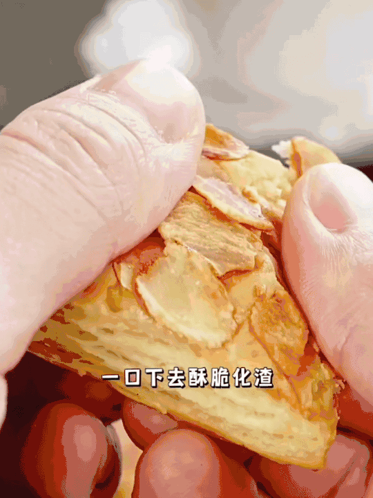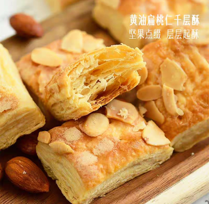救命宝子们🆘 这个扁桃仁千层酥也太绝了吧!! 刚拆开包装就被香晕了谁懂啊!! 表面的扁桃仁颗颗饱满,烤得油亮亮的😋 凑近闻全是坚果香混着黄油香 口水直接忍不住了… 咬一口直接“咔嚓”一声 酥皮真的薄到像纸片! 层层叠叠的酥到掉渣 舌头一抿就化在嘴里 完全不粘牙!扁桃仁嚼起来脆香脆香的🤣🤣 带点微微的甜,和酥皮的黄油味搭在一起, 越吃越上头!!! 香到天灵盖都在放烟花🎇