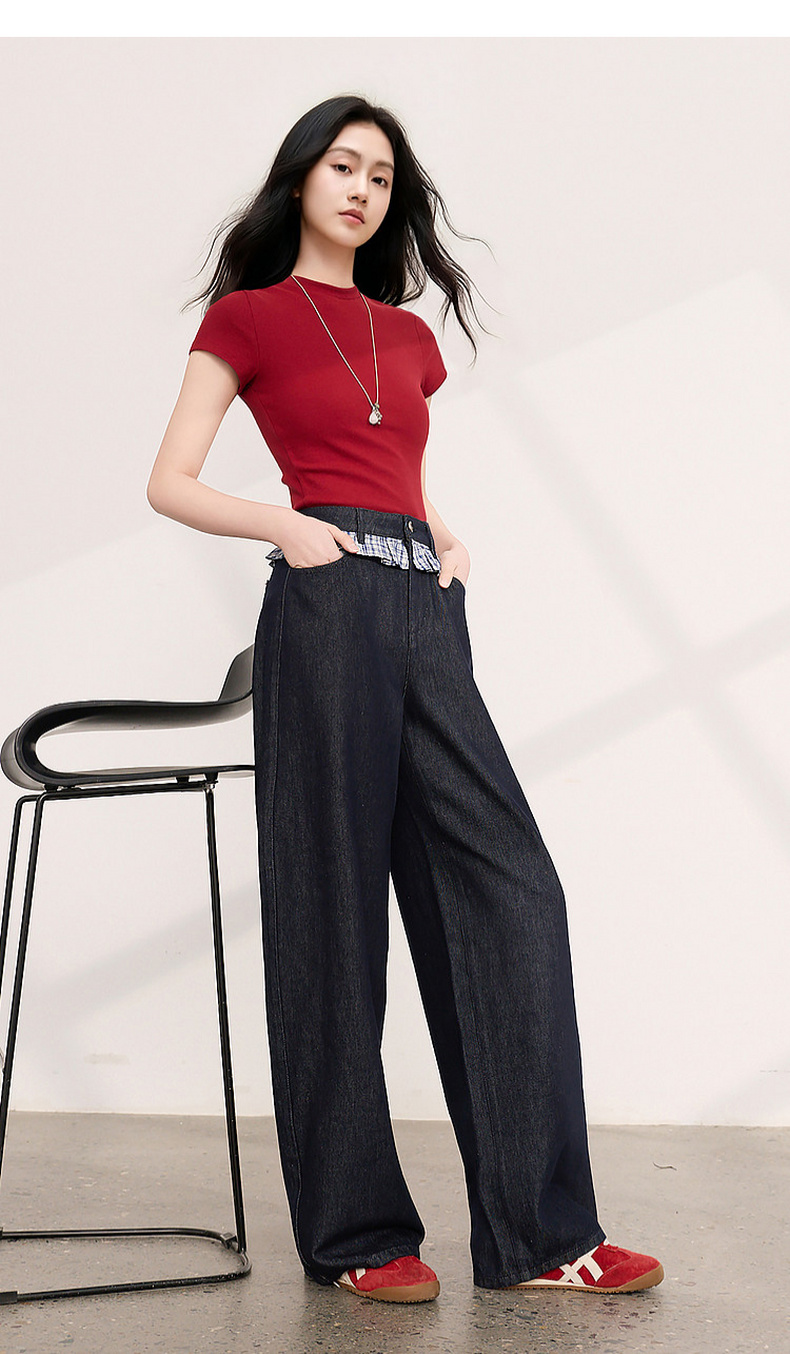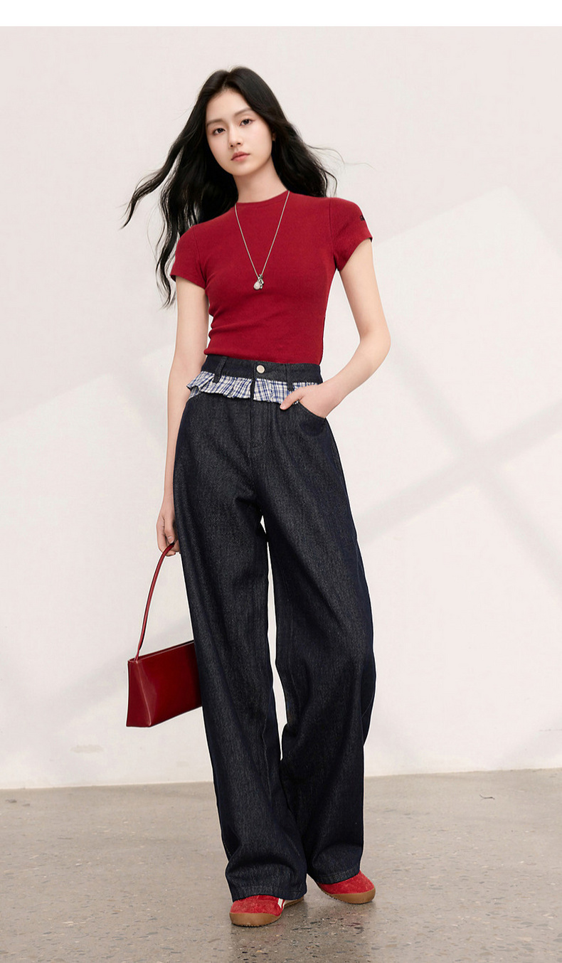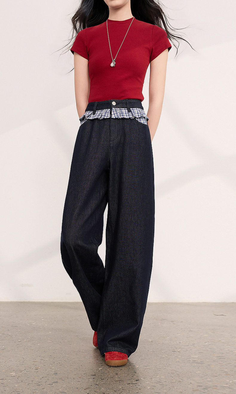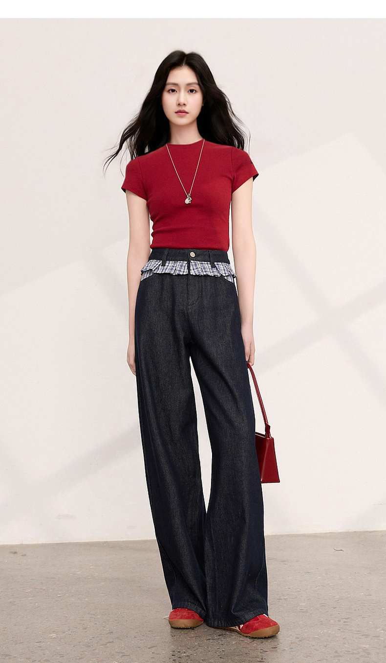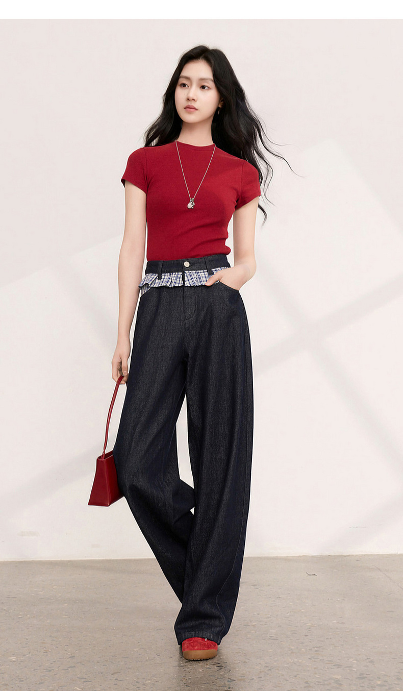 三彩2026夏季新款拼接牛仔裤设计感宽松阔腿长裤时尚M