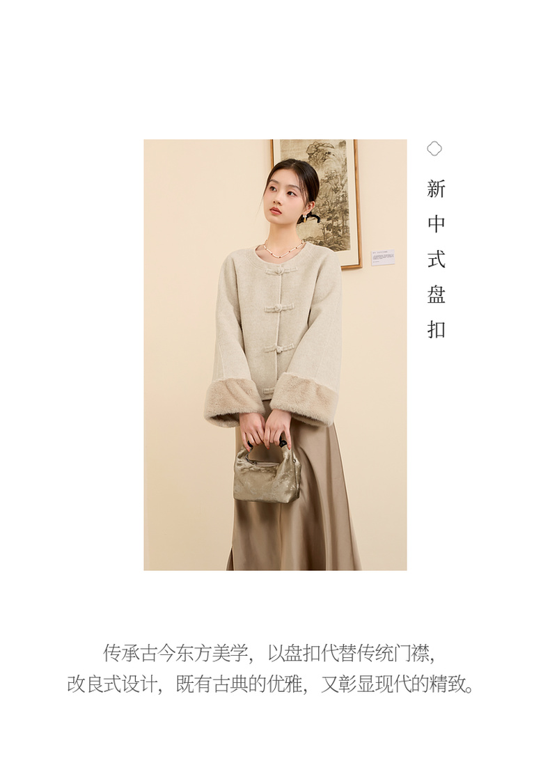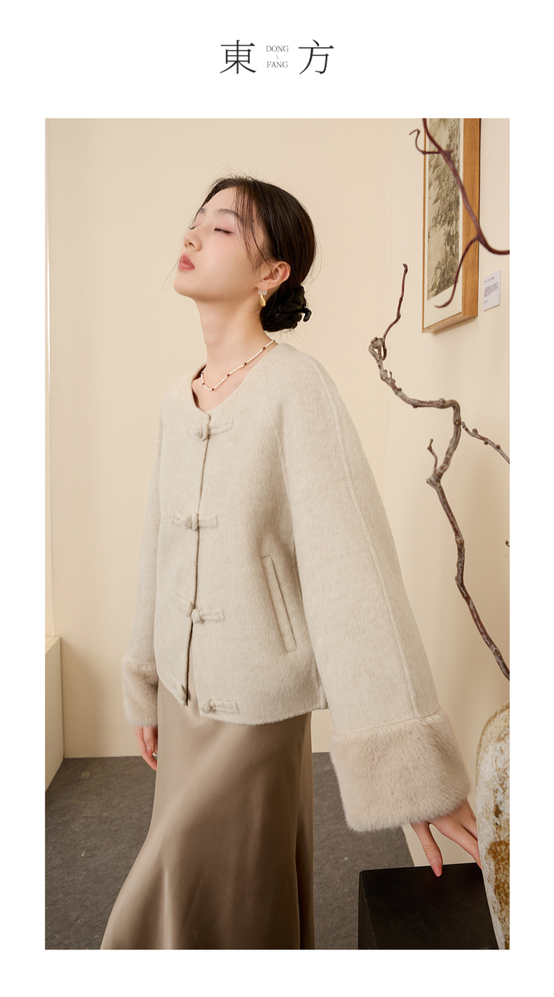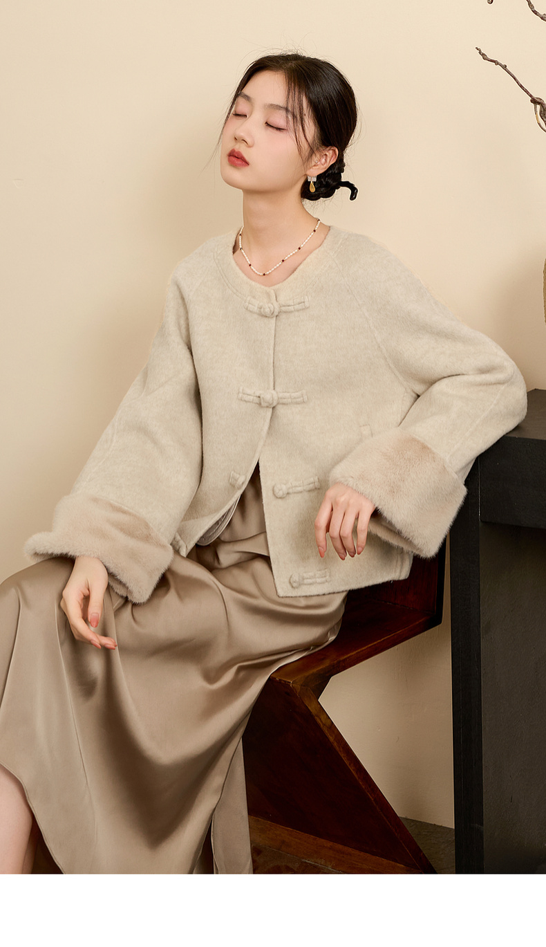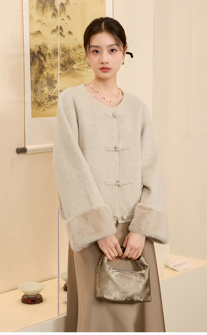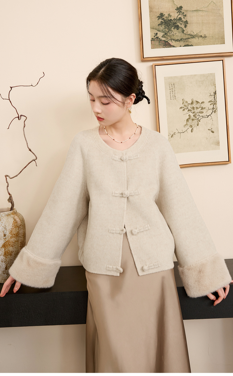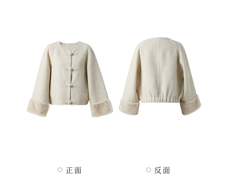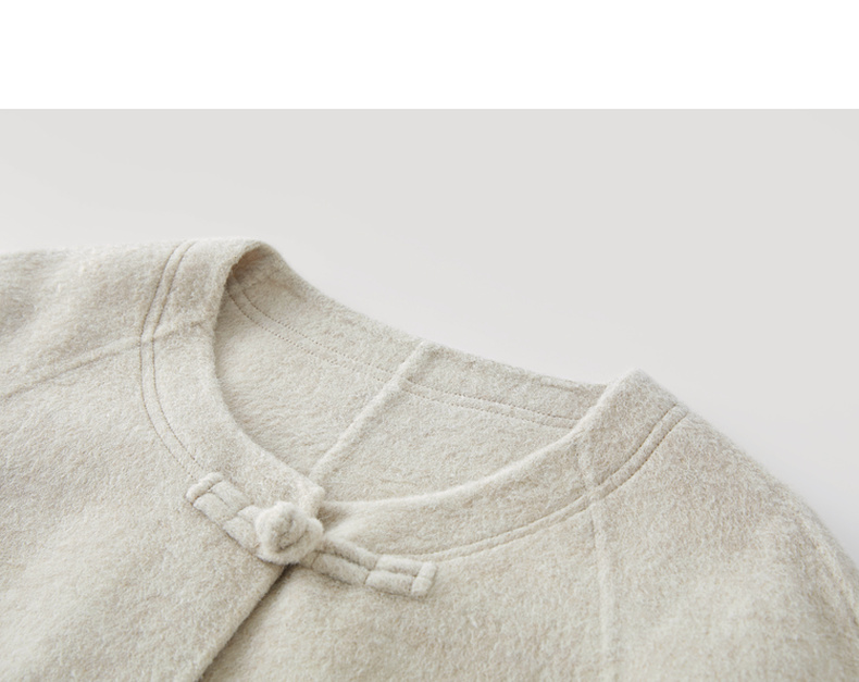 三彩【月烟如梦】2024冬季新款新中式双面呢大衣短款圆领盘扣毛呢C