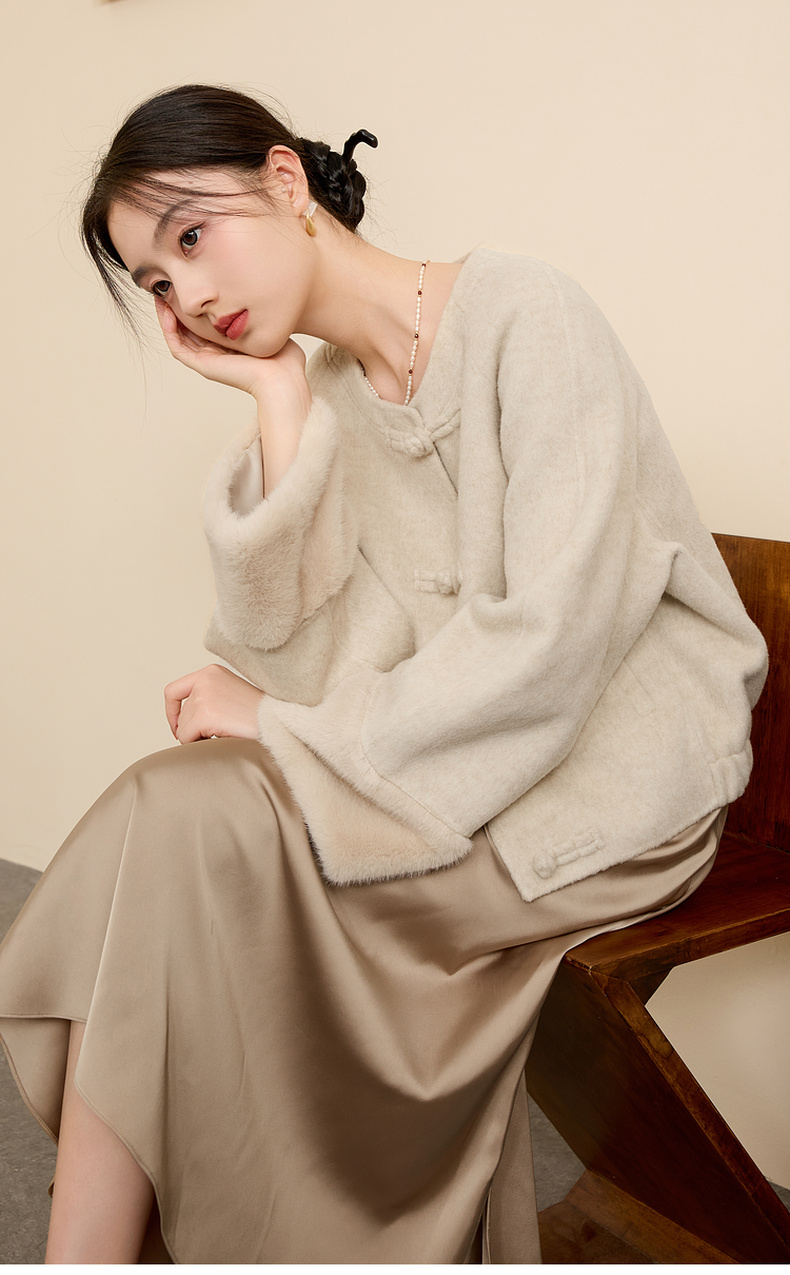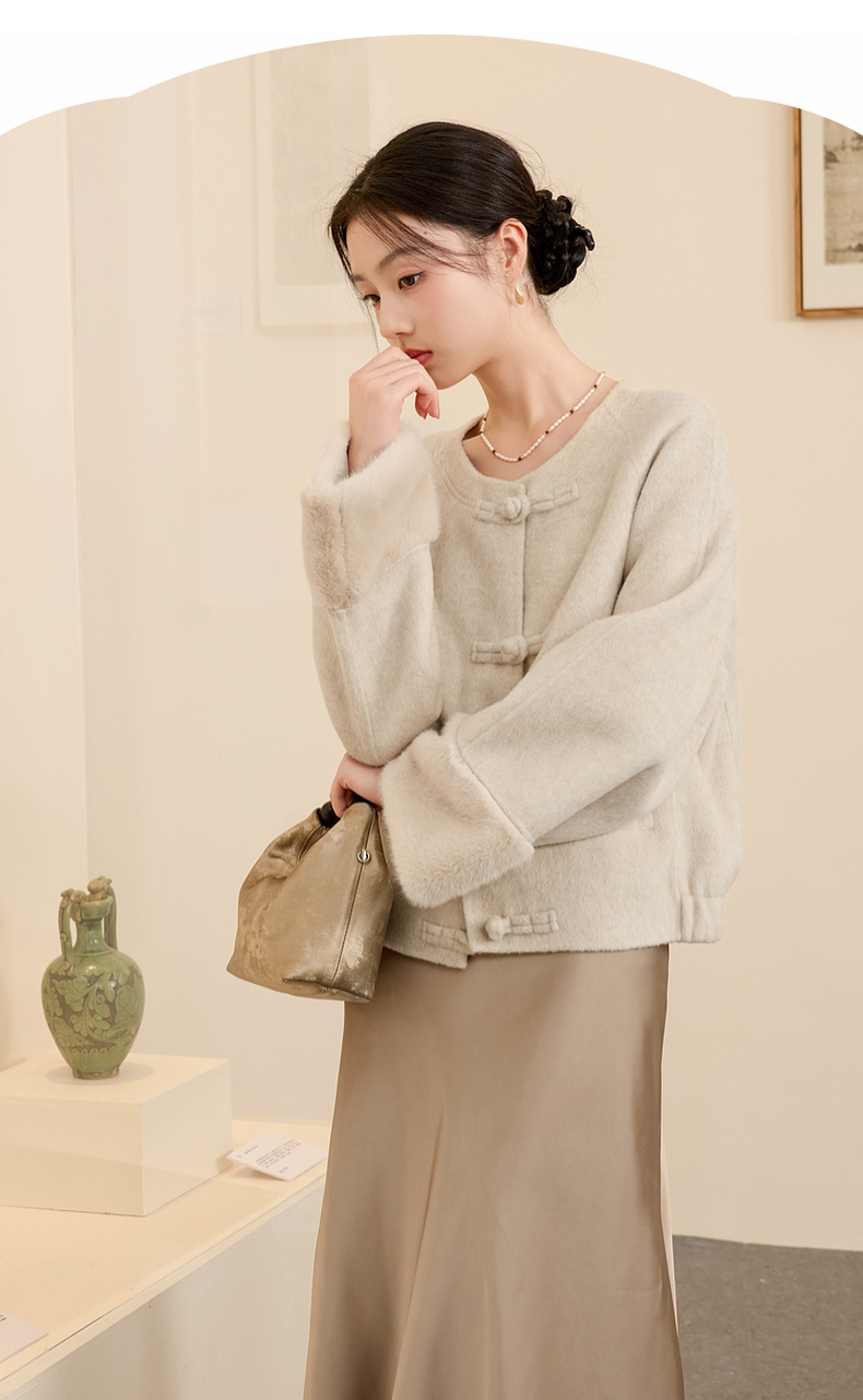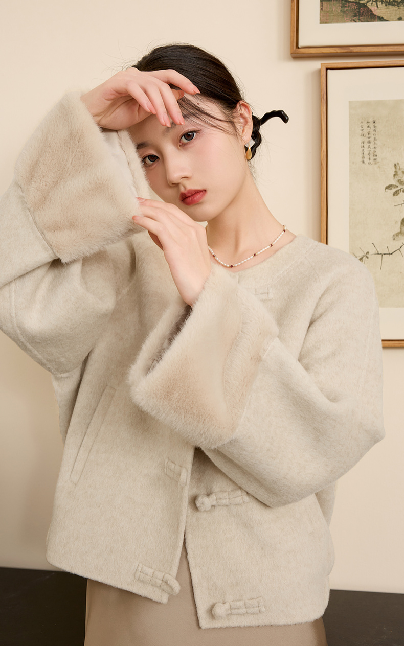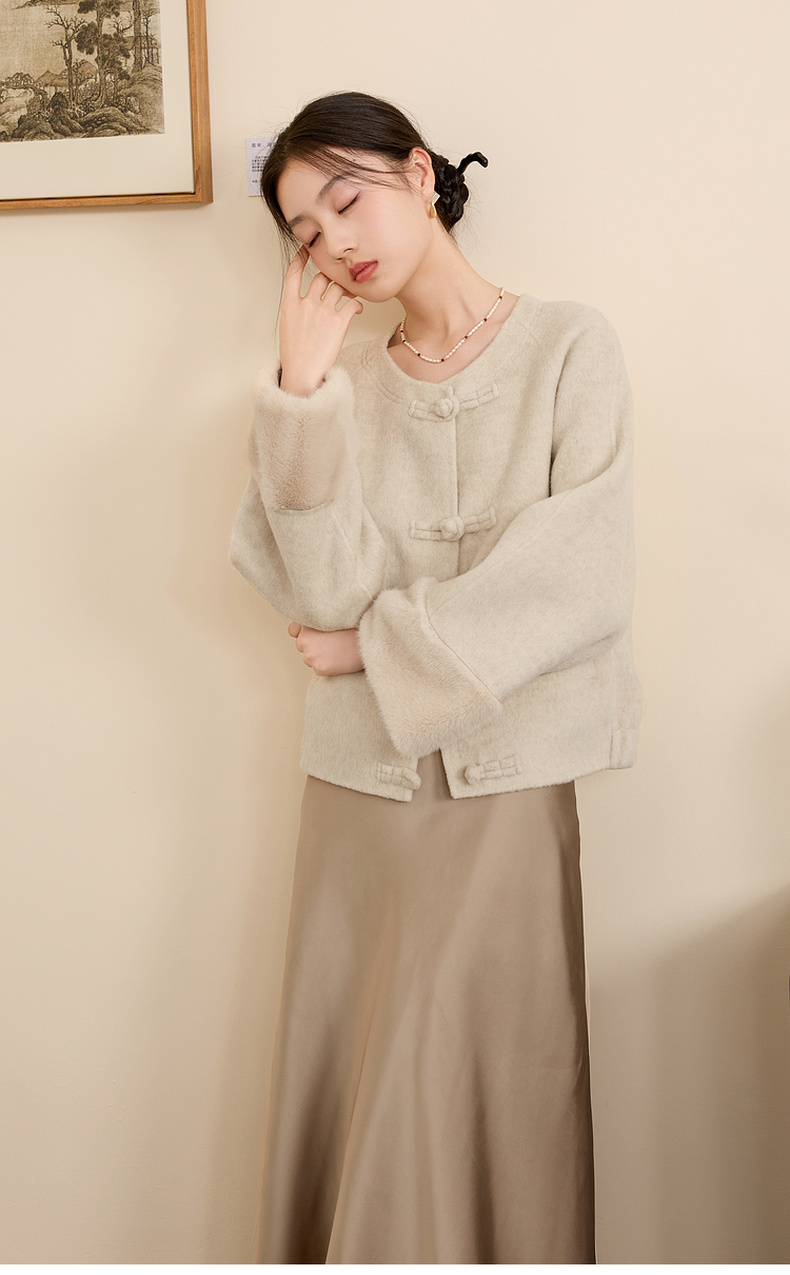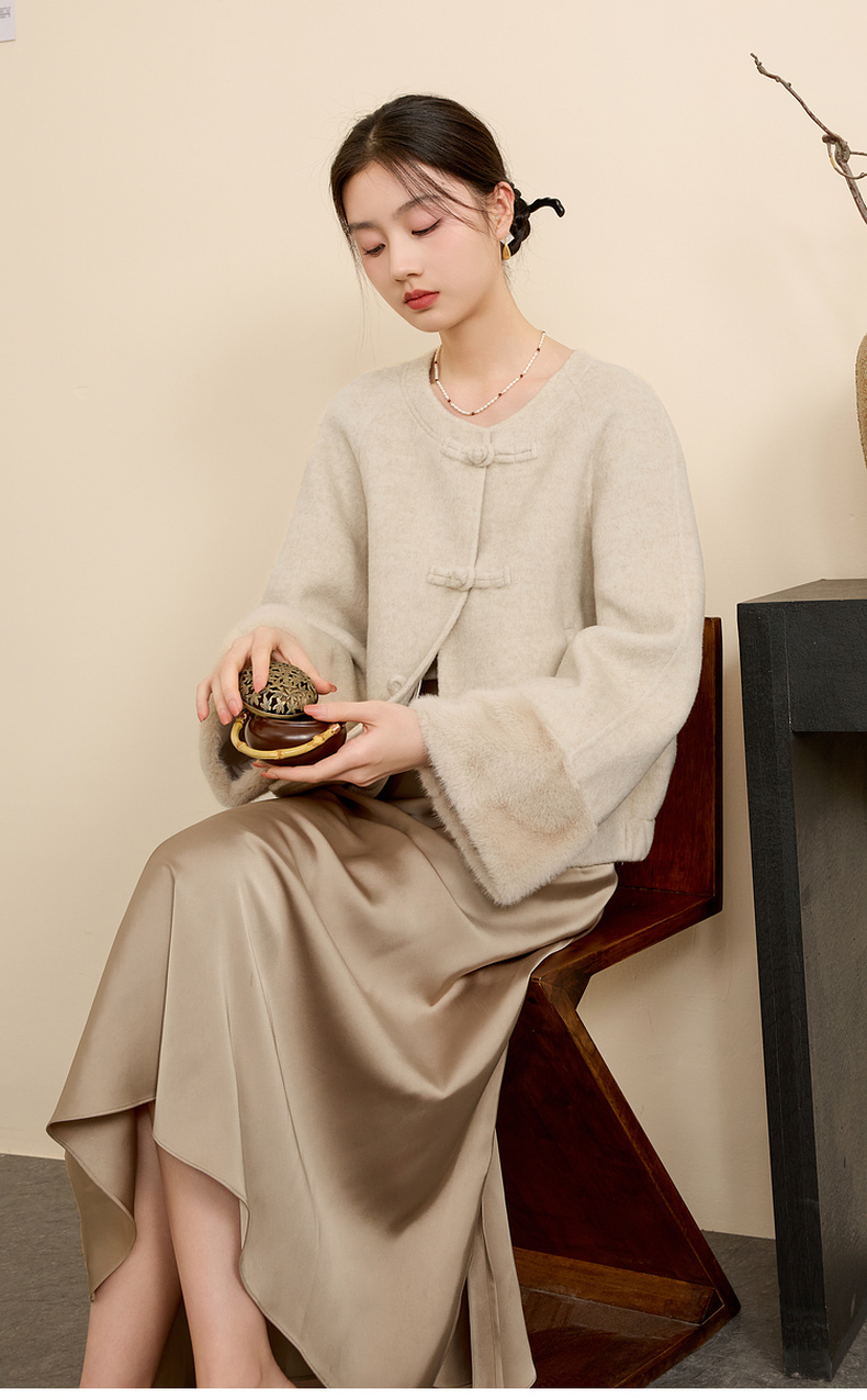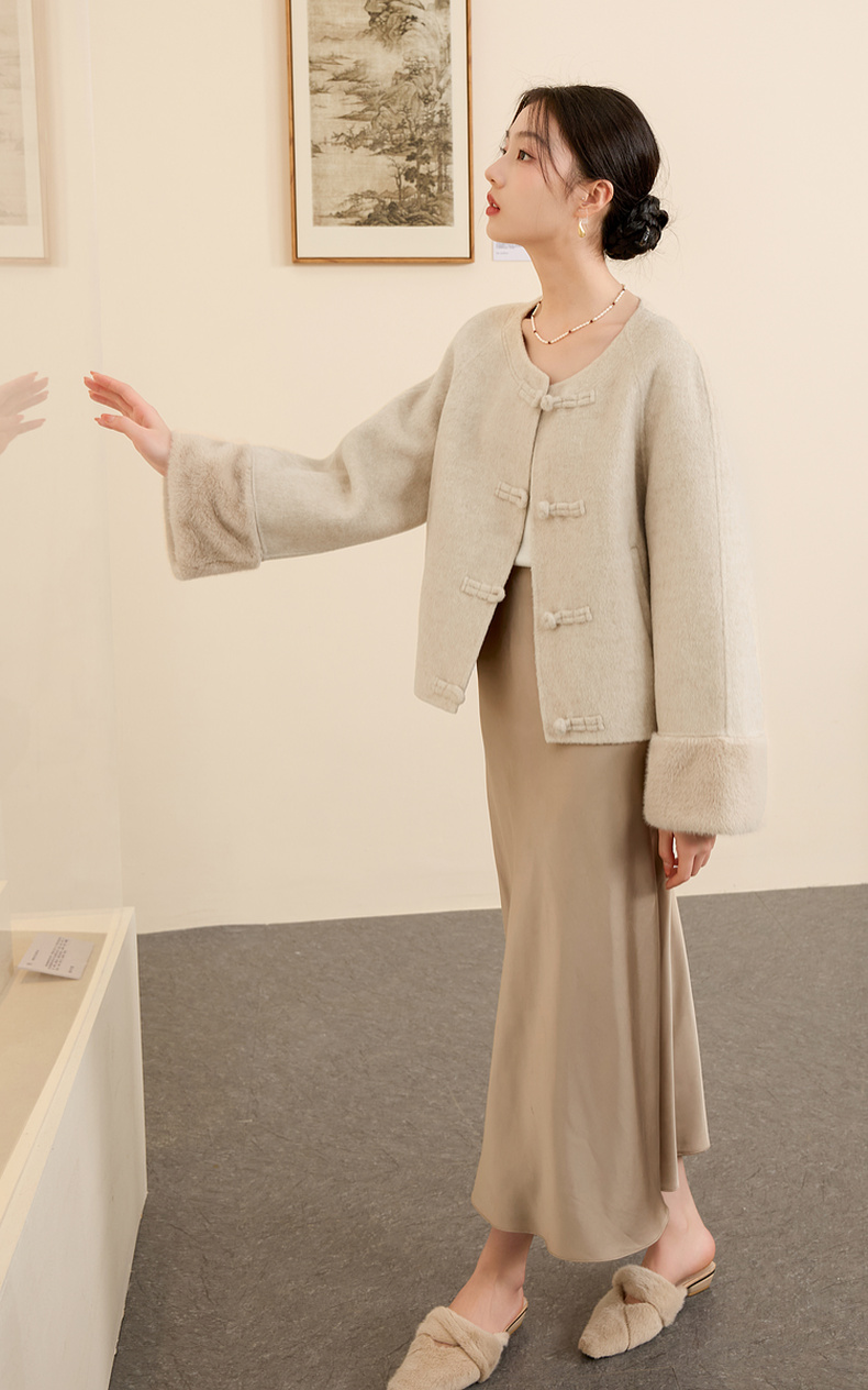 三彩【月烟如梦】2024冬季新款新中式双面呢大衣短款圆领盘扣毛呢C