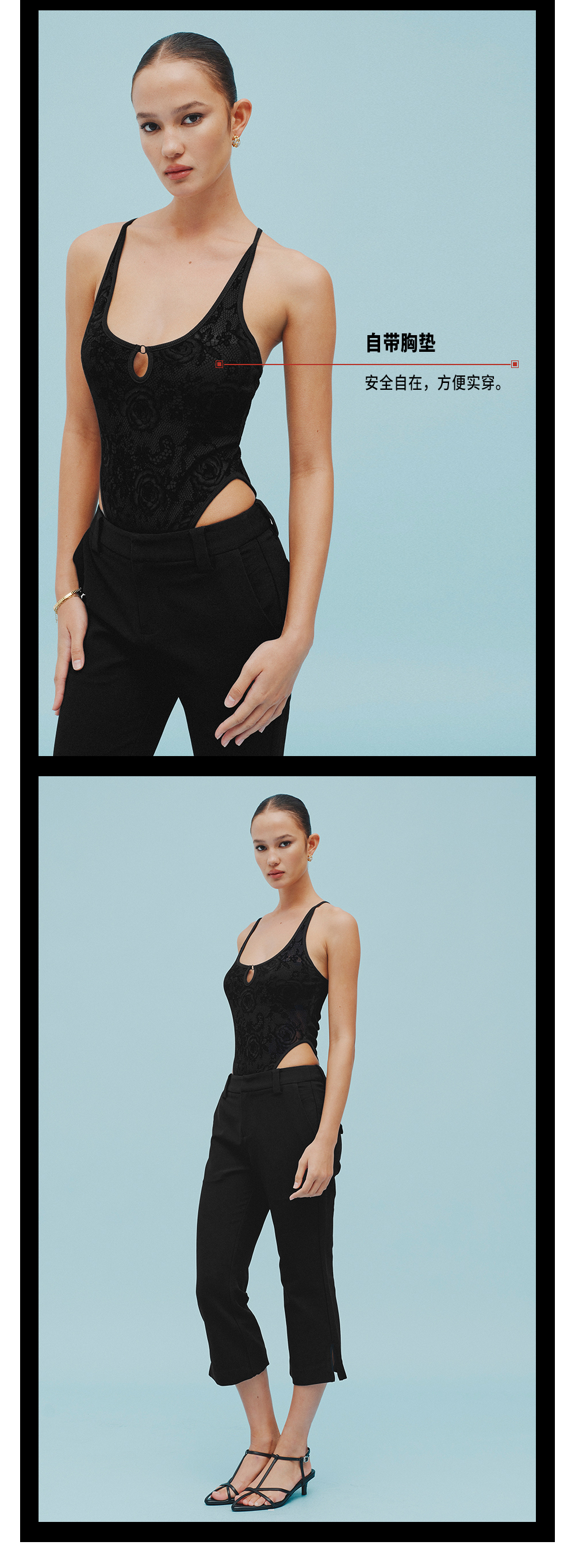 TR她热 丝绒荆棘 黑色植绒蕾丝带胸垫镂空复古显瘦挂脖露背吊带连体衣