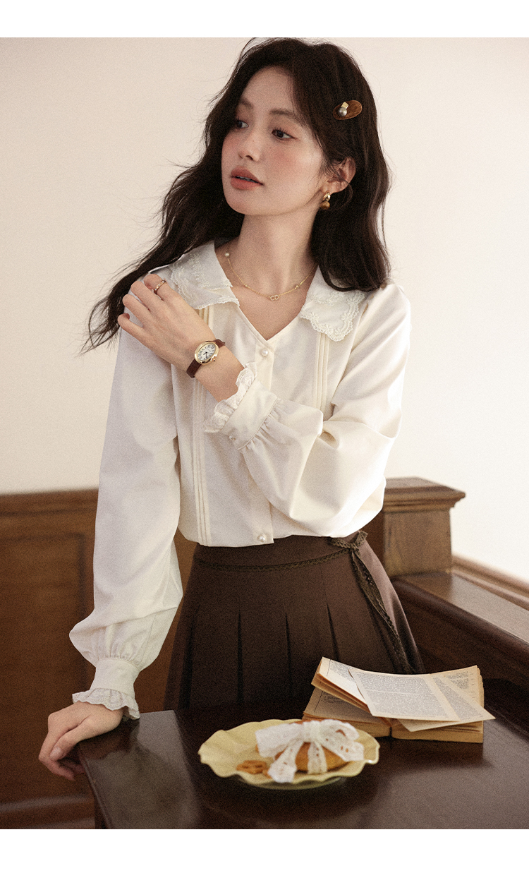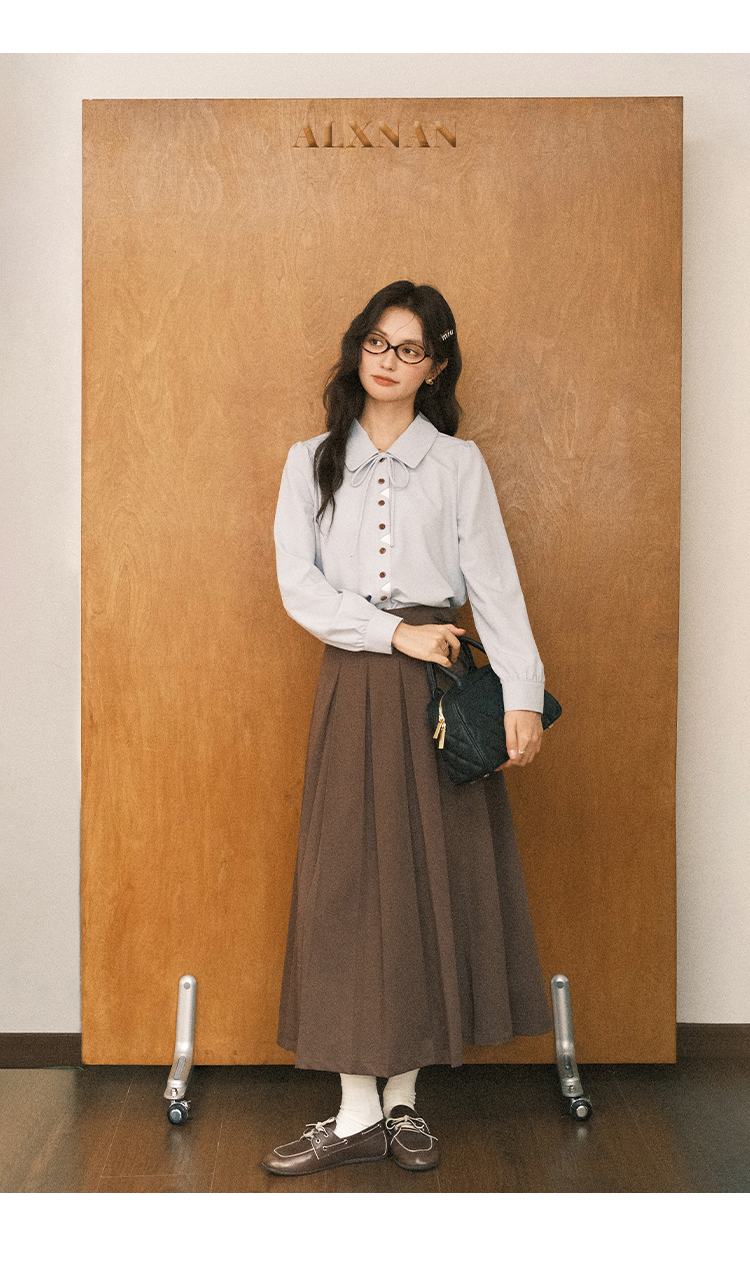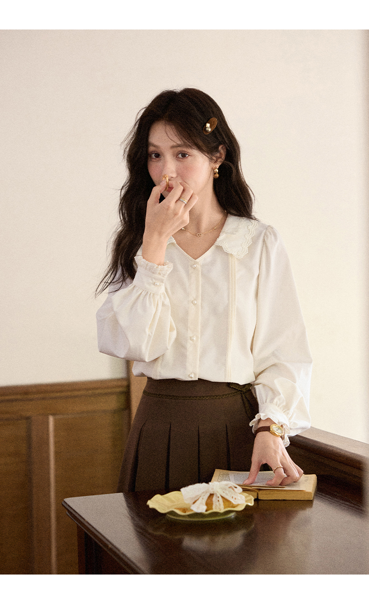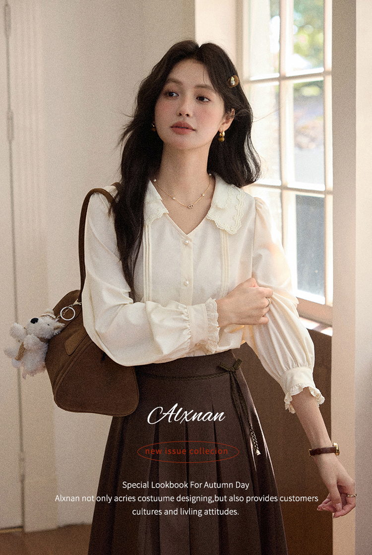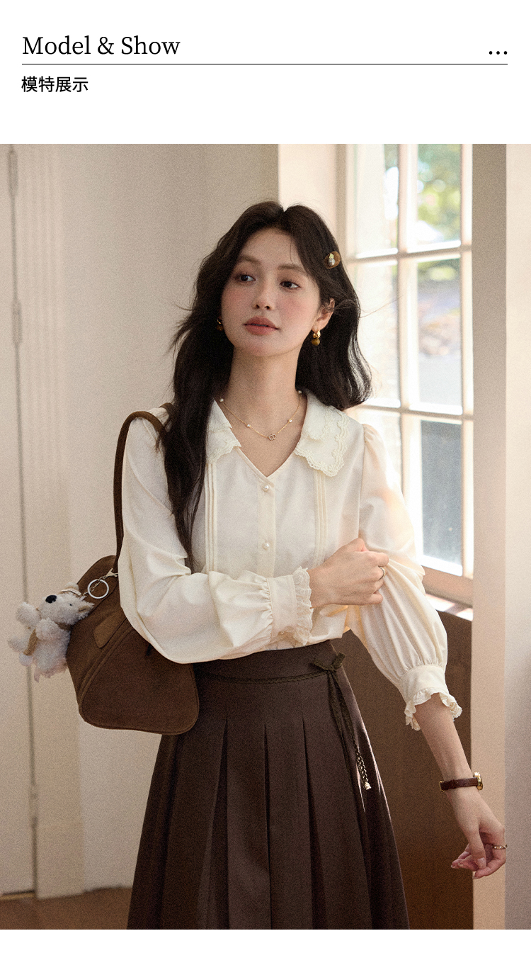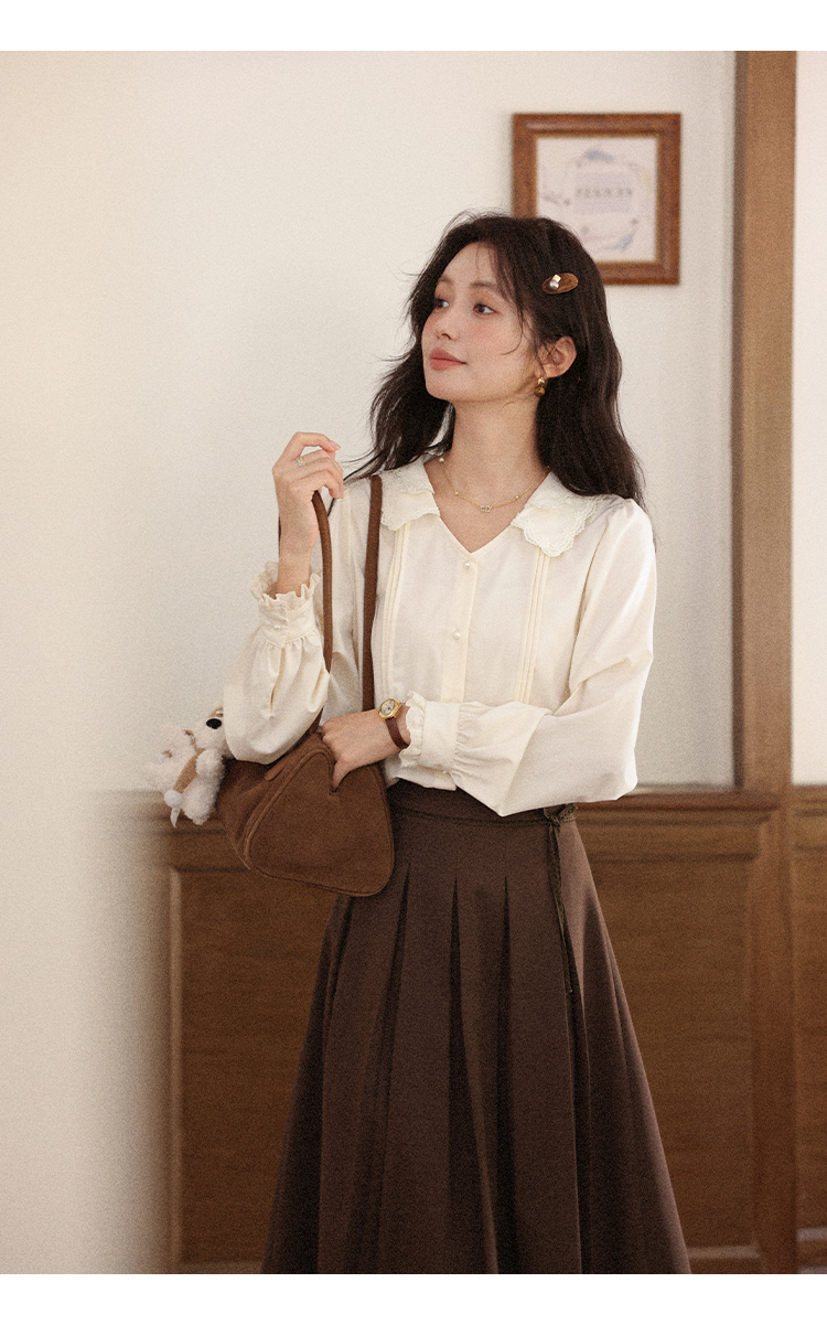鹿向南「秋风香草」早秋长袖杏色V领衬衫新款休闲宽松显瘦开衫女