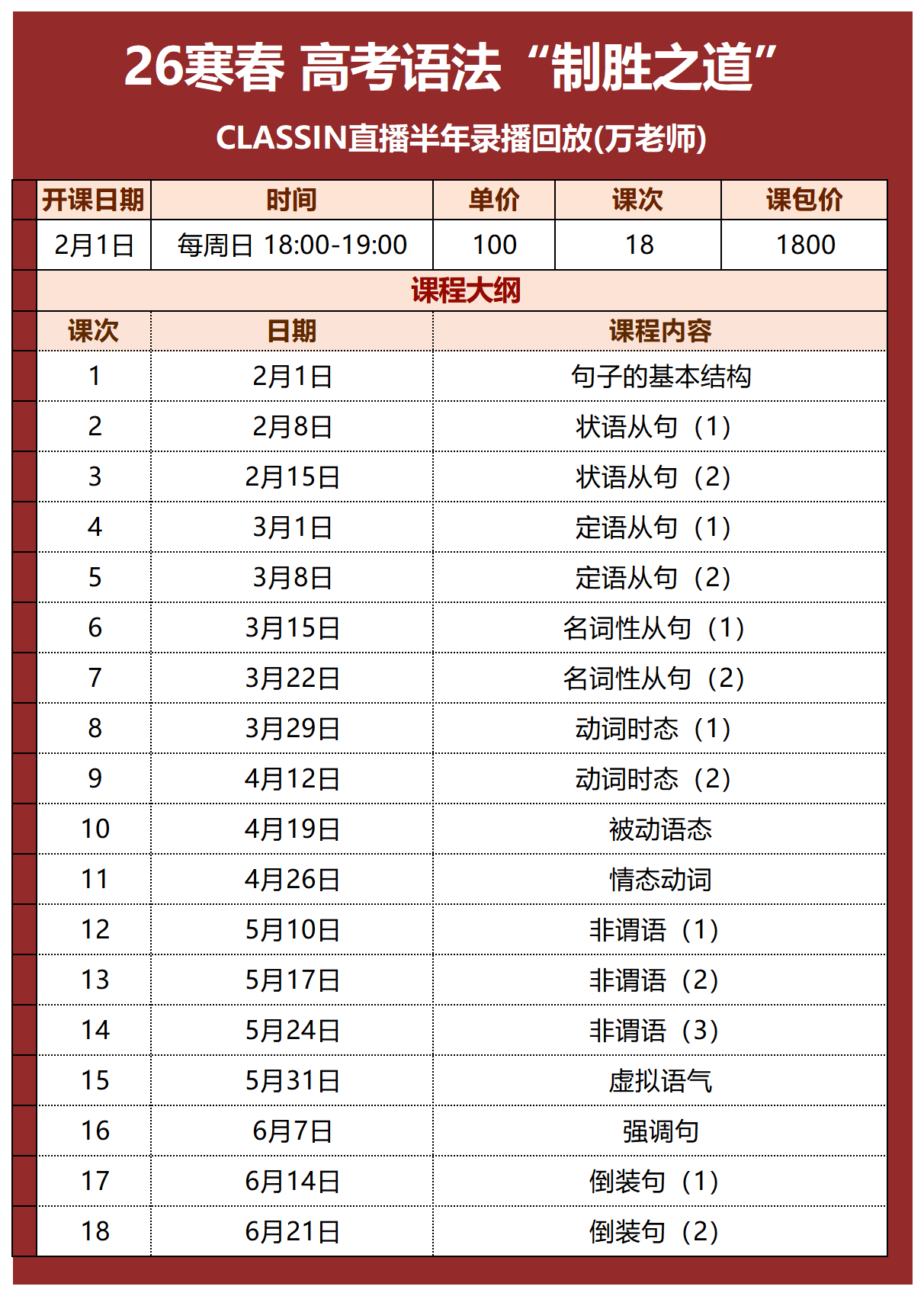 🎏18次课,涵盖语法3大板块,12个专题,3个阶段复习,从基础到进阶,帮助学生系统学习高中英语语法,为提前适应高中英语强度和应对自招考英语做好万全准备。
