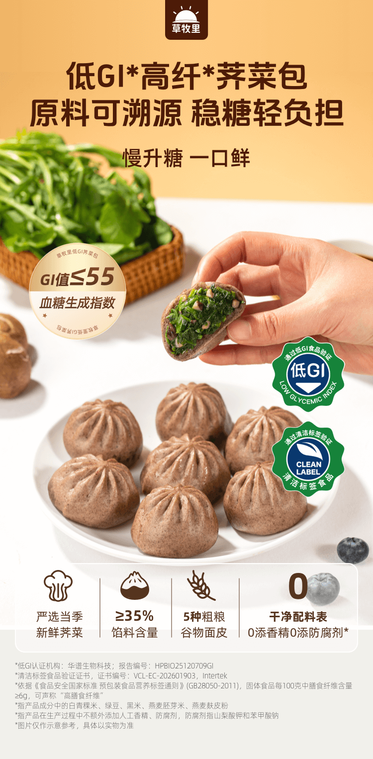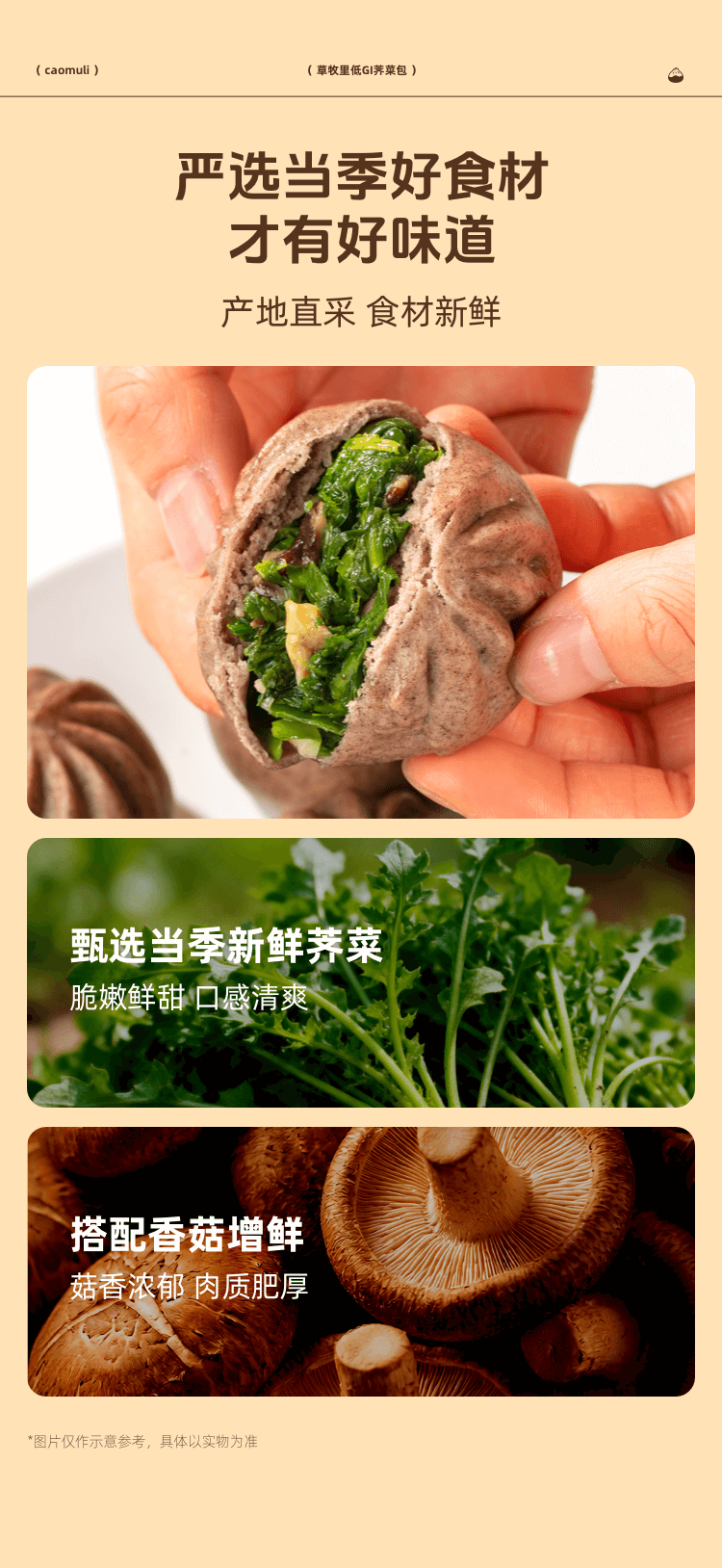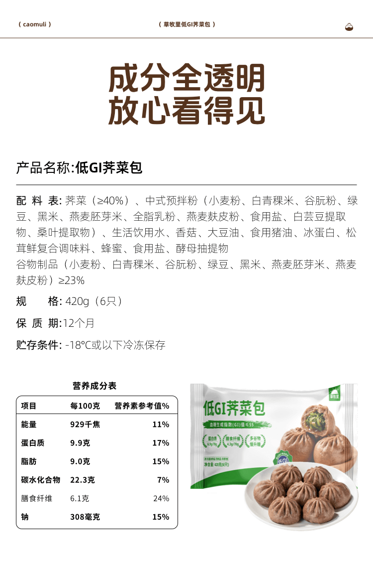 【5种粗粮谷物面皮】草牧里 低GI荠菜包(素食包子) 420g(6个)/袋 严选当季新鲜荠菜(早餐好物)