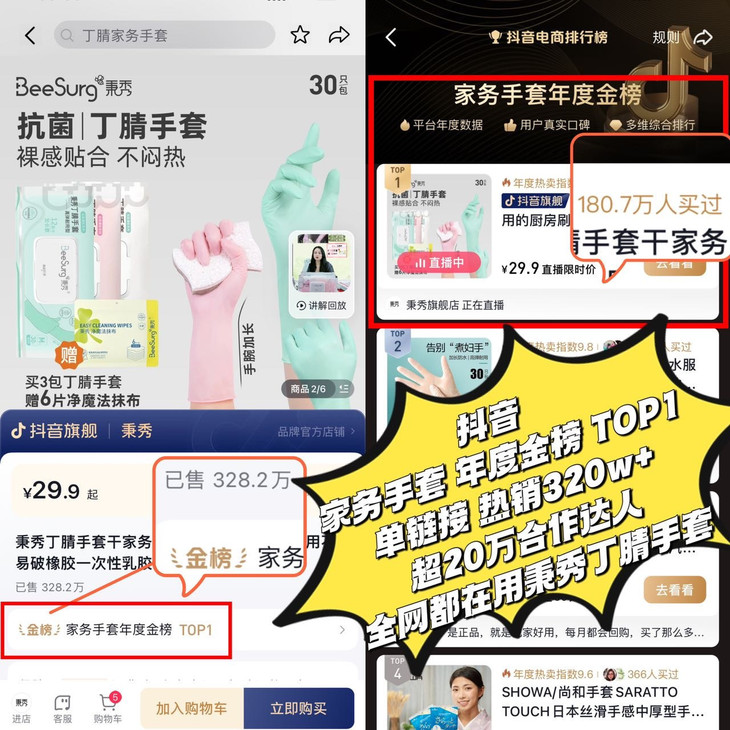 抖音!家务手套年度金榜Top一 单链接热销320万+超20万合作达人 全网都在用的秉秀手套