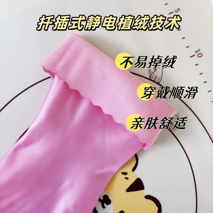 内层的植绒材质手感好 完全不刺激皮肤 你可以放心地进行长时间的清洁 而担心手部干燥或过敏 在寒冷的冬天轻柔地抚摸着我们的双手 给予贴心的关怀