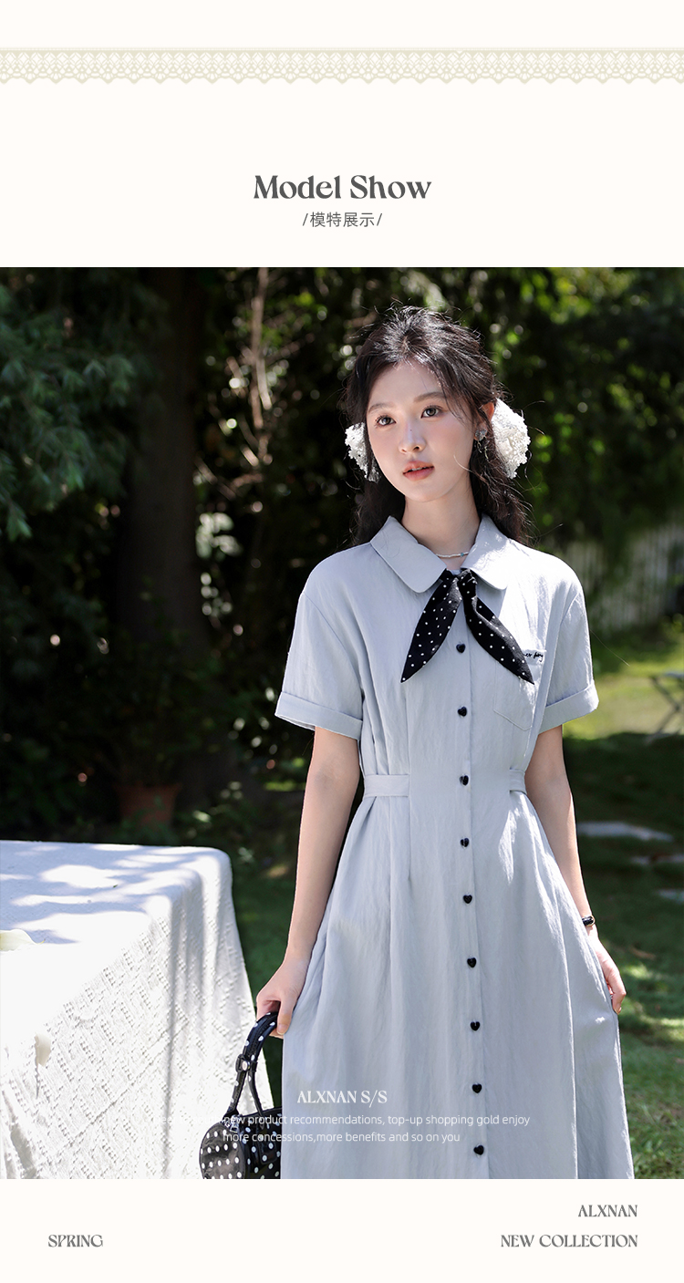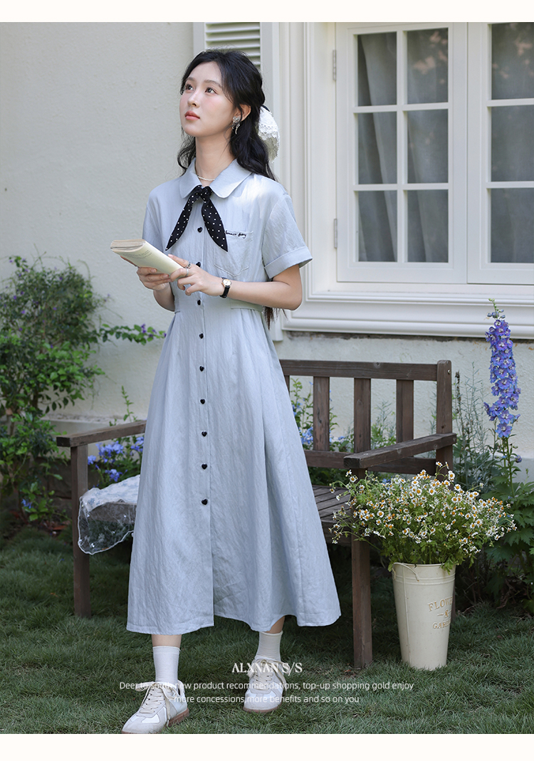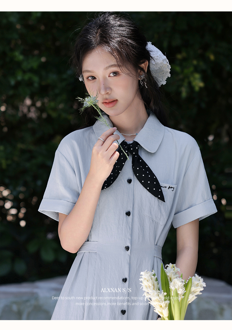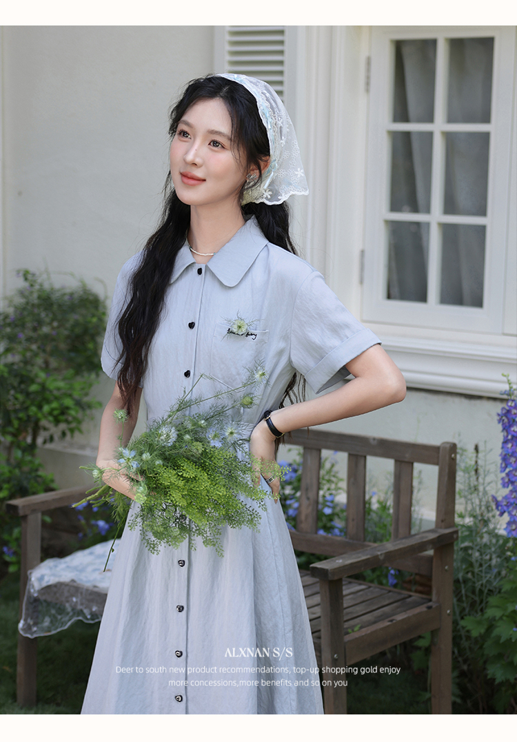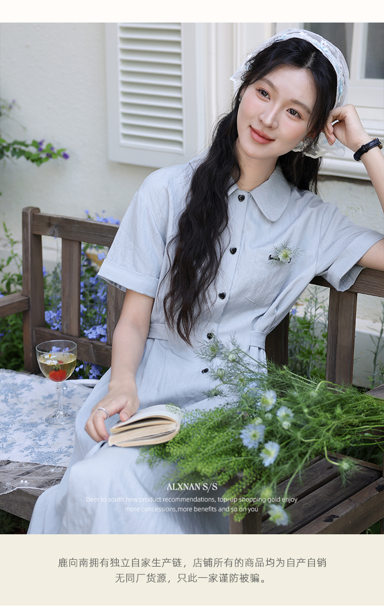 鹿向南「浅蓝月光」蓝色polo领连衣裙女夏小众收腰短袖长款衬衫裙L55910