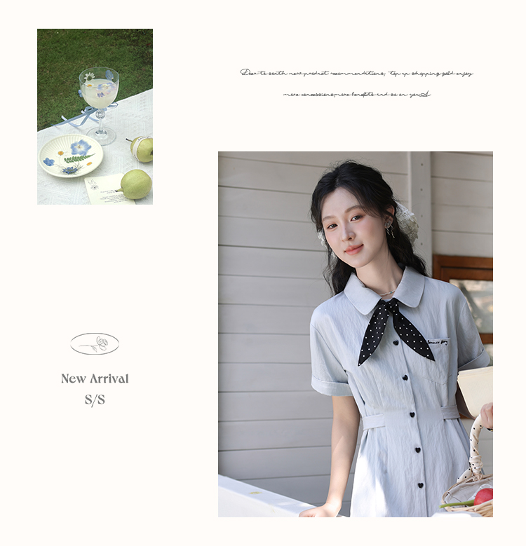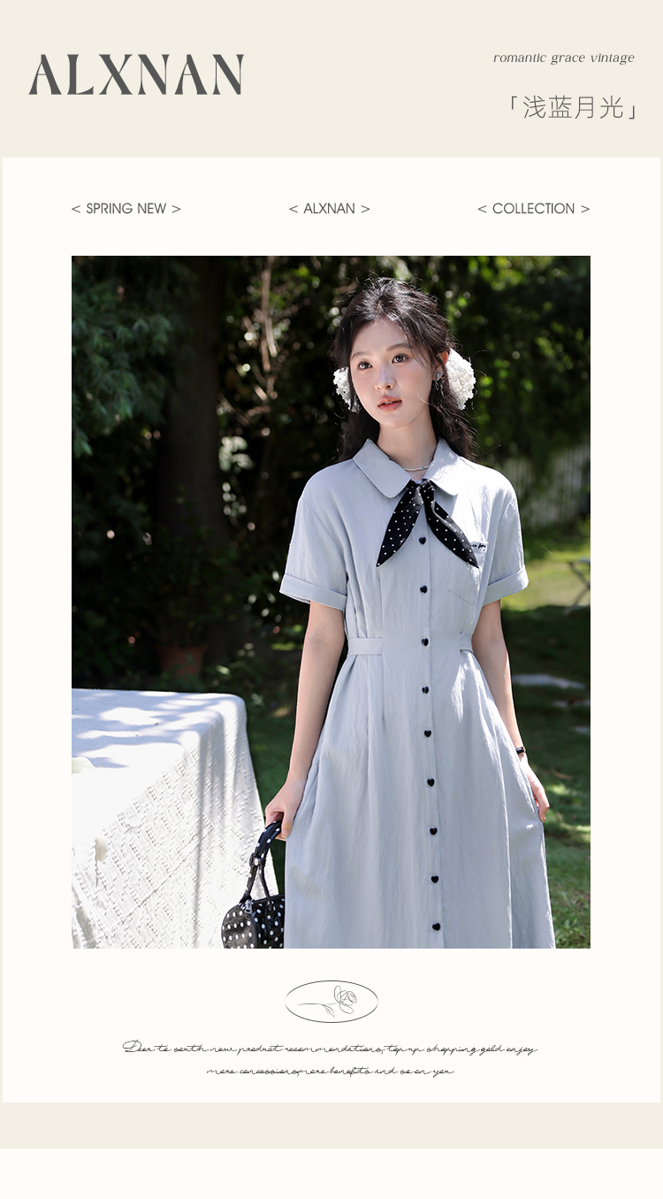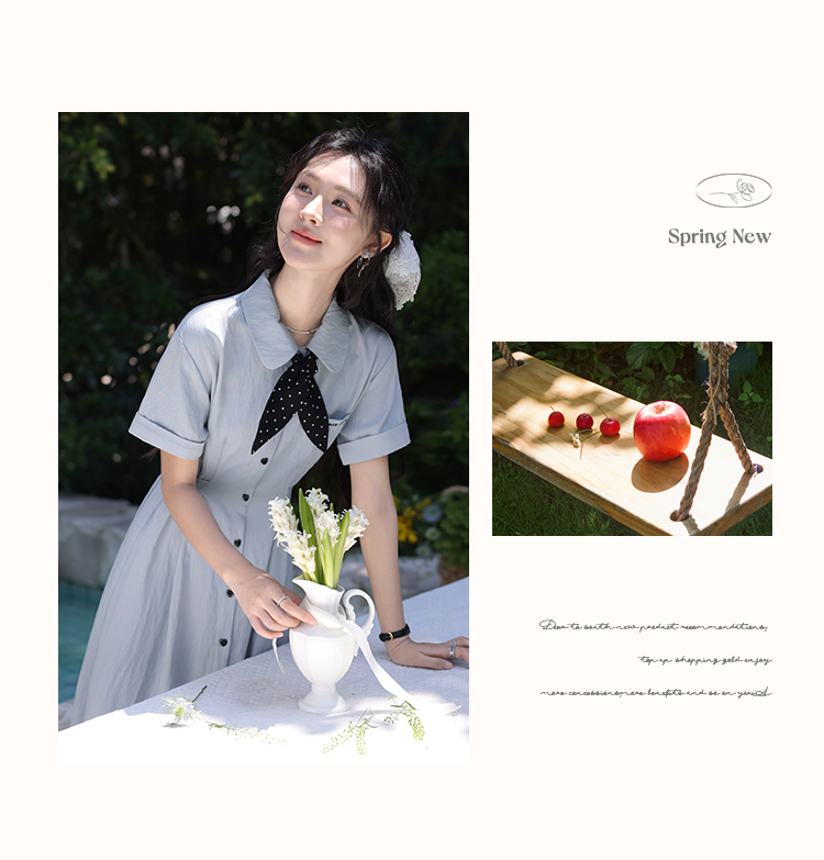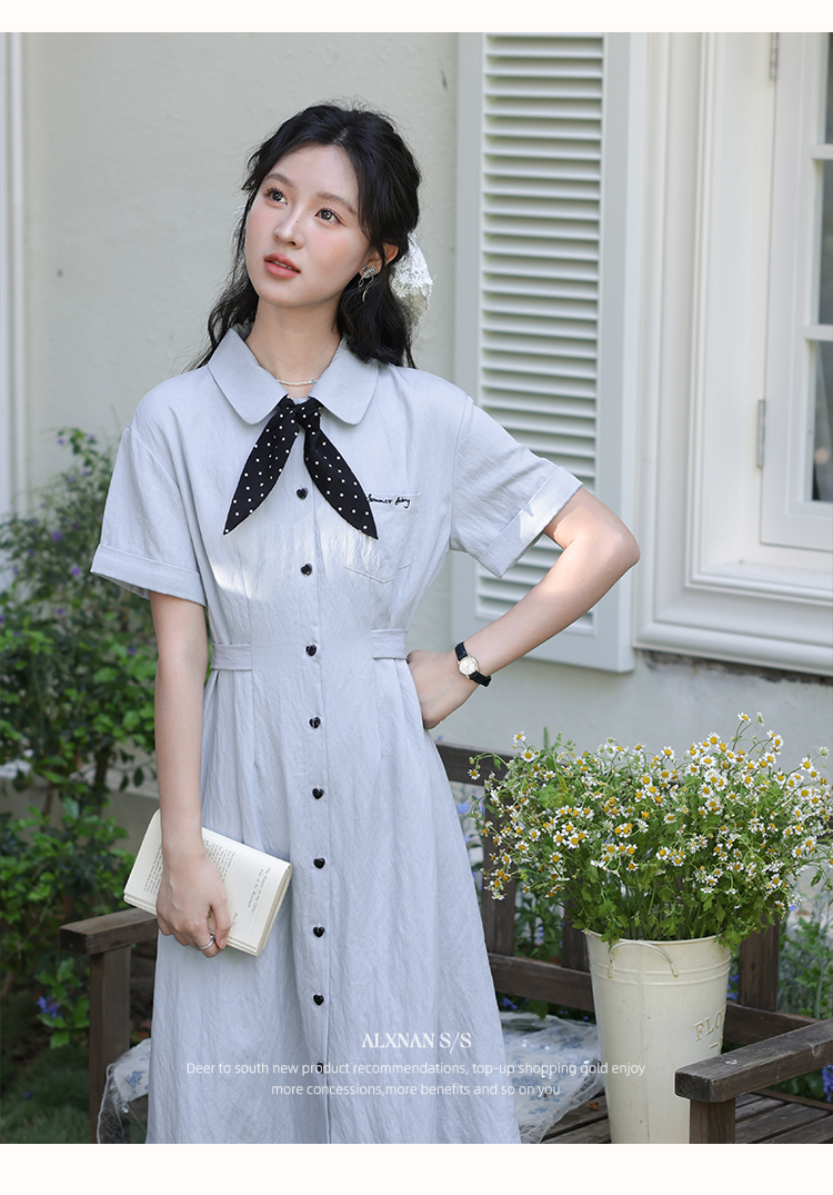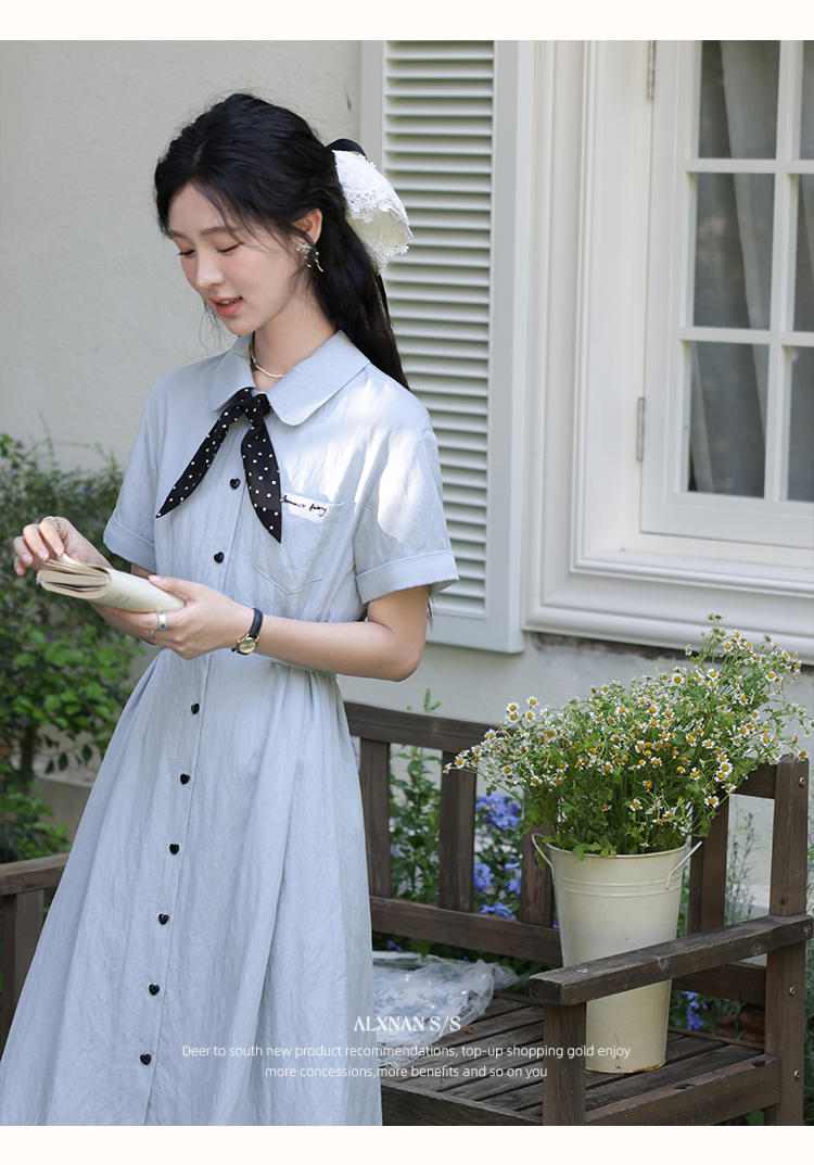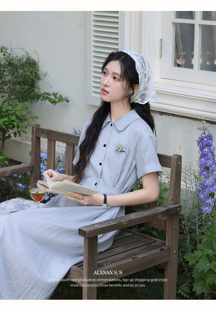 鹿向南「浅蓝月光」蓝色polo领连衣裙女夏小众收腰短袖长款衬衫裙L55910