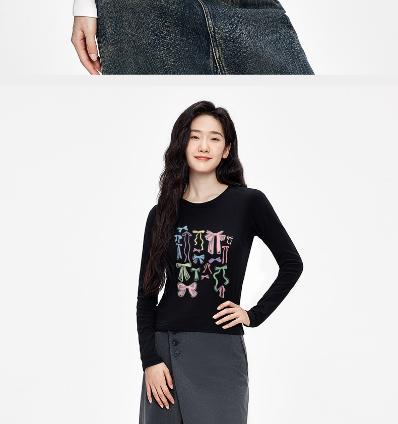 「棉的美学」显瘦正肩仙女风长袖T恤女蝴蝶结印花柔软上衣打底衫