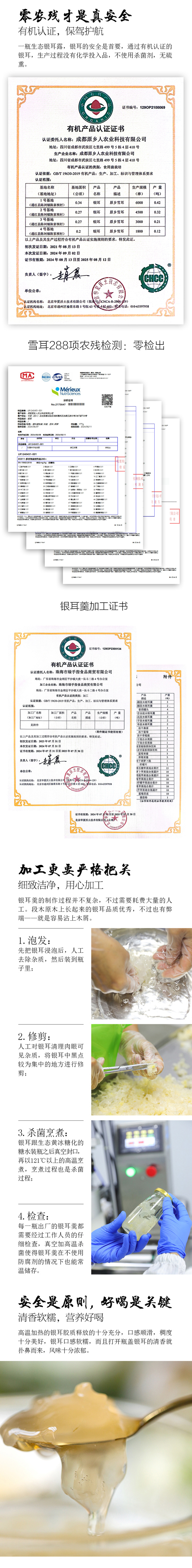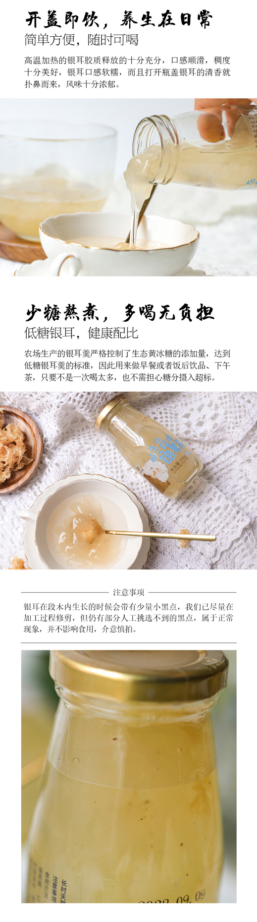 【规格】: 原味192g*6瓶 混合口味192g*6瓶(原味*2+桂花*1+红枣*1+莲子百合*1+梨子*1) 无糖192g*6瓶 【配料】: 原味:纯净水,有机银耳,生态黄砂糖 桂花口味:纯净水、有机银耳、生态黄砂糖、生态桂花 红枣口味:纯净水、有机银耳、生态黄砂糖、有机红枣 莲子百合口味:纯净水、有机银耳、生态黄砂糖、生态莲子、野生百合 梨子口味:纯净水、有机银耳、生态黄砂糖、有机香水梨 无糖口味:纯净水、有机银耳 【生产方式】:有机银耳浸泡去除杂质后加入生态黄冰糖、水高温炖煮,不使用防腐剂等添加剂 【生产日期】:见包装 【保存方式】:阴凉干燥处避光储存 【保质期】:12个月 【注意事项】银耳上的小黑点是在段木上生长时天然产生,是正常情况,不影响食用,介意慎拍。 |