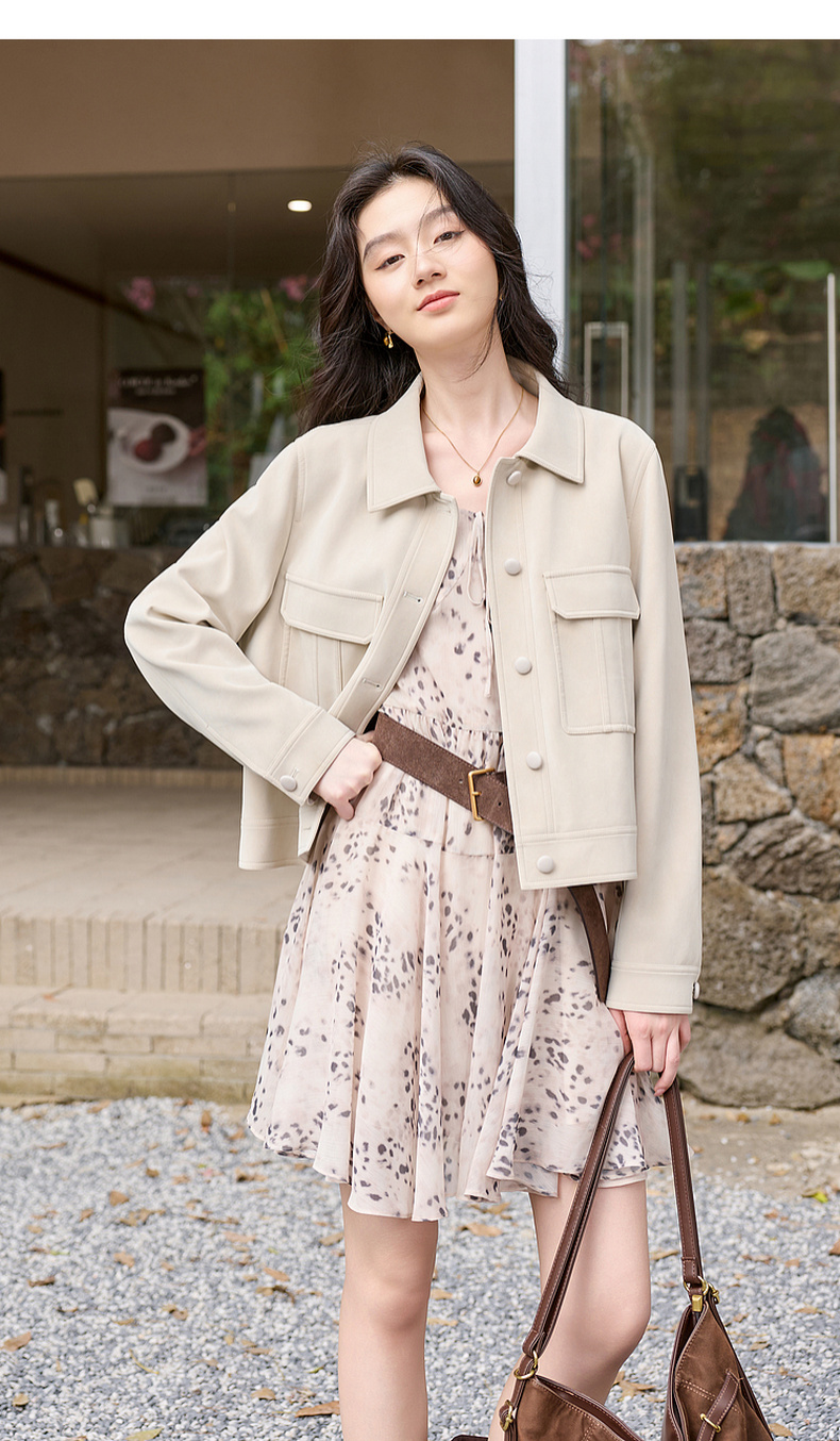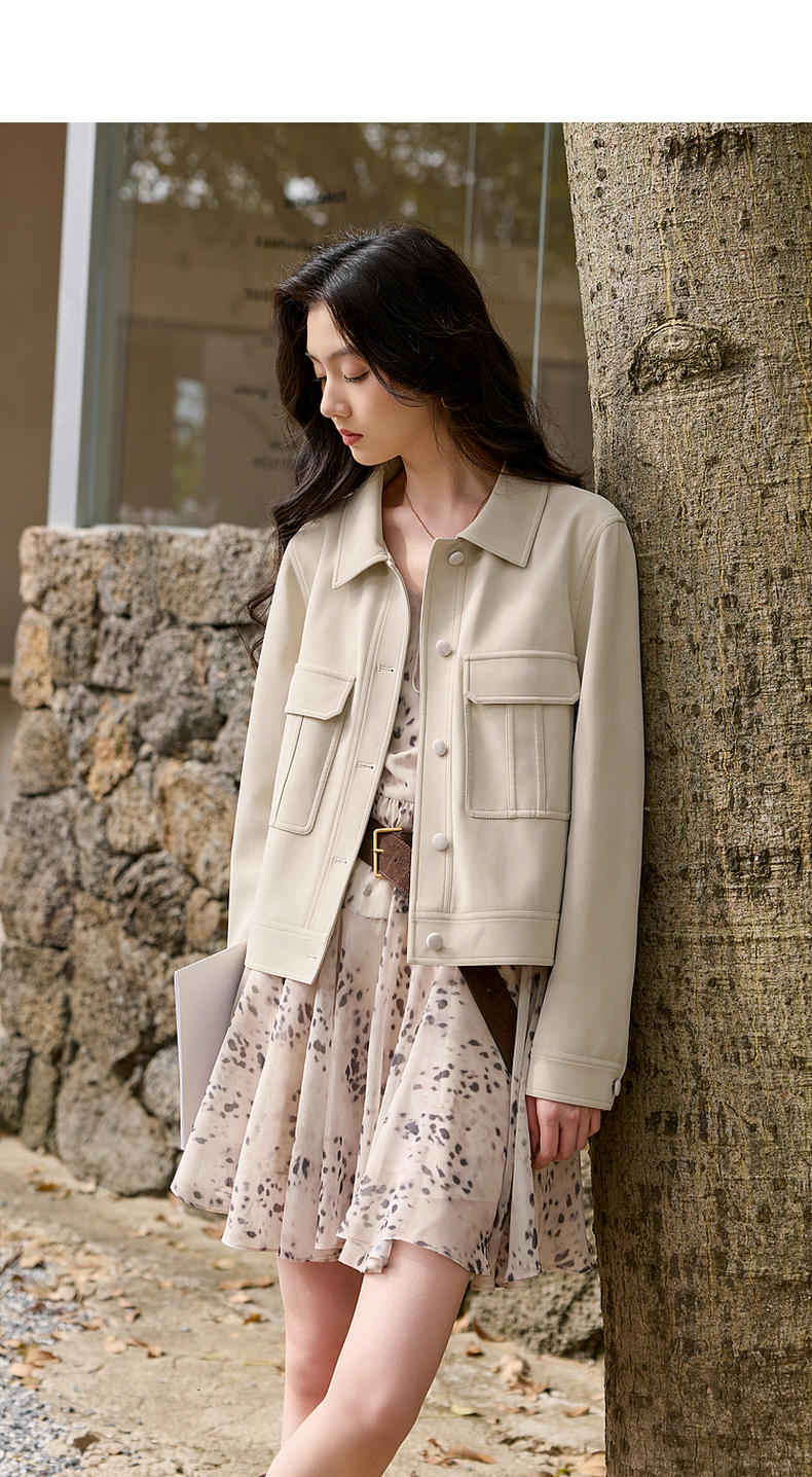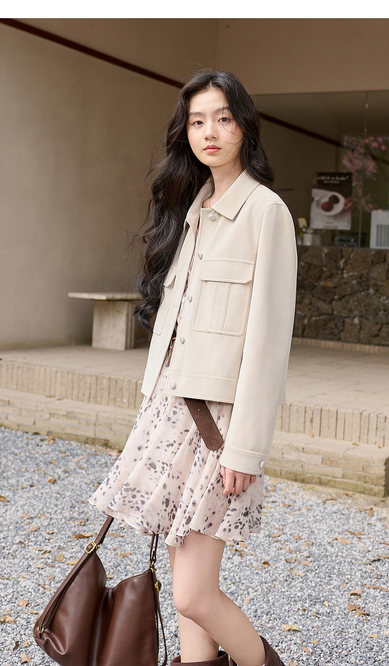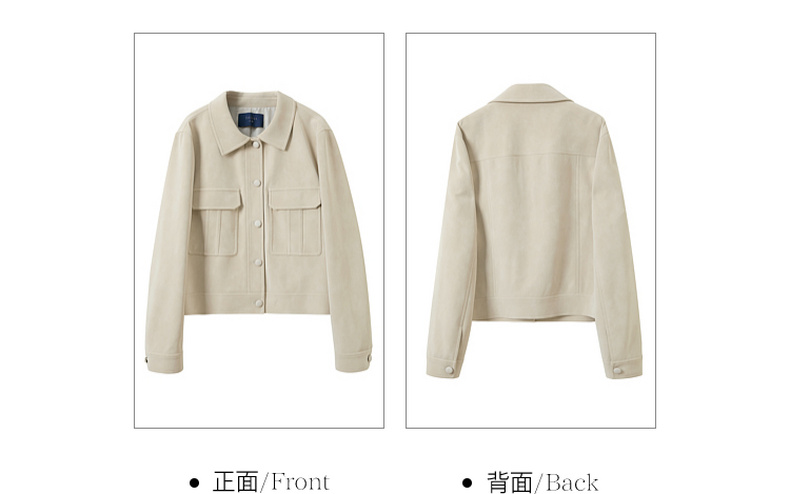 三彩2026春季新款宽松短款绒感仿麂皮PU外套简约夹克上衣复古S