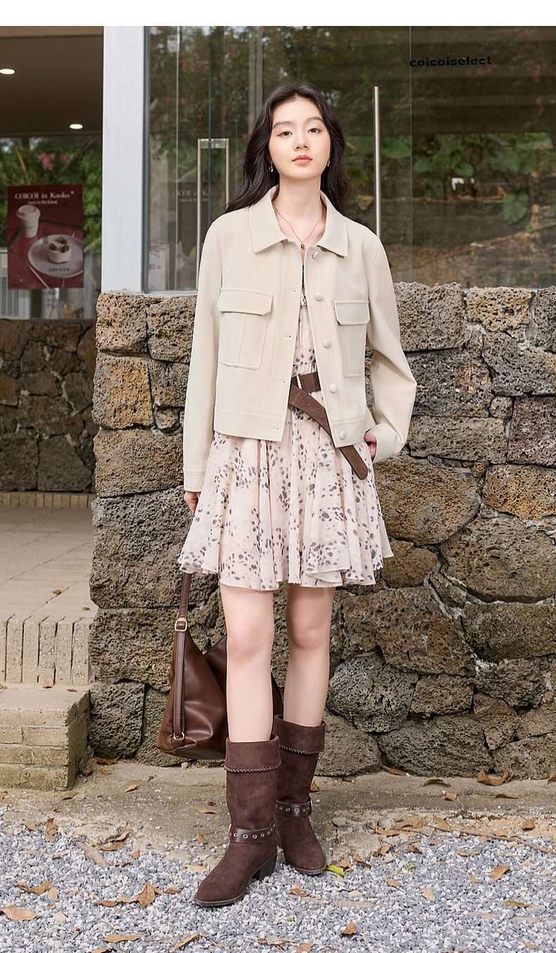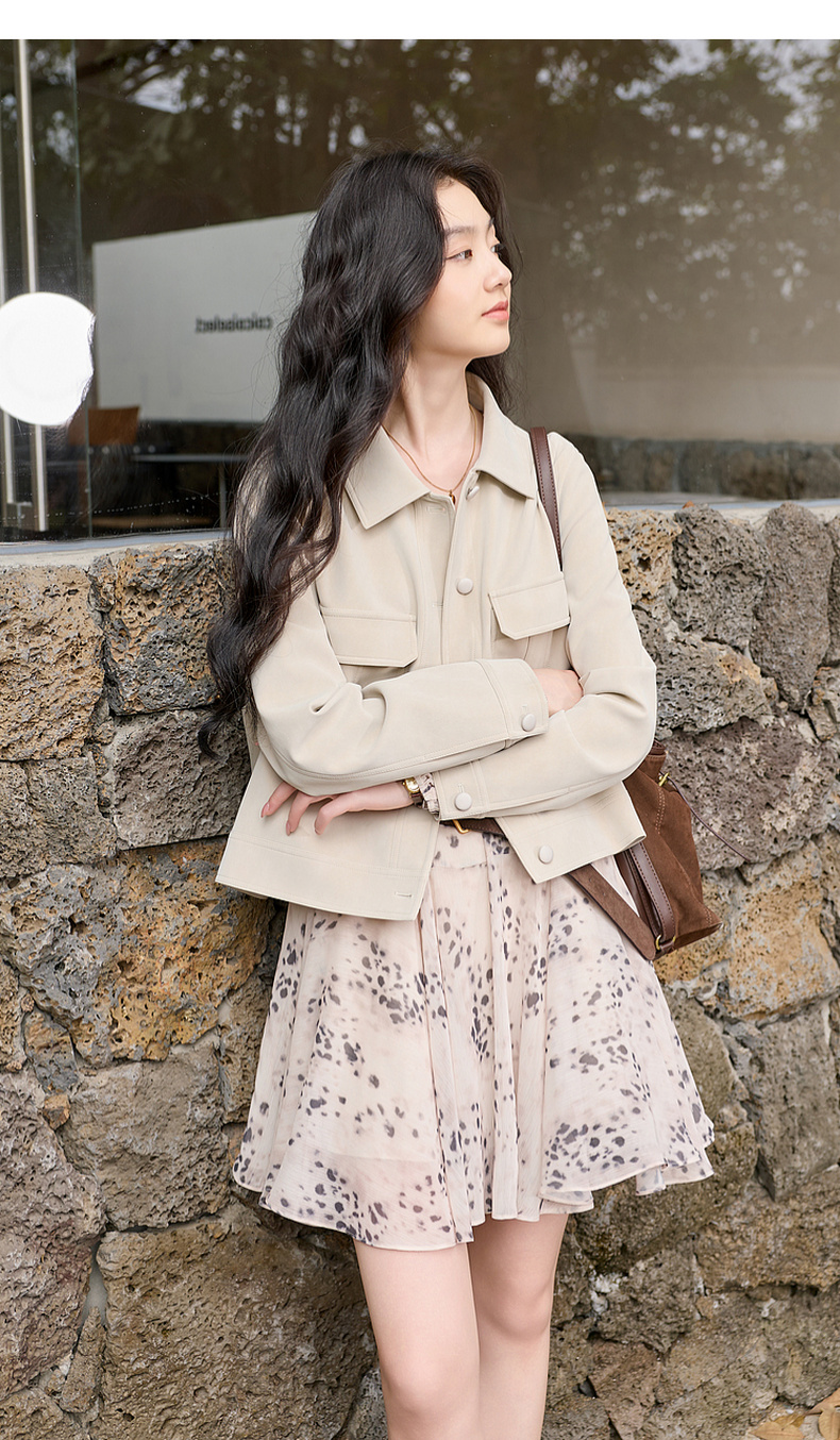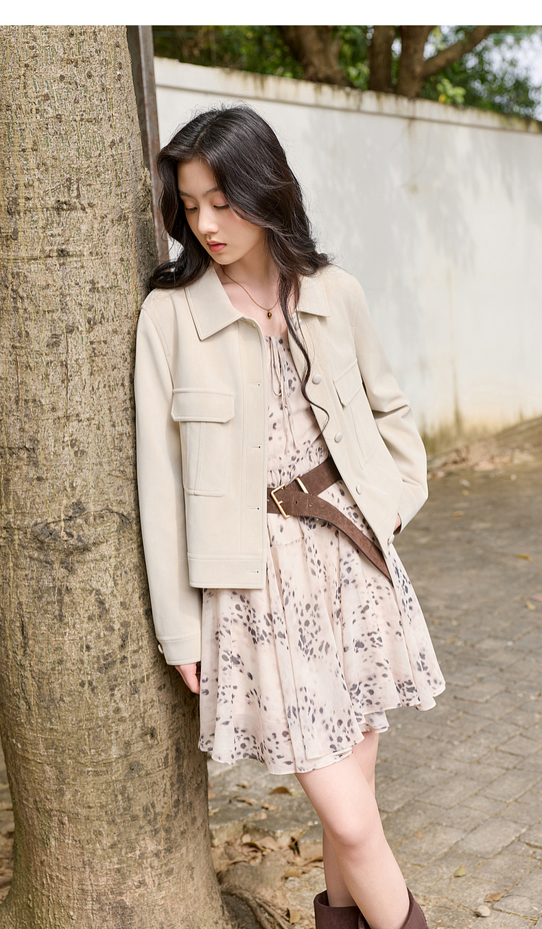 三彩2026春季新款宽松短款绒感仿麂皮PU外套简约夹克上衣复古S