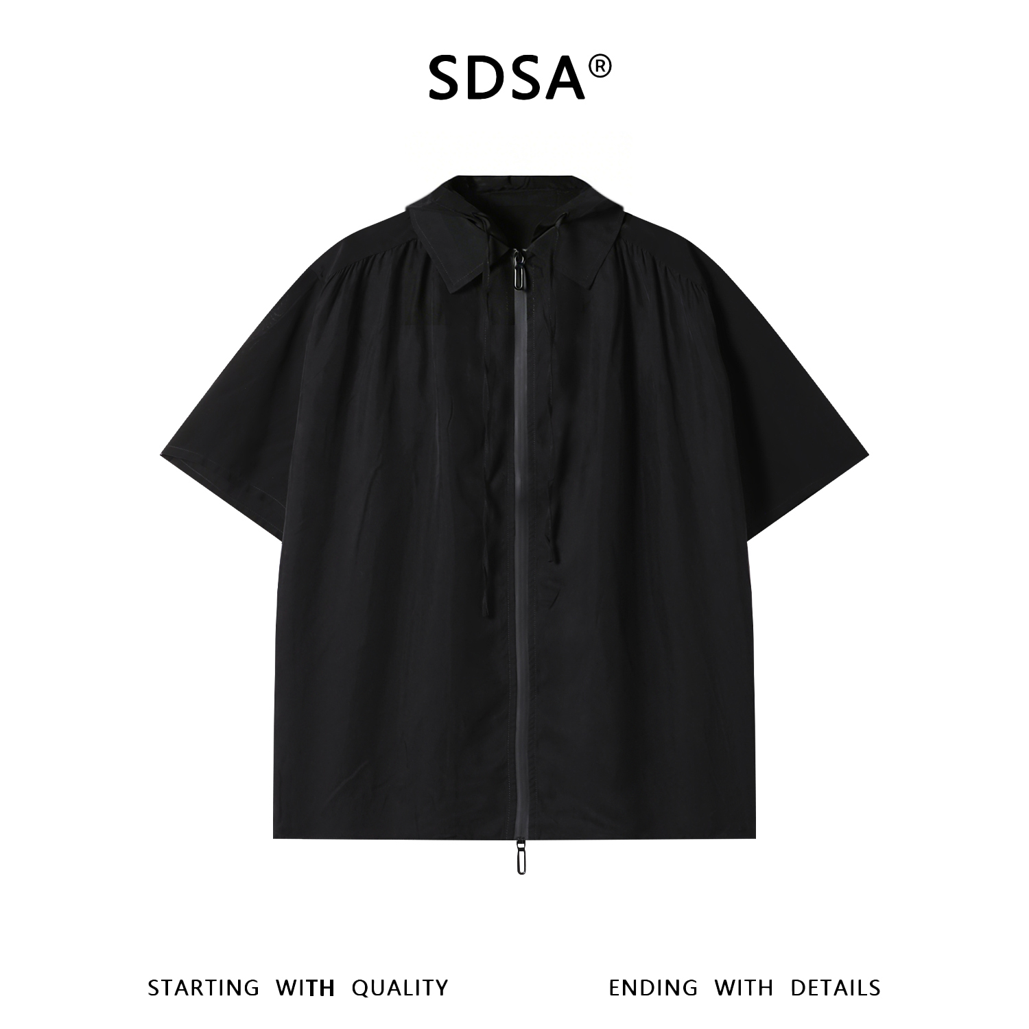 SDSA男装2026新款高贵轻奢纯色简约拉链翻领连帽短袖衬衫百搭显瘦