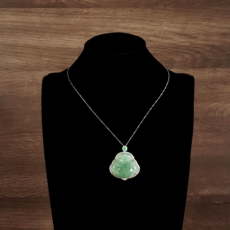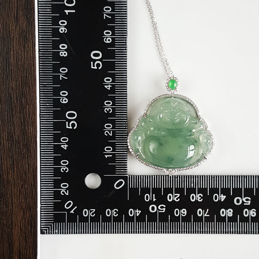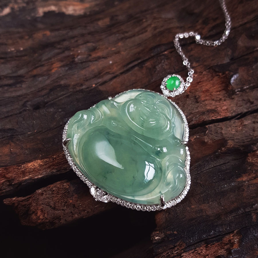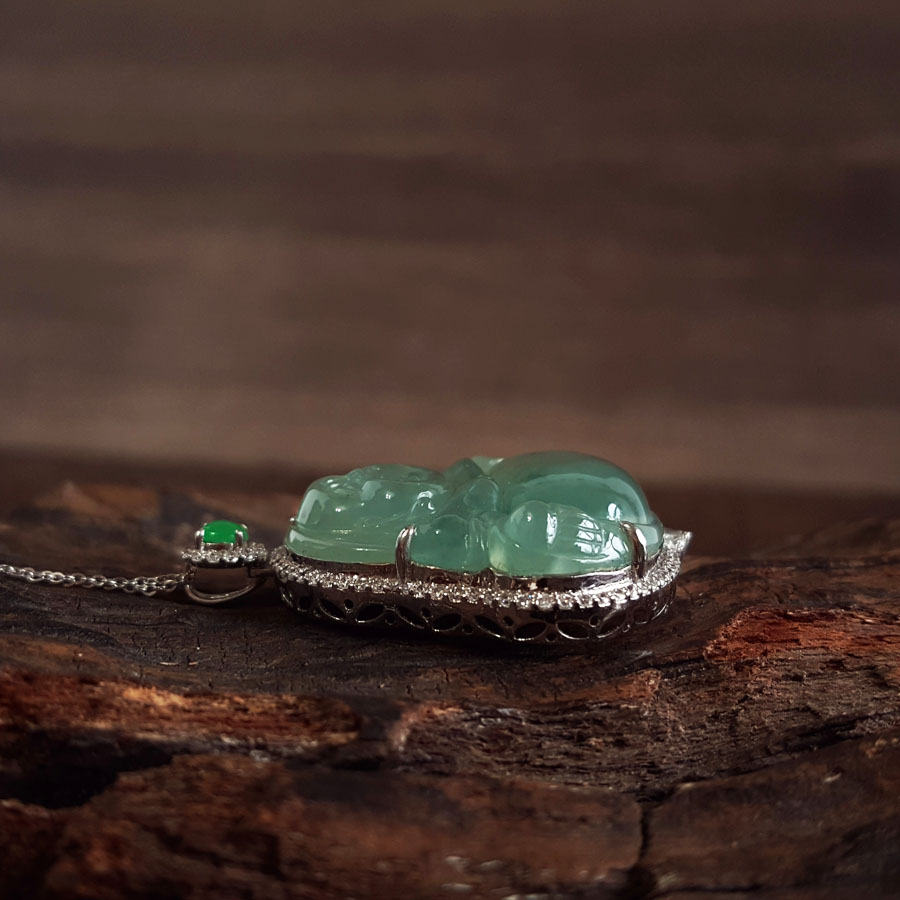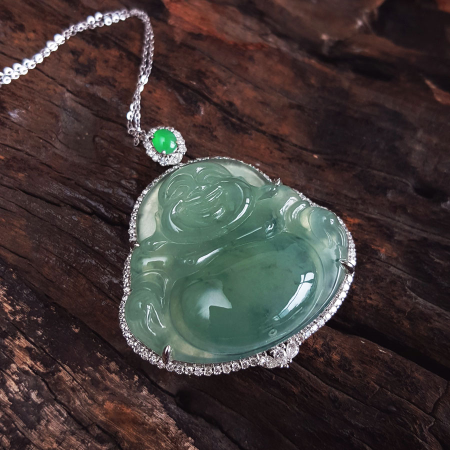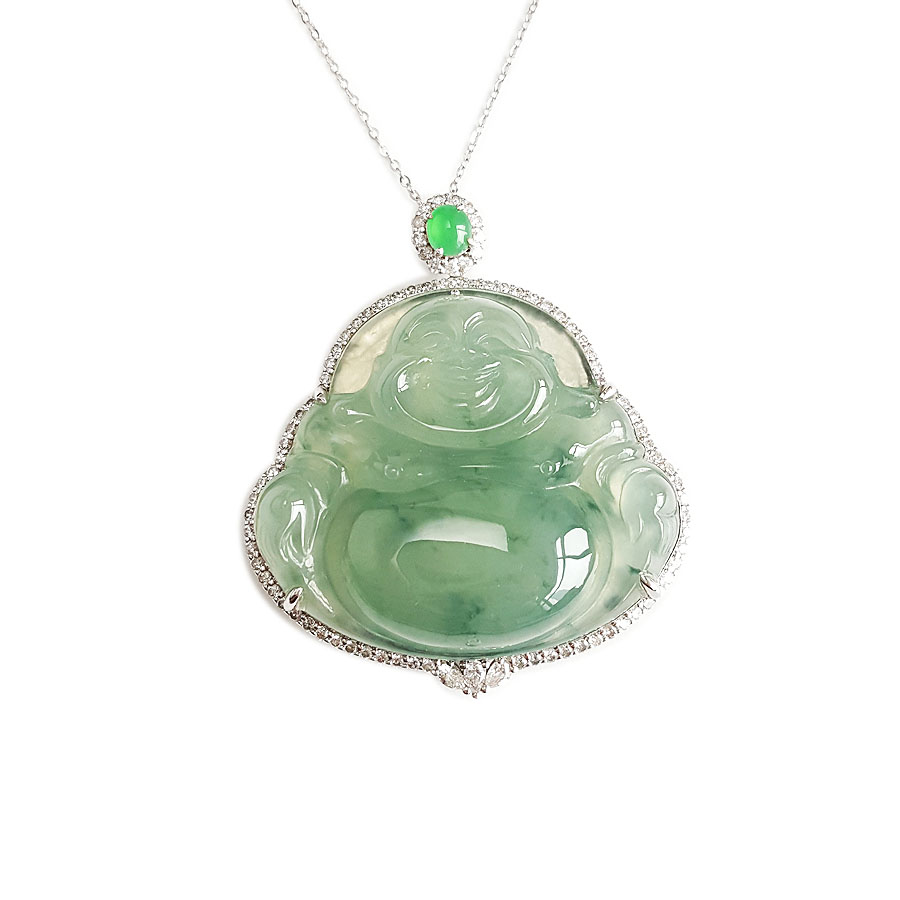名称 | AU750白金豪镶钻镶天然细腻冰种飘蓝花佛公翡翠吊坠项链 |
