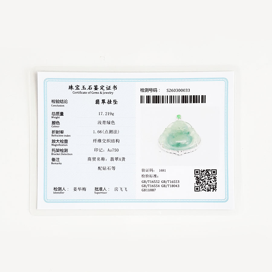 【天然正品】A货翡翠AU750白金豪镶钻镶天然细腻冰种飘蓝花佛公翡翠吊坠项链030326NJT18