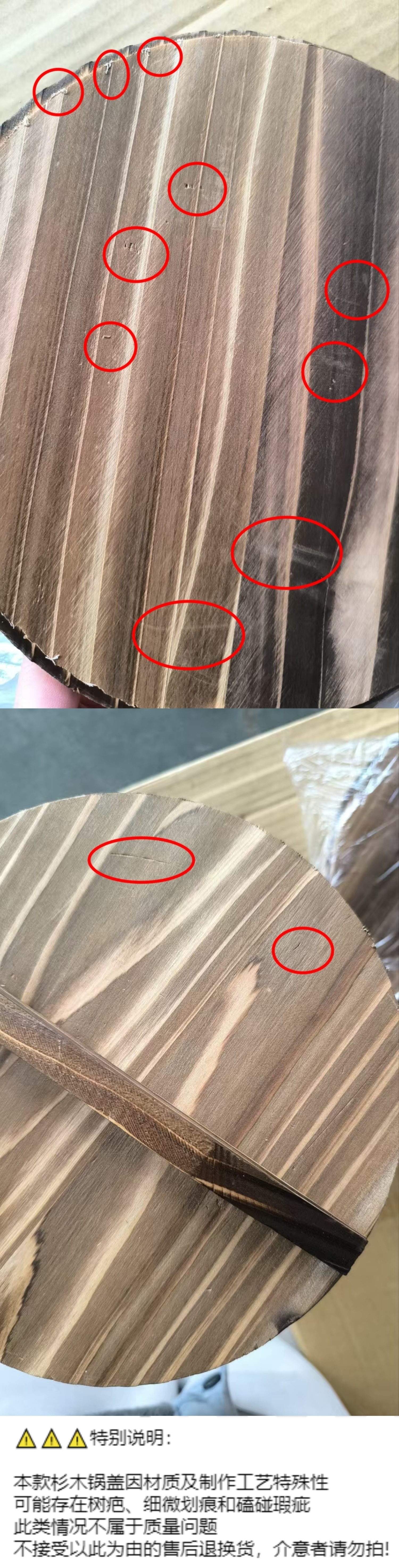 6、杉木锅盖因材质及制作工艺特殊性,产品可能存在树疤、细微划痕和磕碰瑕疵(注:用久了后这些痕迹都会淡化或者消失的和整个盖子融为一体的),均为正常现象,不接受因此类问题发起的售后退换货申请。请您在购买前仔细考虑,确认能够接受后再下单。