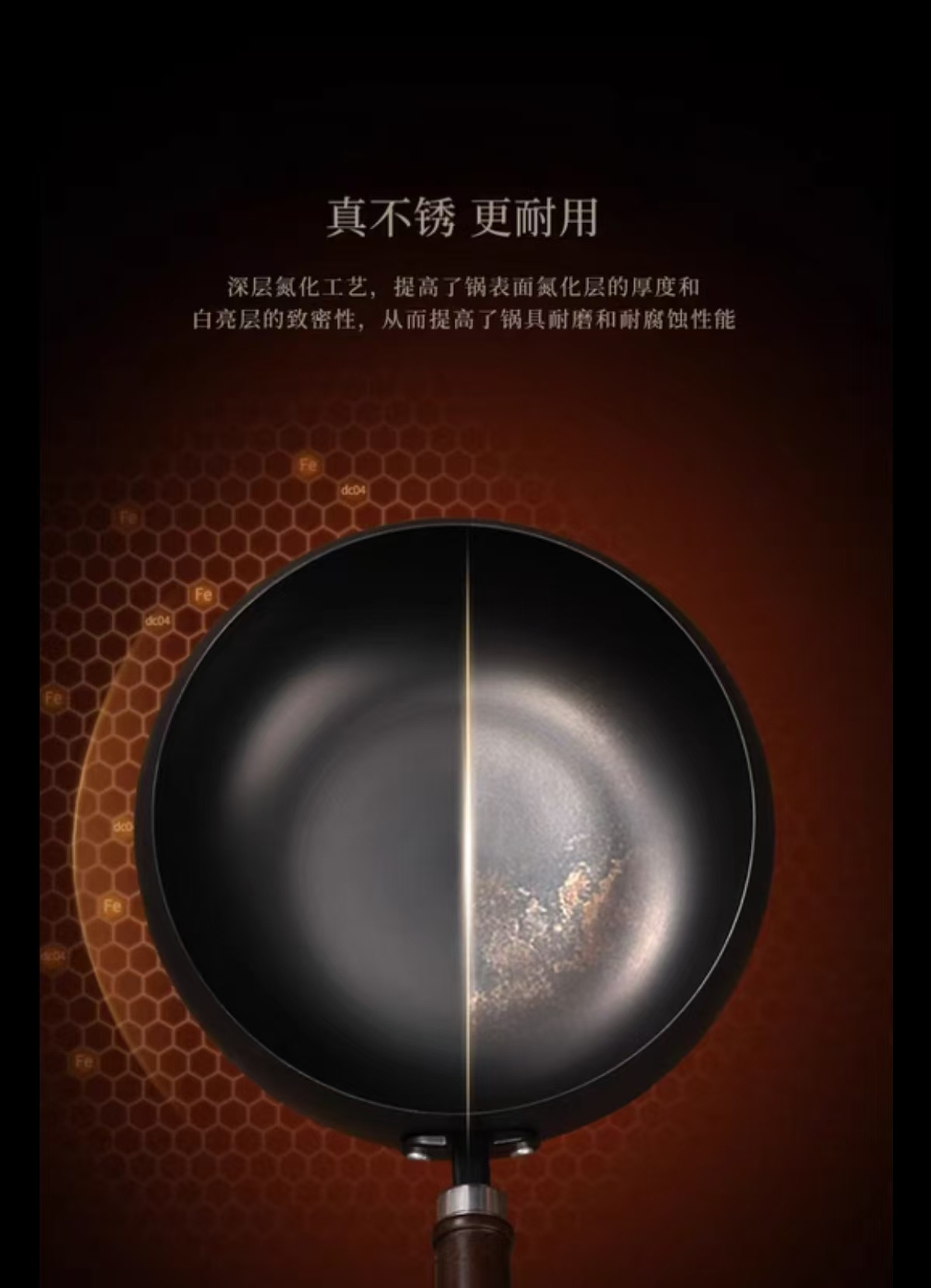 ✅ 无涂层窒化工艺,碳氮共渗,无化学涂层,物理不粘,开锅后越用越丝滑,一擦即净