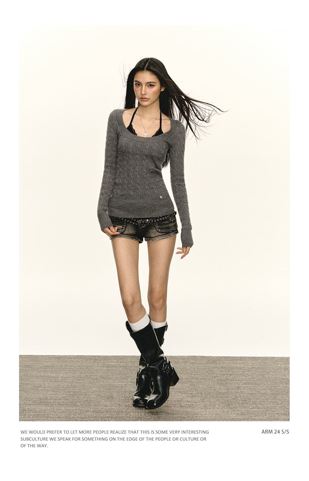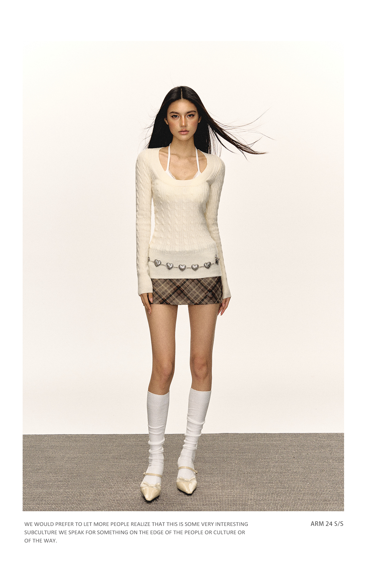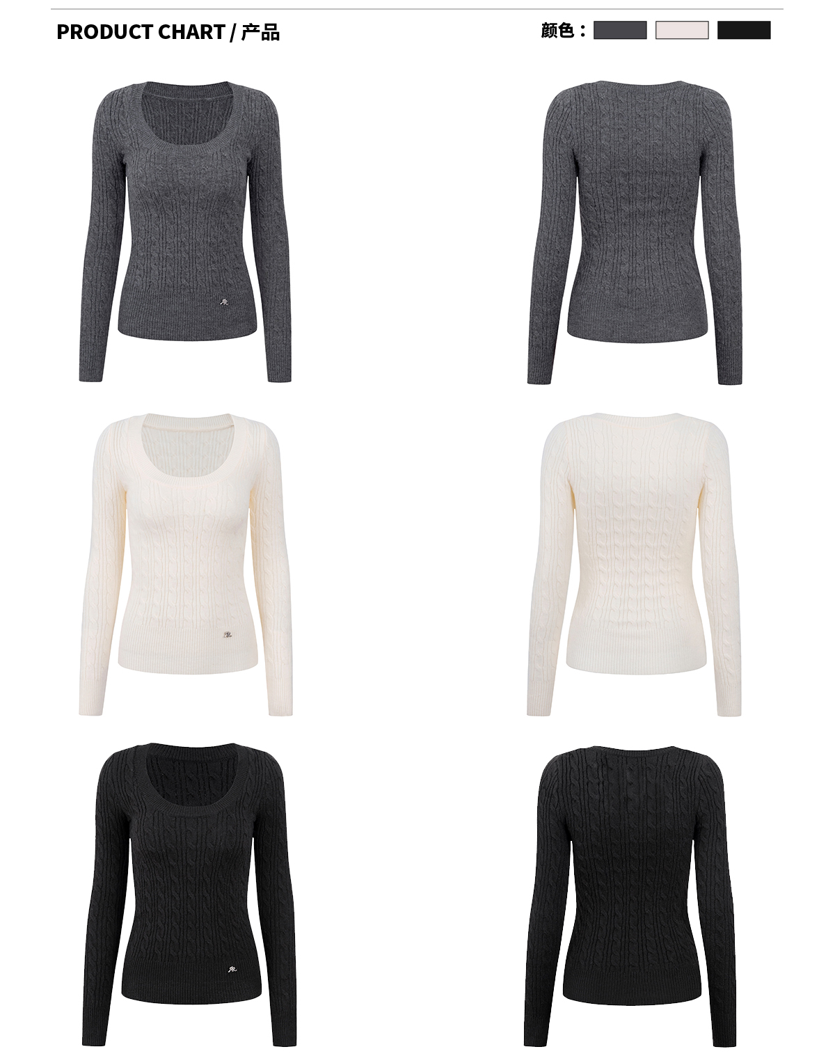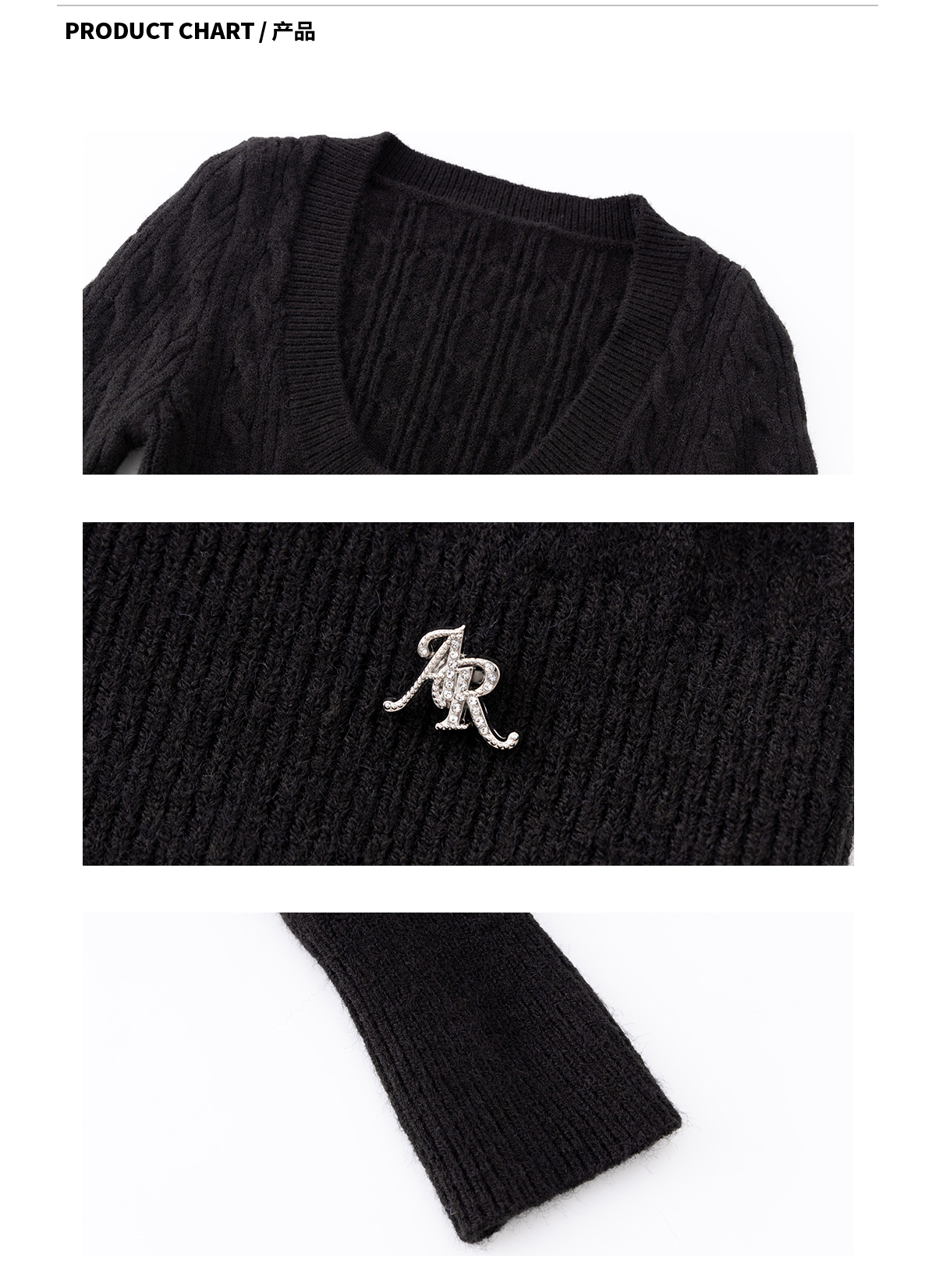 Ariseism 美式复古设计感绞花圆领修身长袖针织衫女春季新款毛衣