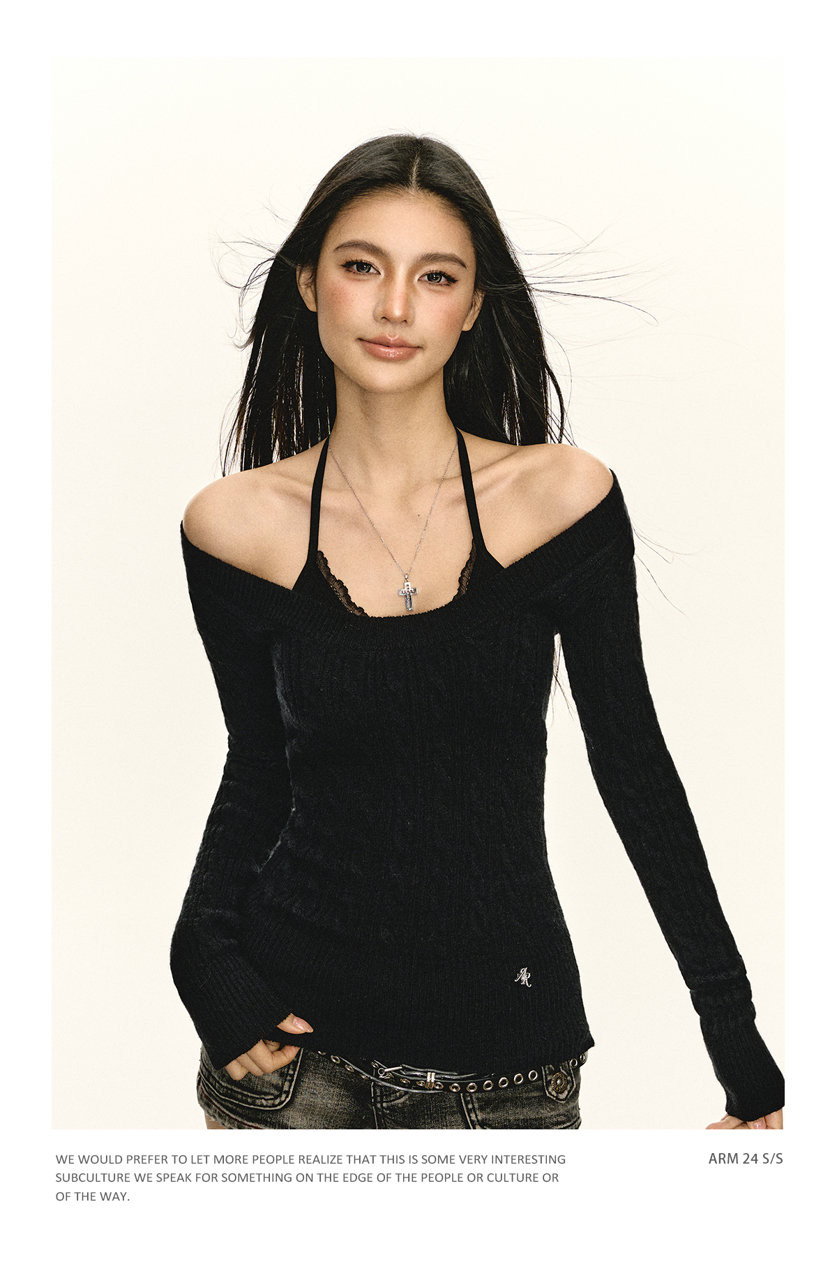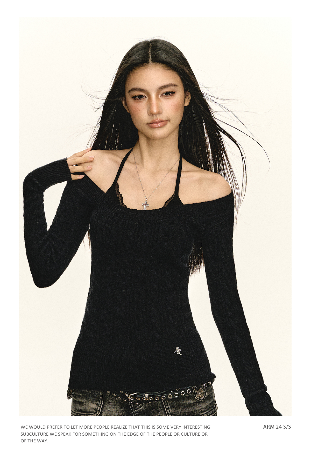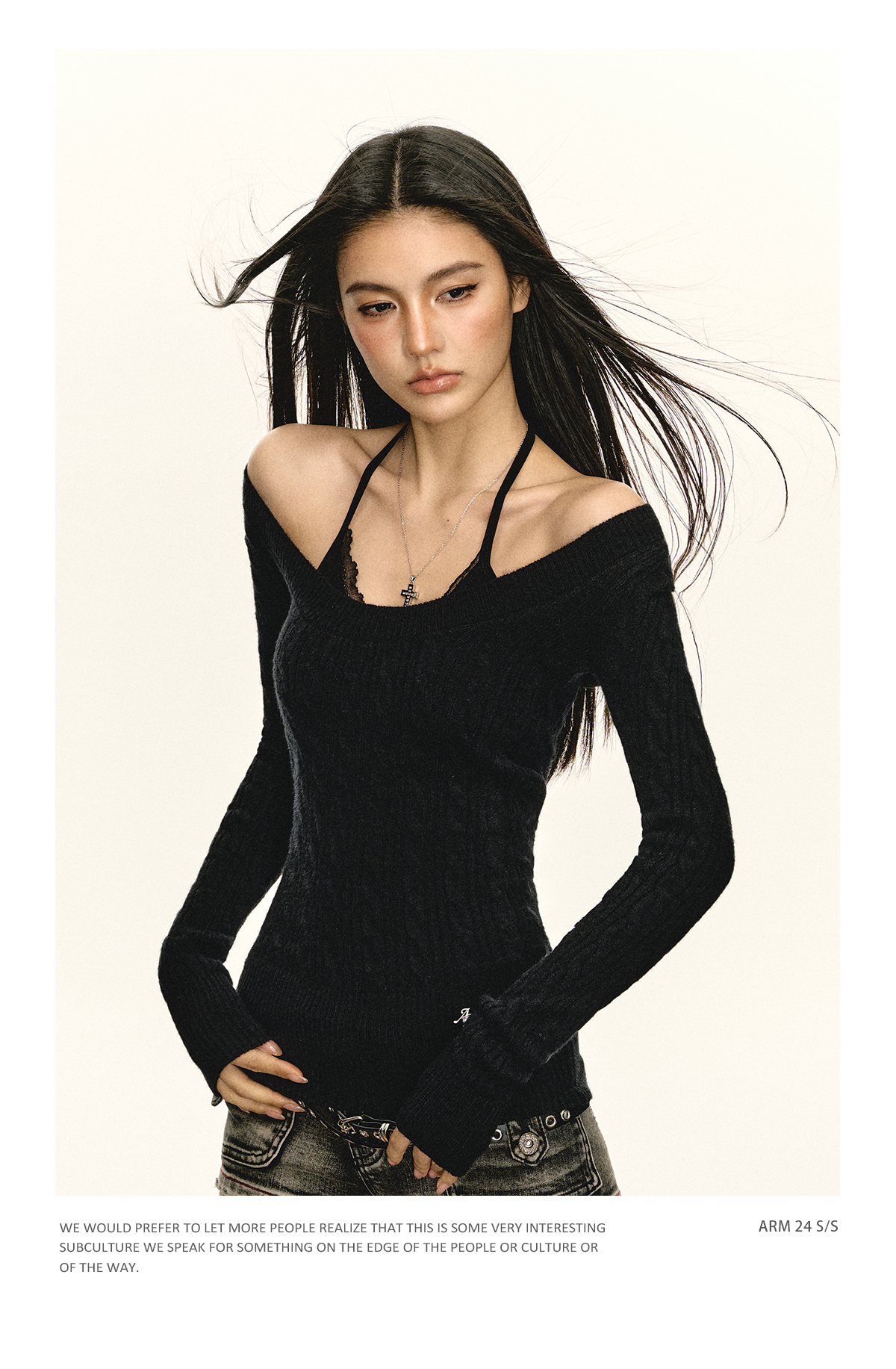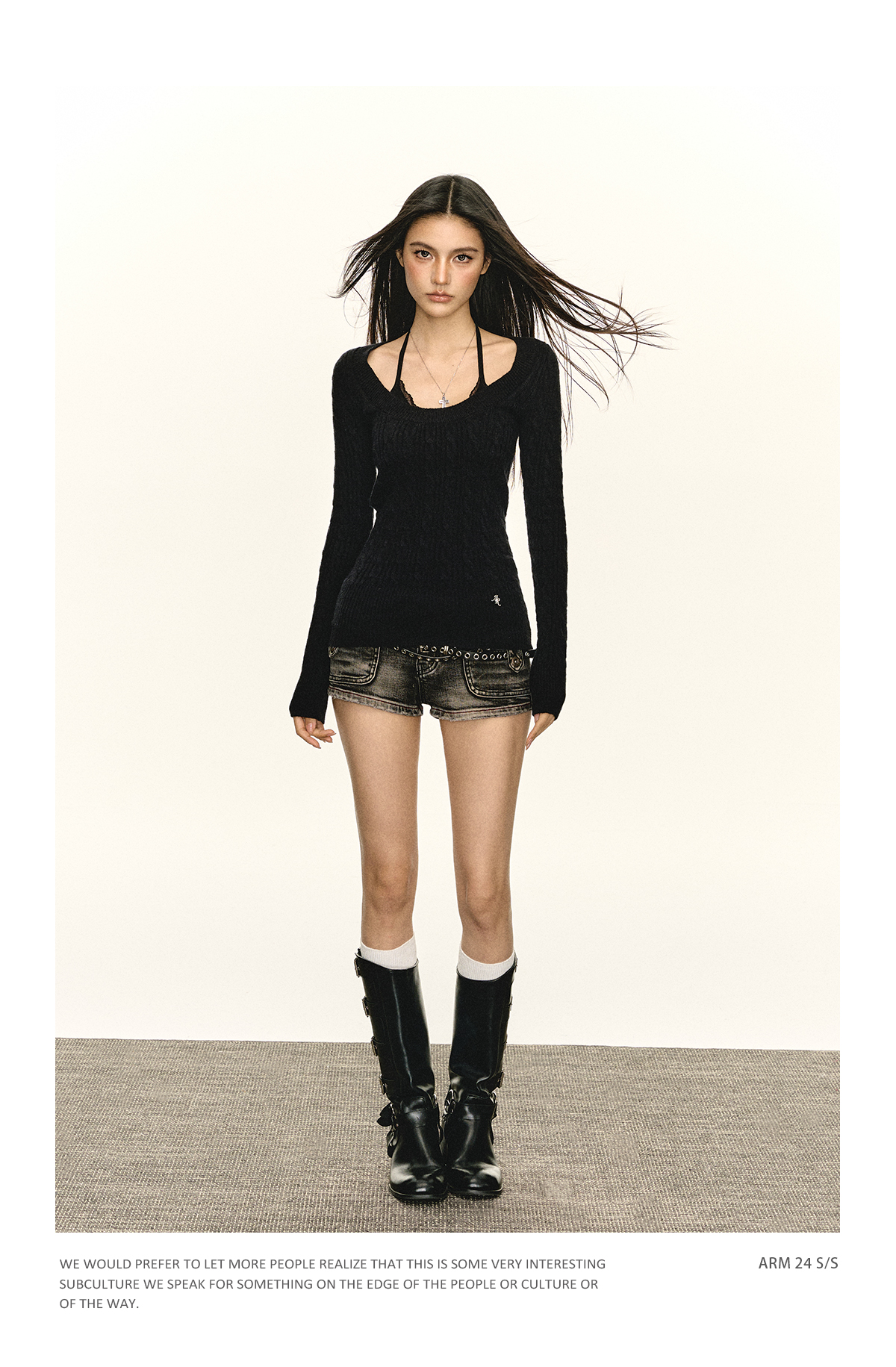 Ariseism 美式复古设计感绞花圆领修身长袖针织衫女春季新款毛衣