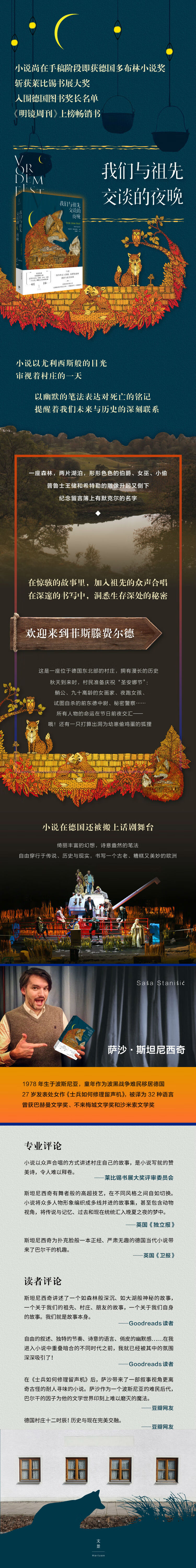 作者:萨沙·斯坦尼西奇(Sa?a Stani?i?),1978年生于波斯尼亚,14岁时作为波黑战争难民移居德国,用德语写作。现居汉堡。2005年发表处女作《士兵如何修理留声机》,获英格博·巴赫曼文学奖“读者喜爱作品奖”。2014年出版《我们与祖先交谈的夜晚》,登上《明镜周刊》畅销书排行榜,获2014年莱比锡书展大奖,入围德国图书奖长名单。