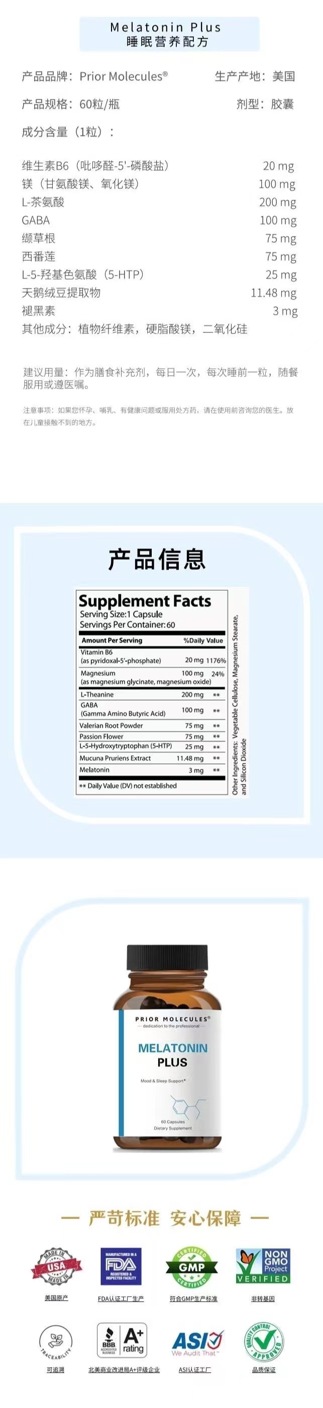 Prior Molecules 睡眠营养配方 MELATONIN PLUS 60粒/瓶 09/26