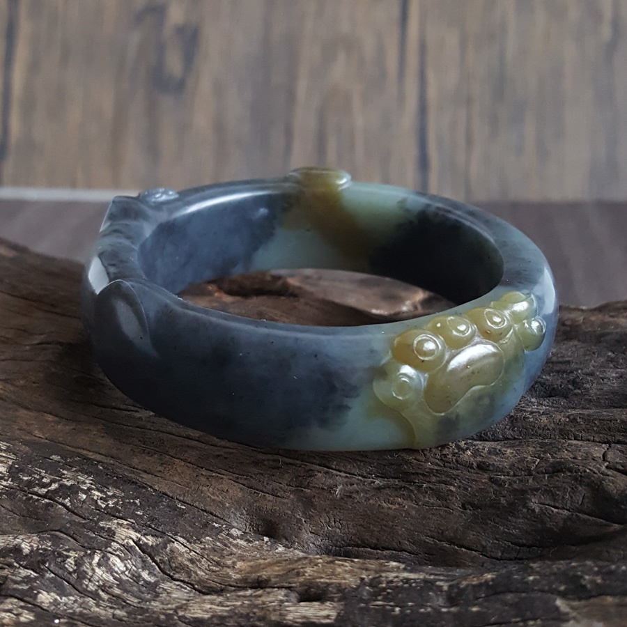 名称 | 天然精品无杂裂青花籽料梅花猫咪凤系造型54号厚桩和田玉手镯 |