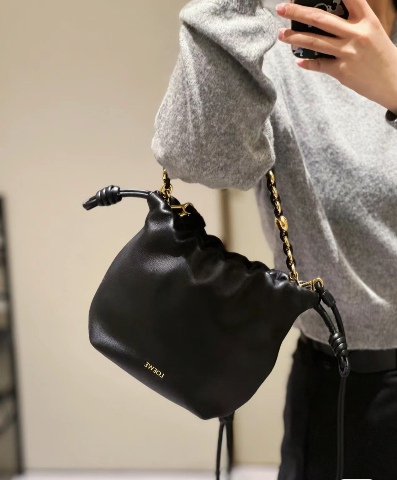 LO℮w℮迷你柔软纳帕羊皮革 Flamenco Purse 福袋 采用褶皱设计,侧面搭配标志性绳结等关键细节。款式时尚百搭,可作为手拿包携带,亦可搭配甜甜圈链条肩背,或搭配皮革肩带斜挎