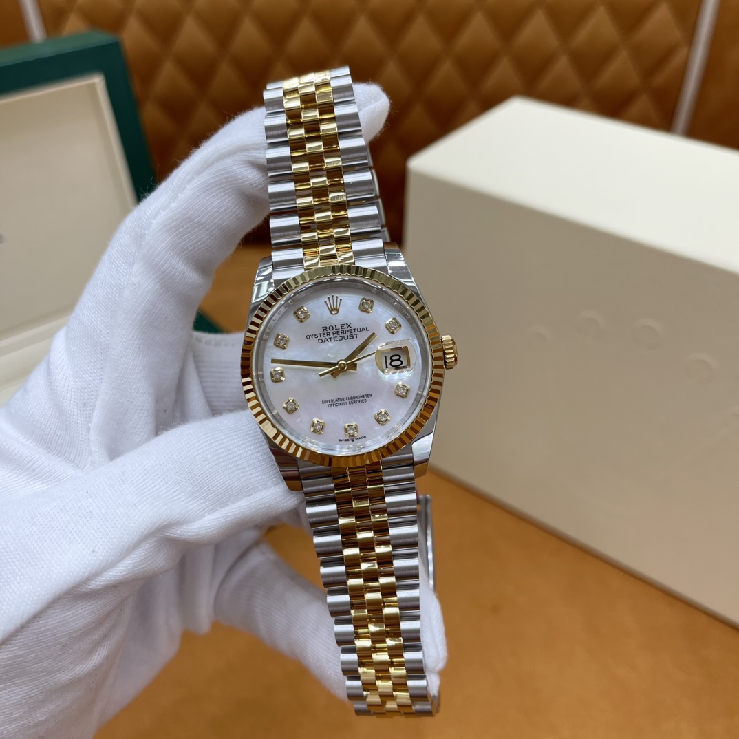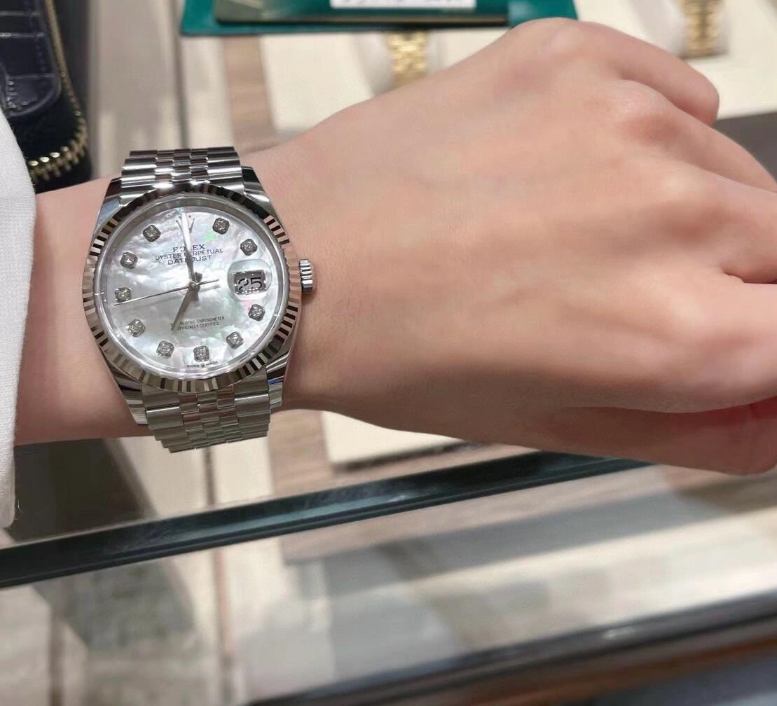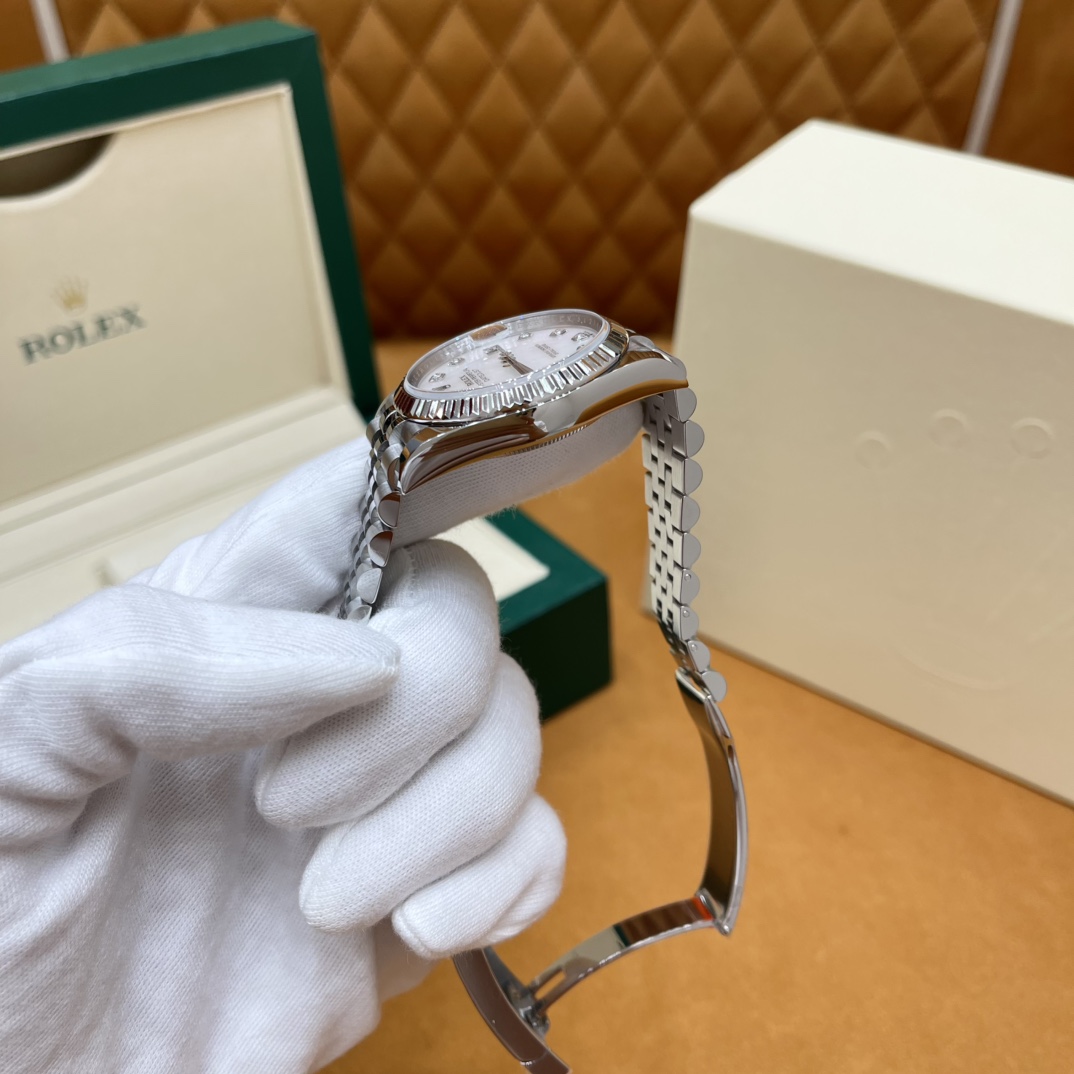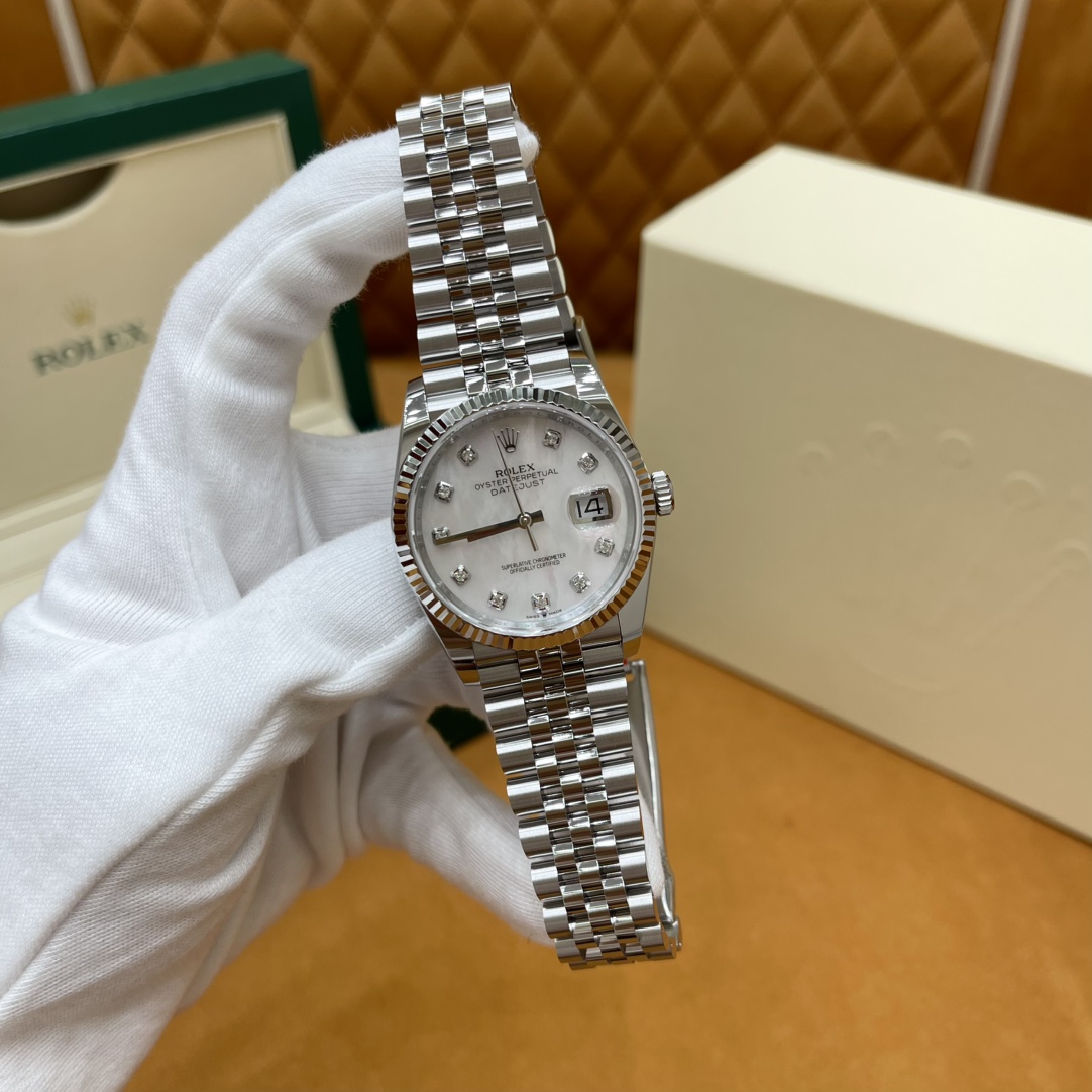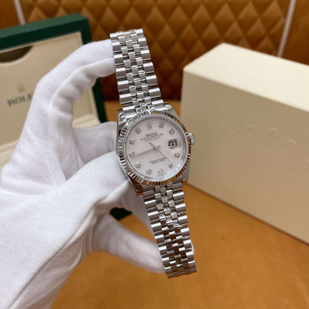 🏷️日志型系列m126233-0023 采用原版定制3235自动机械机芯,厚度宽度一致☑️机芯全面体现劳力士的创新技术,在精准可靠、动力储备、抗震防磁以及方便使用等方面,做了进一步的提升。 蚝式钢表壳搭配白珍珠母盘钻石刻度,表壳及表耳两侧折射出淡雅光泽,令36毫米蚝式表壳的轮廓更突出,倍添魅力。 表带质感拉满,推拉顺滑,高难度的龟壳外观开启方式轻易,锁扣紧密,戴起来非常踏实! 对版的日历字体,防反光凸透式放大日历窗,每个数字打磨精细,方便查看~ 尺寸:36mm