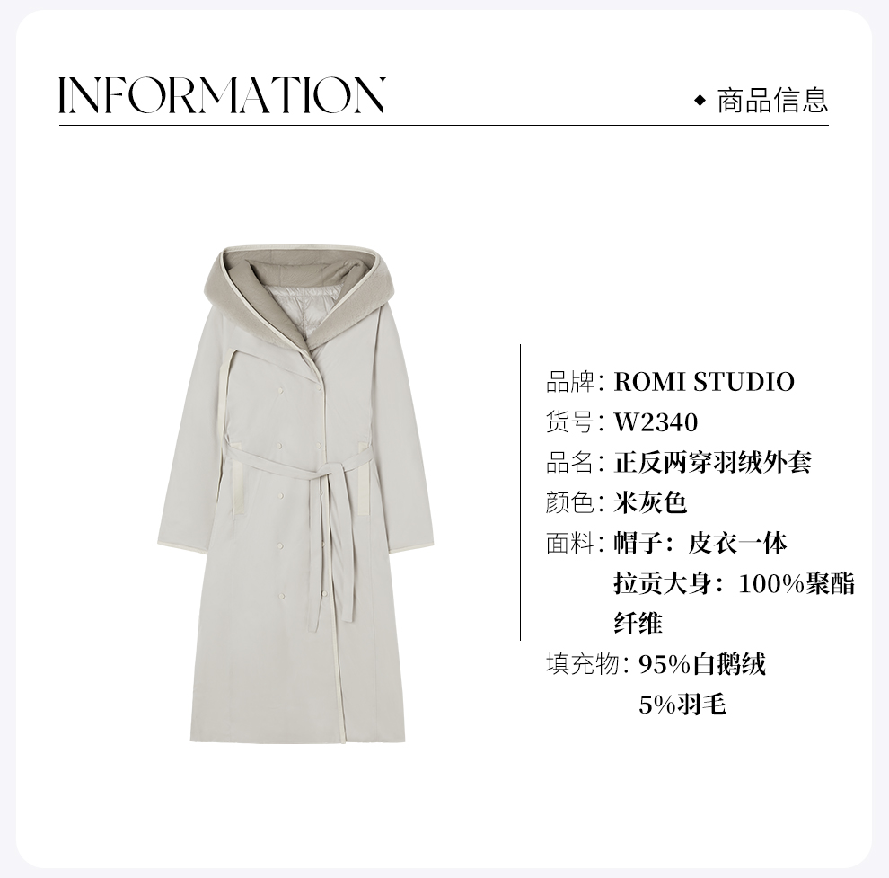 ROMI STUDIO北海道超轻白鹅绒正反两穿中长款羽绒外套 W2340