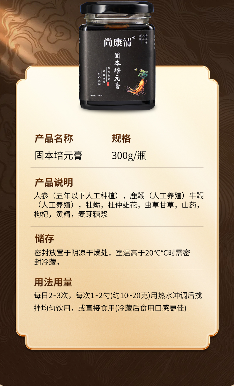 尚康清固元膏只要是针对男性研发的膏滋产品,主要适用于肾虚、性功能和性欲低下的成年男人,然而由于多成分的协同作用,因此也适用于体质虚弱、免疫力低下、气血不足等人群服用。