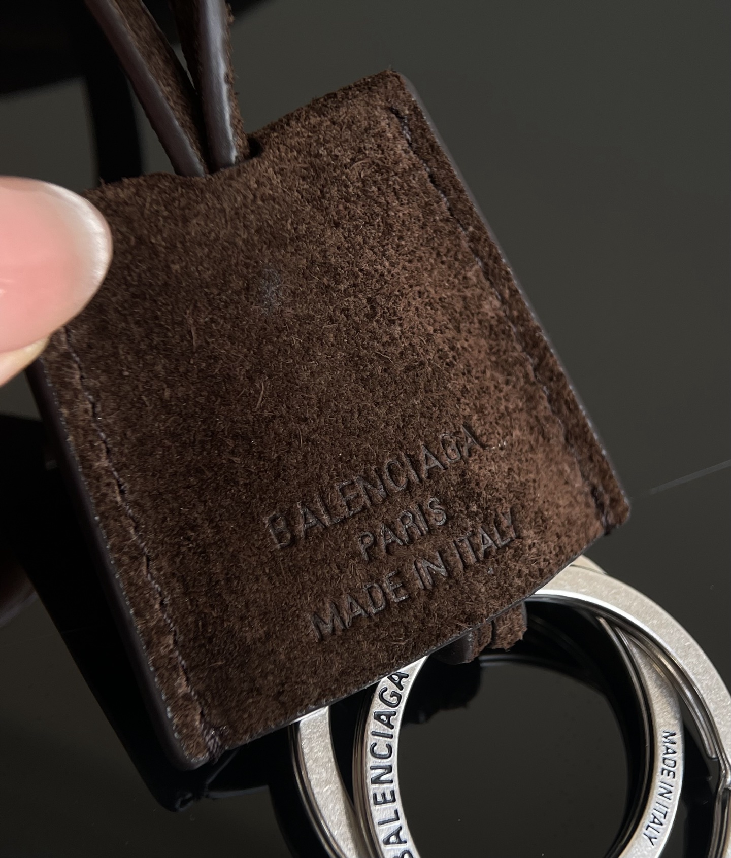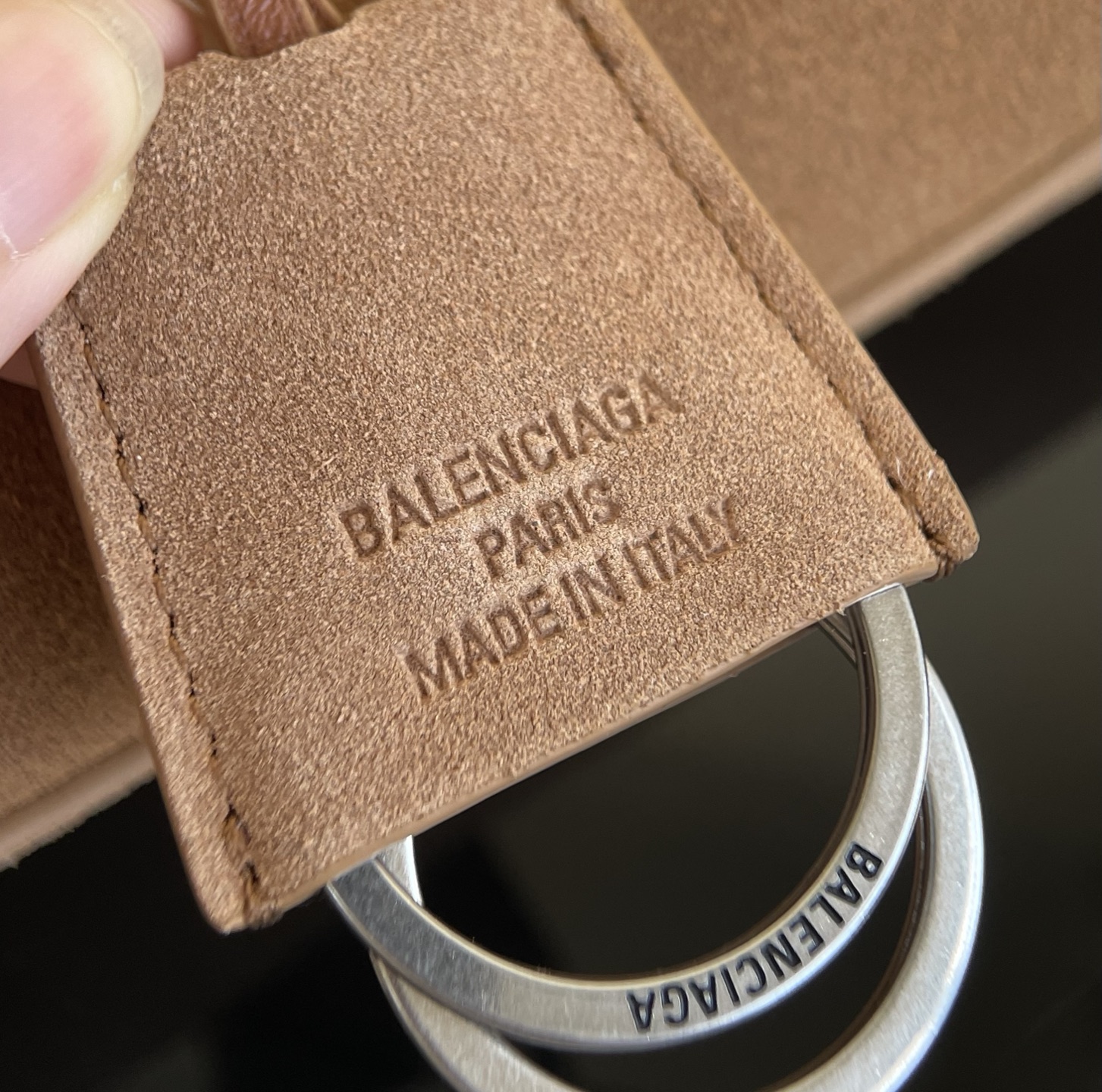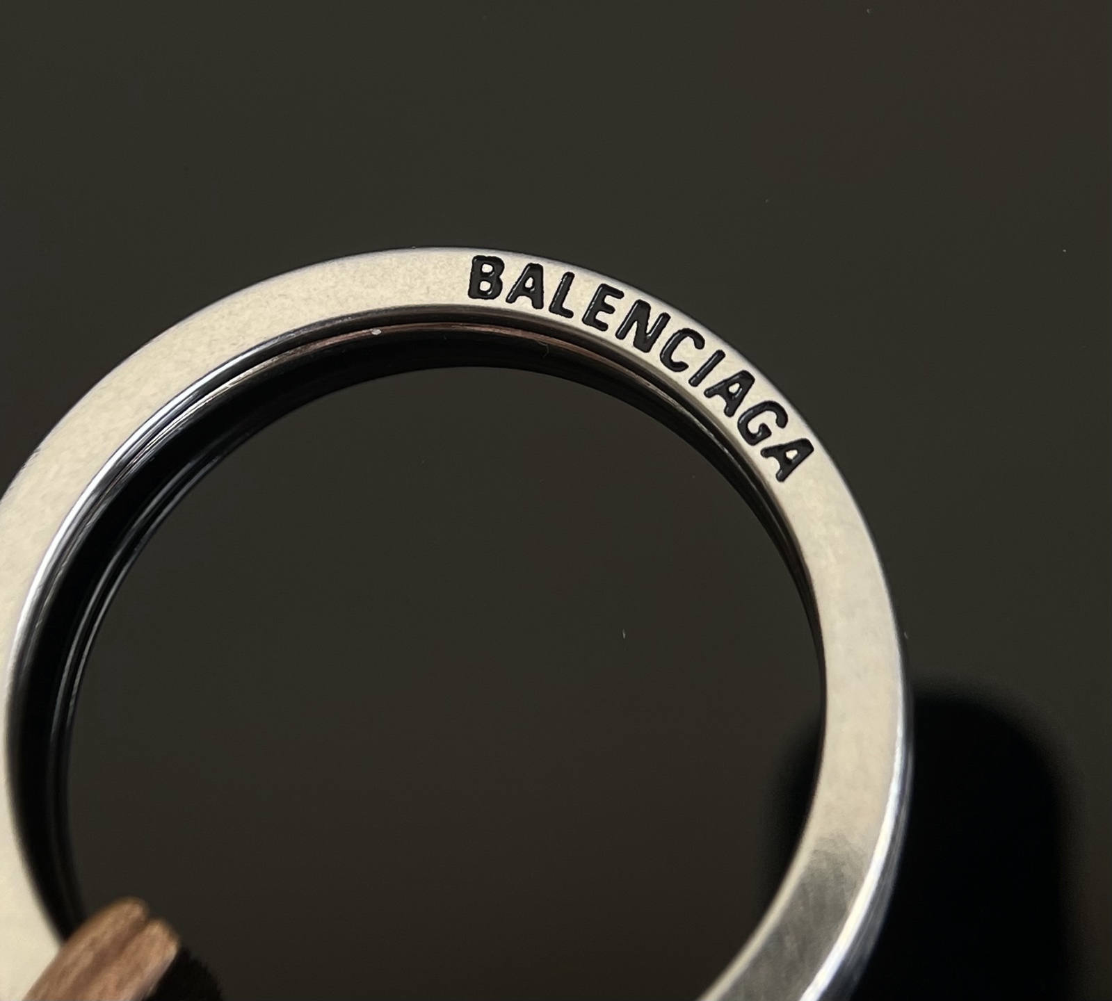 钥匙环五金细节,两组刻字 非常精美,字体清晰流畅,边缘干净整齐没有毛刺。