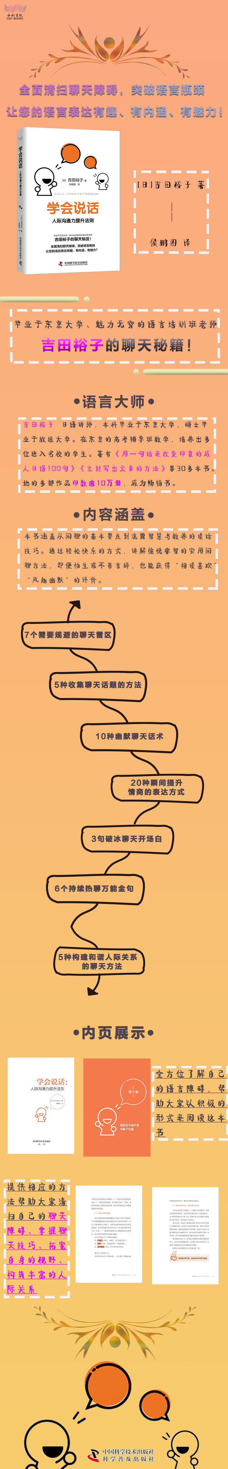 7个需要规避的聊天雷区; 5种收集聊天话题的方法; 10种幽默聊天话术; 20种瞬间提升情商的表达方式 ; 3句破冰聊天开场白; 6个持续热聊万能金句; 5种构建和谐人际关系的聊天方法; 26道自测题,全方位了解自己的语言障碍,帮助大家以积极的形式来阅读这本书,并提供相应的方法帮助大家清扫自己的聊天障碍、掌握聊天技巧、拓宽自身的视野、构筑丰富的人际关系。