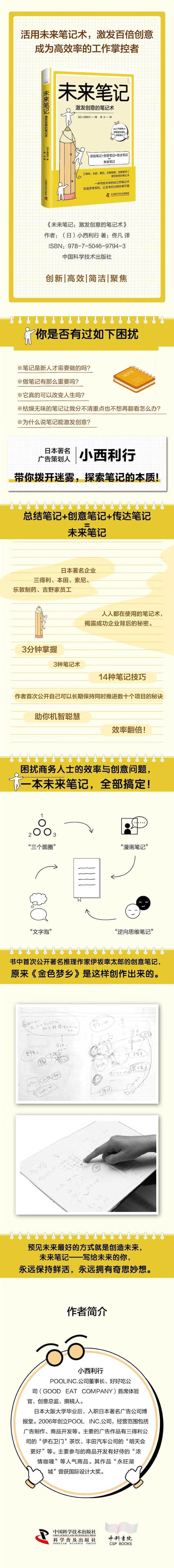 ★日本畅销书作者、Z名广告策划人小西利行力作,带你进入未来笔记的世界,给你创造思考的契机,让你在不知不觉中发现创意,助你写出成功的策划案。 ★日本Z名企业三得利、本田、索尼、乐敦制药、吉野家员工人人都在用的笔记术,揭露成功企业背后的秘密。 ★3种笔记术、14种笔记技巧,作者首次公开自己可以长期保持同时推进数十个项目,工作效率超高并总能获得超出预想的工作效果的诀窍。